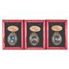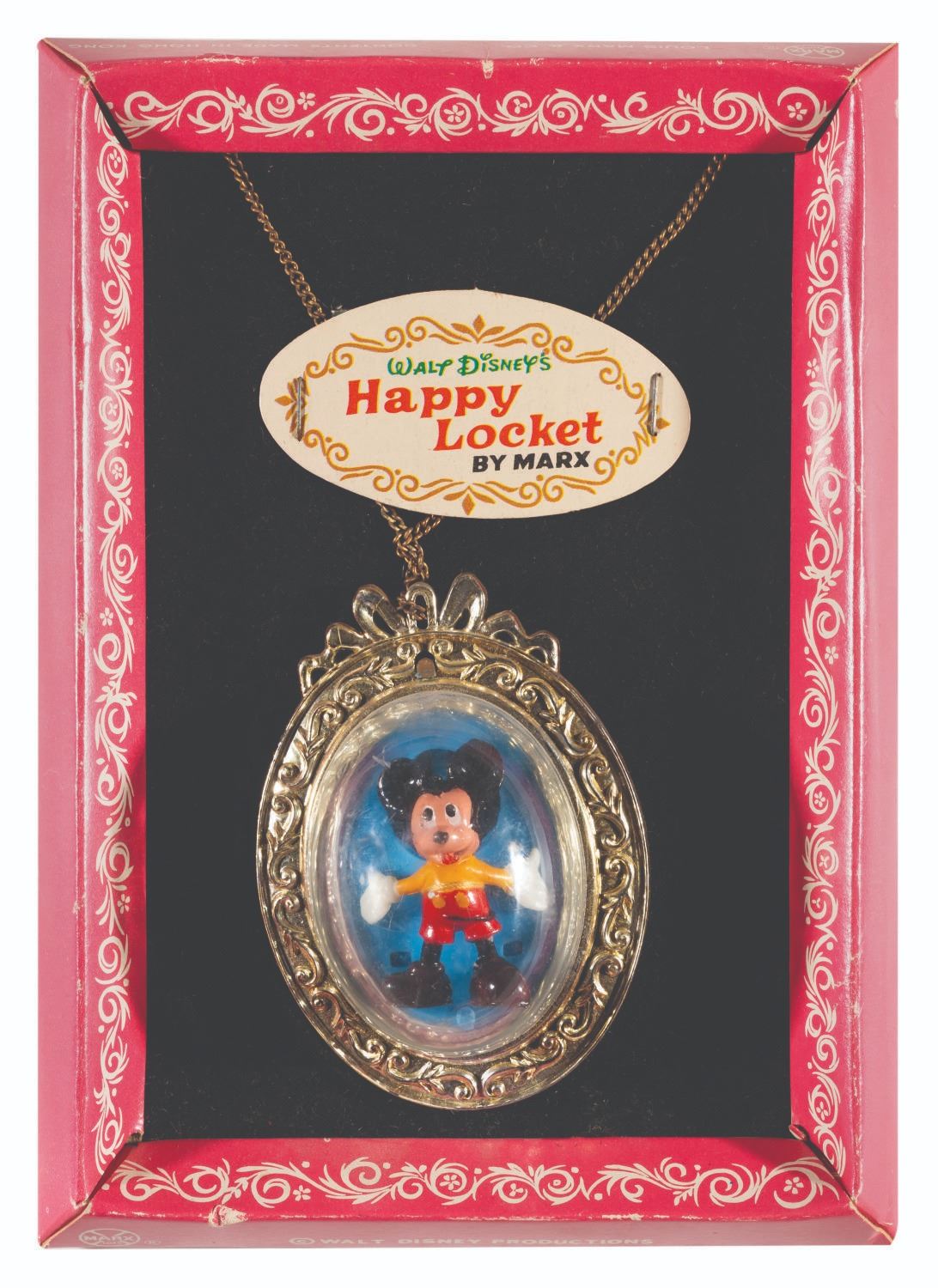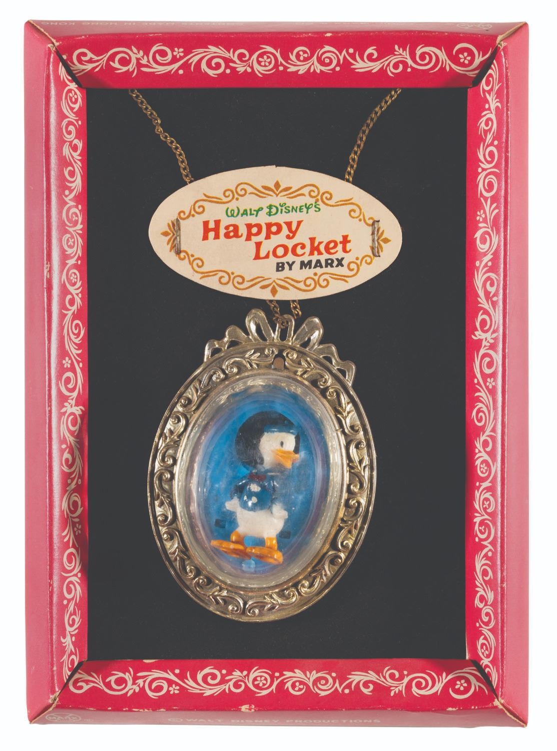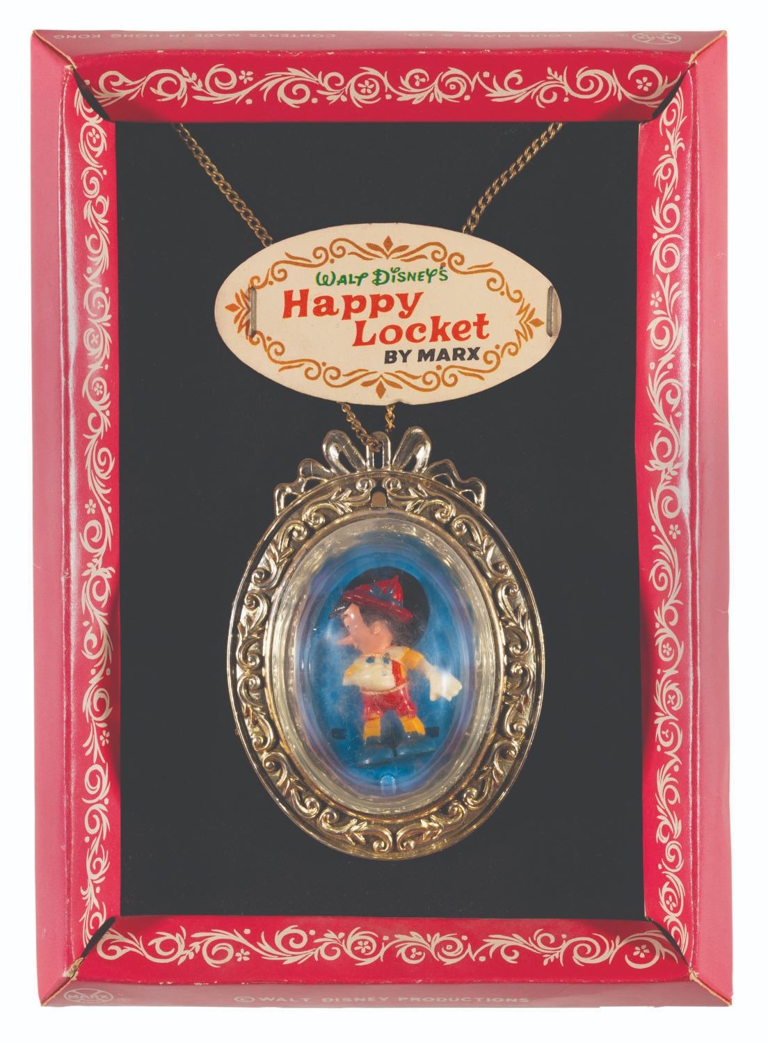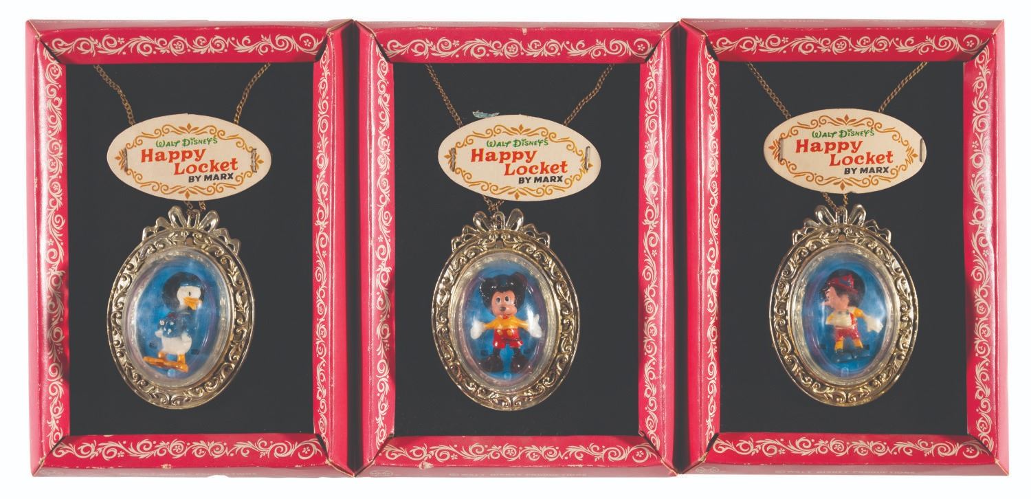 (MARX Toys, 1968) A rare set of three MARX Happy Lockets on their original cards. The lockets feature Mickey, Donald, and Pinocchio Disneykins. The back of each card features color images of the four other available Happy Lockets. Measuring 3"x2.25"x1.25" on a 5"x7"x.75" card, the pieces and cards are in very good condition with light wear, faint creases, minor scuffs, and expected fading from age.