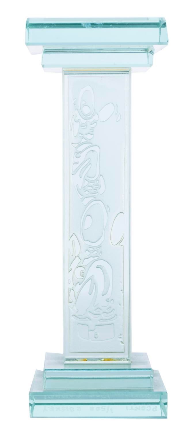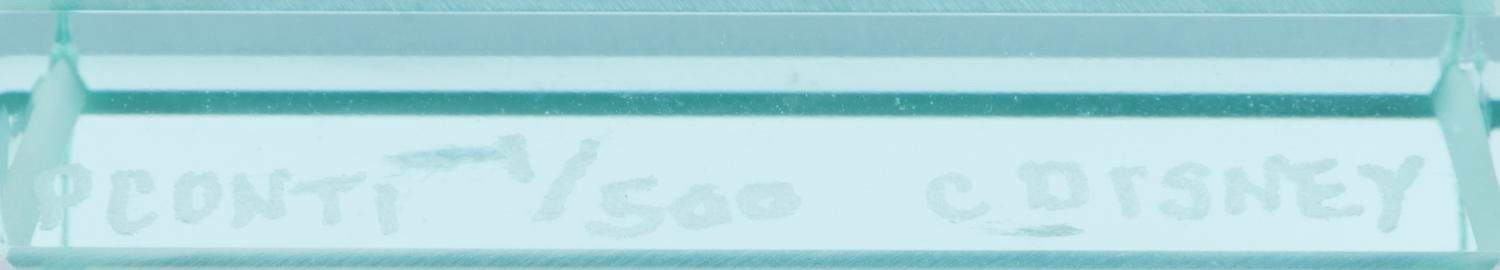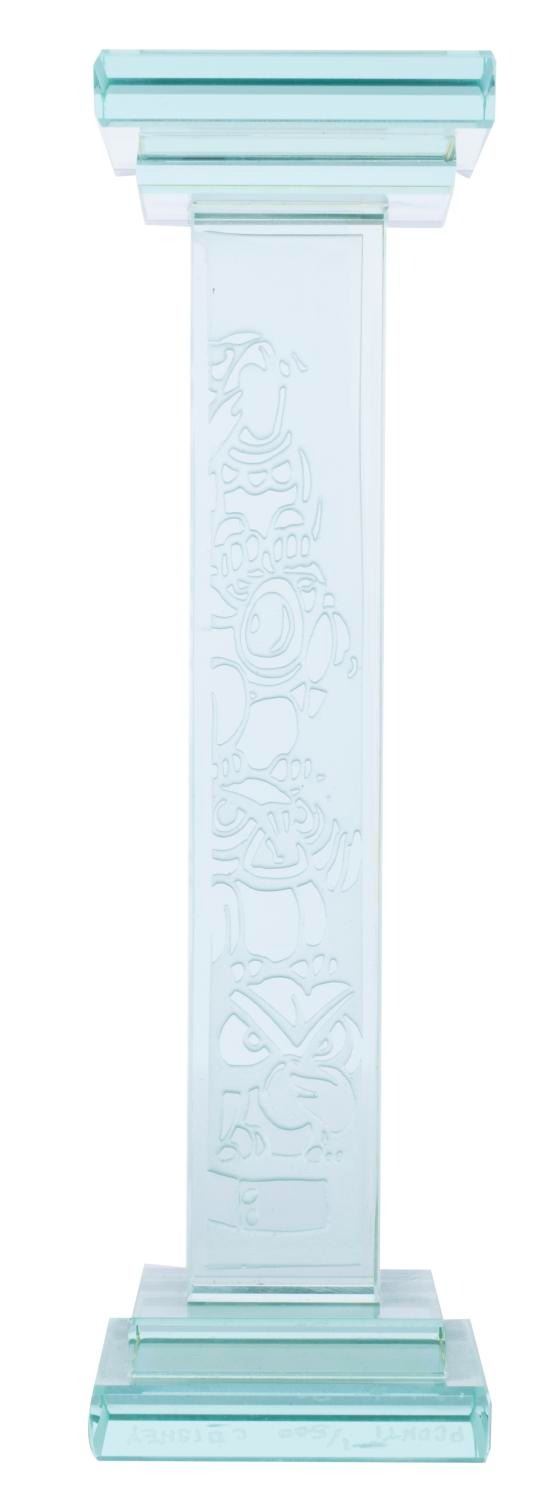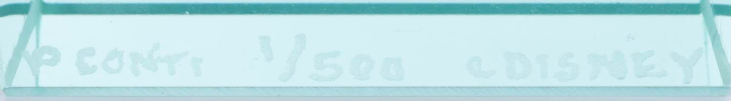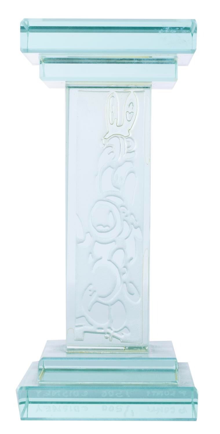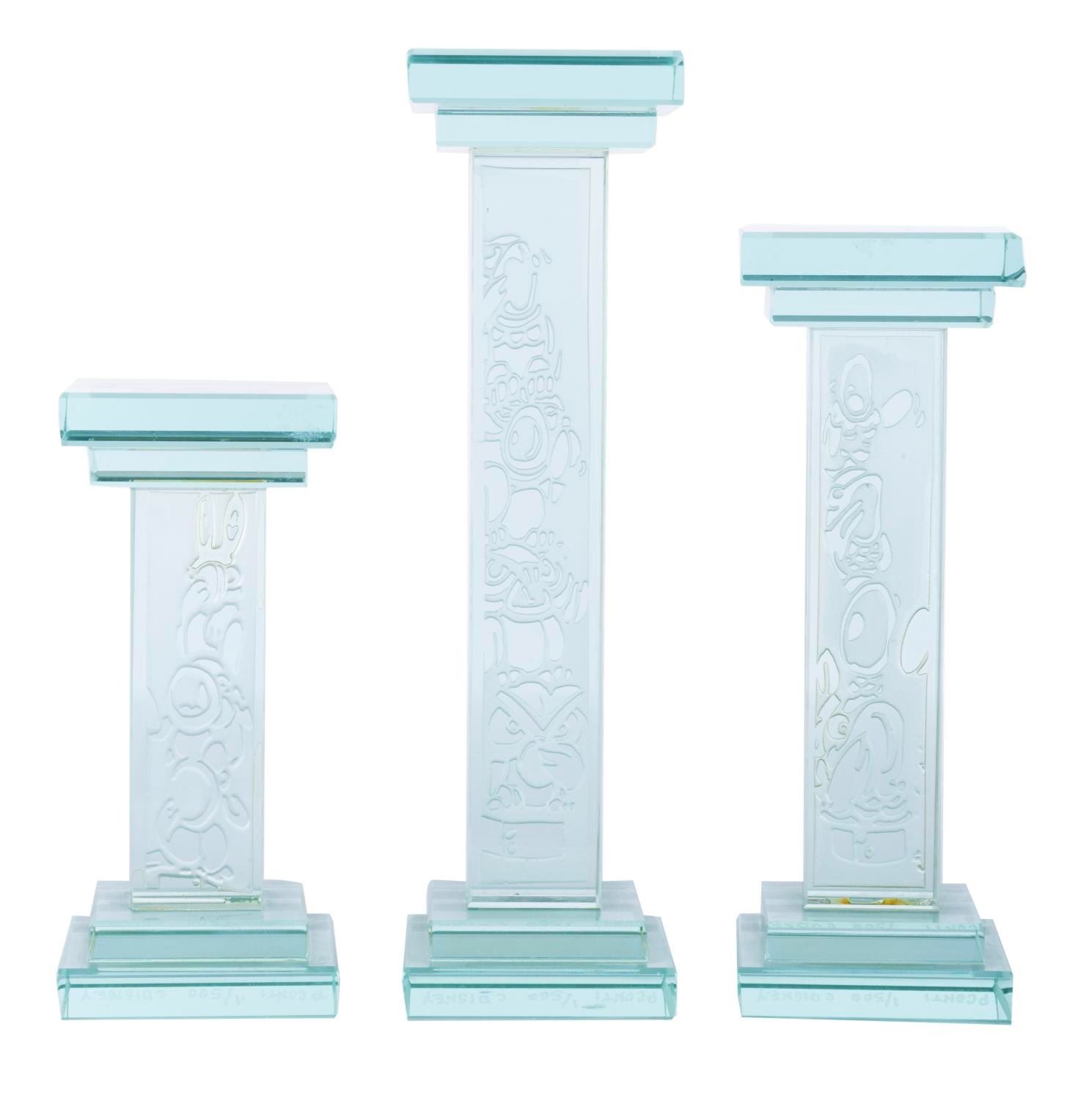 (Conti, 1990s) A set of three Snow White etched glass Plinths inspired by the Seven Dwarfs' Pipe Organ. Numbered "1/500" this is the only set we have ever encountered. Measuring 5.75", 7.75", and 8.75" tall, each 2.5" square piece is in very good condition exhibiting faint scuffs.