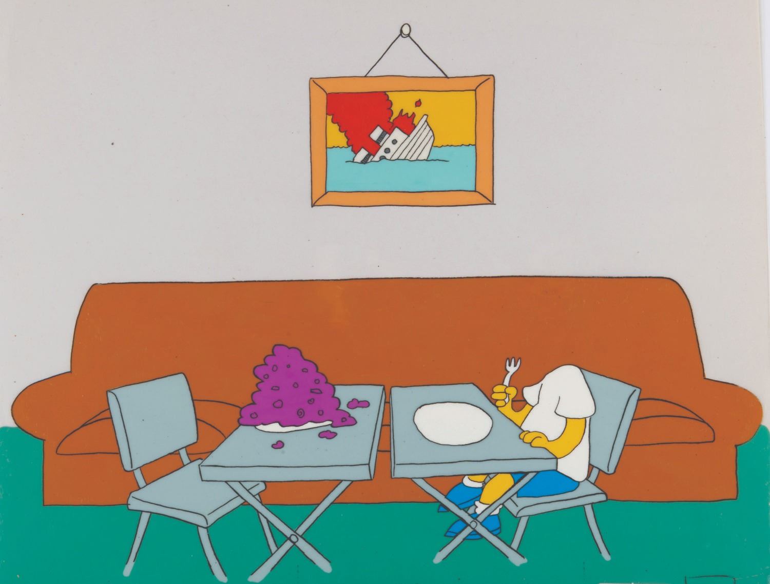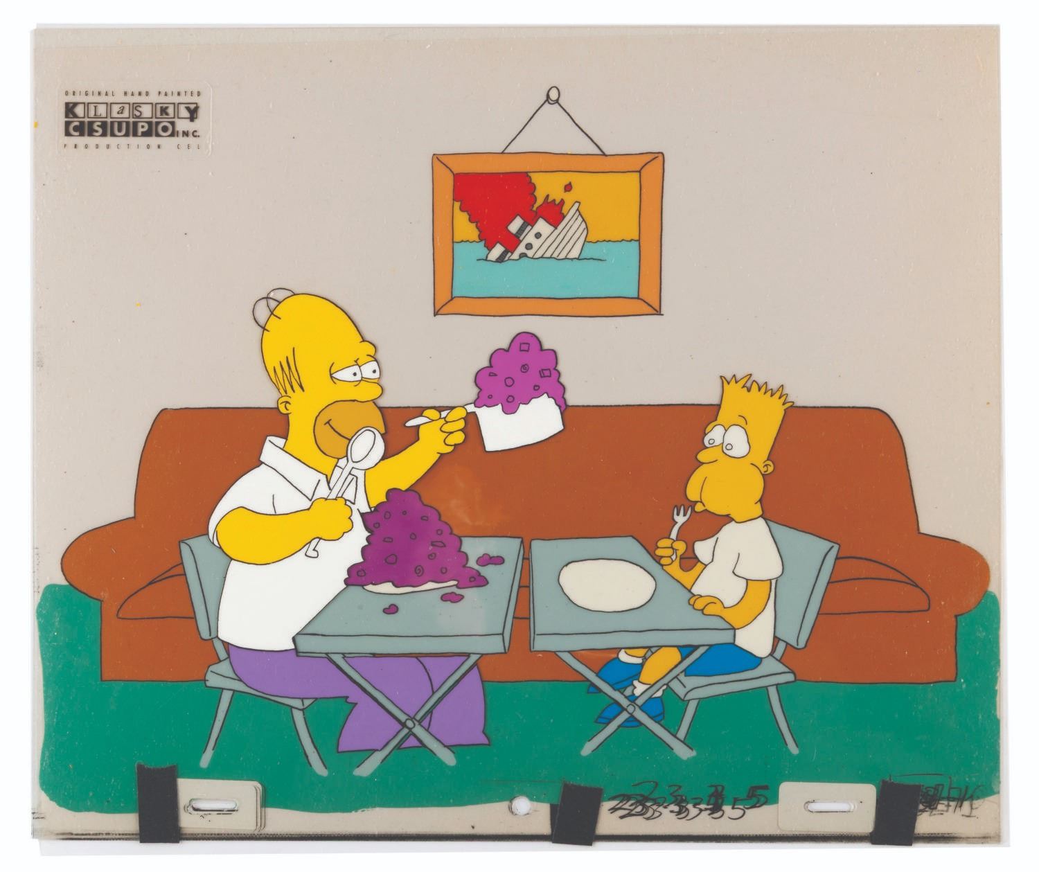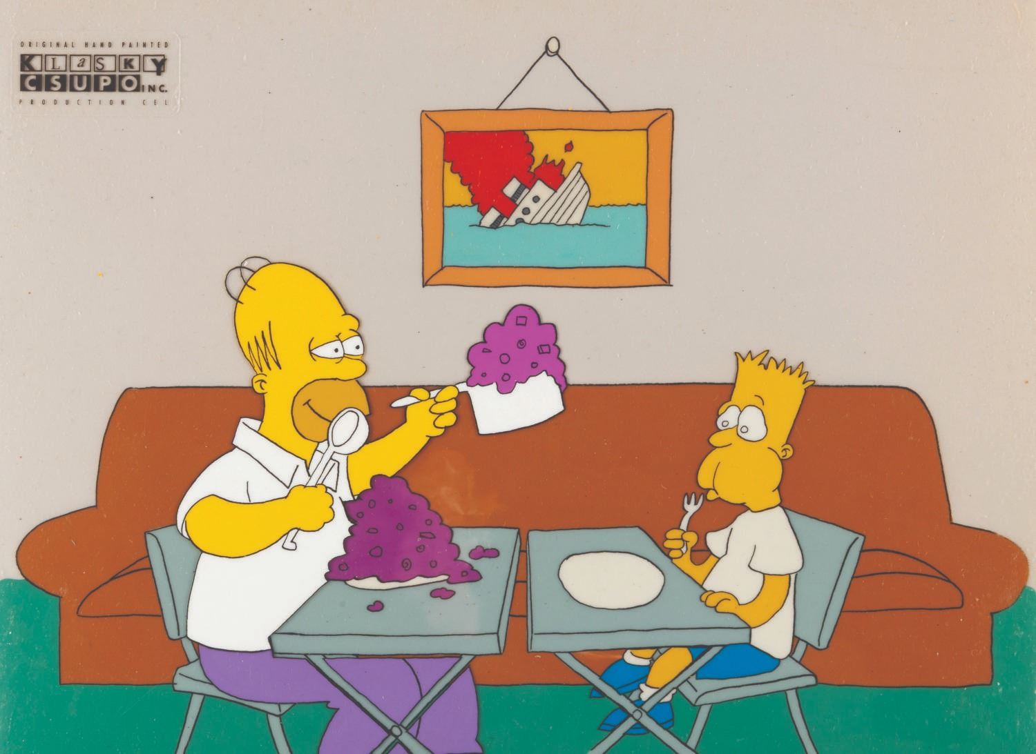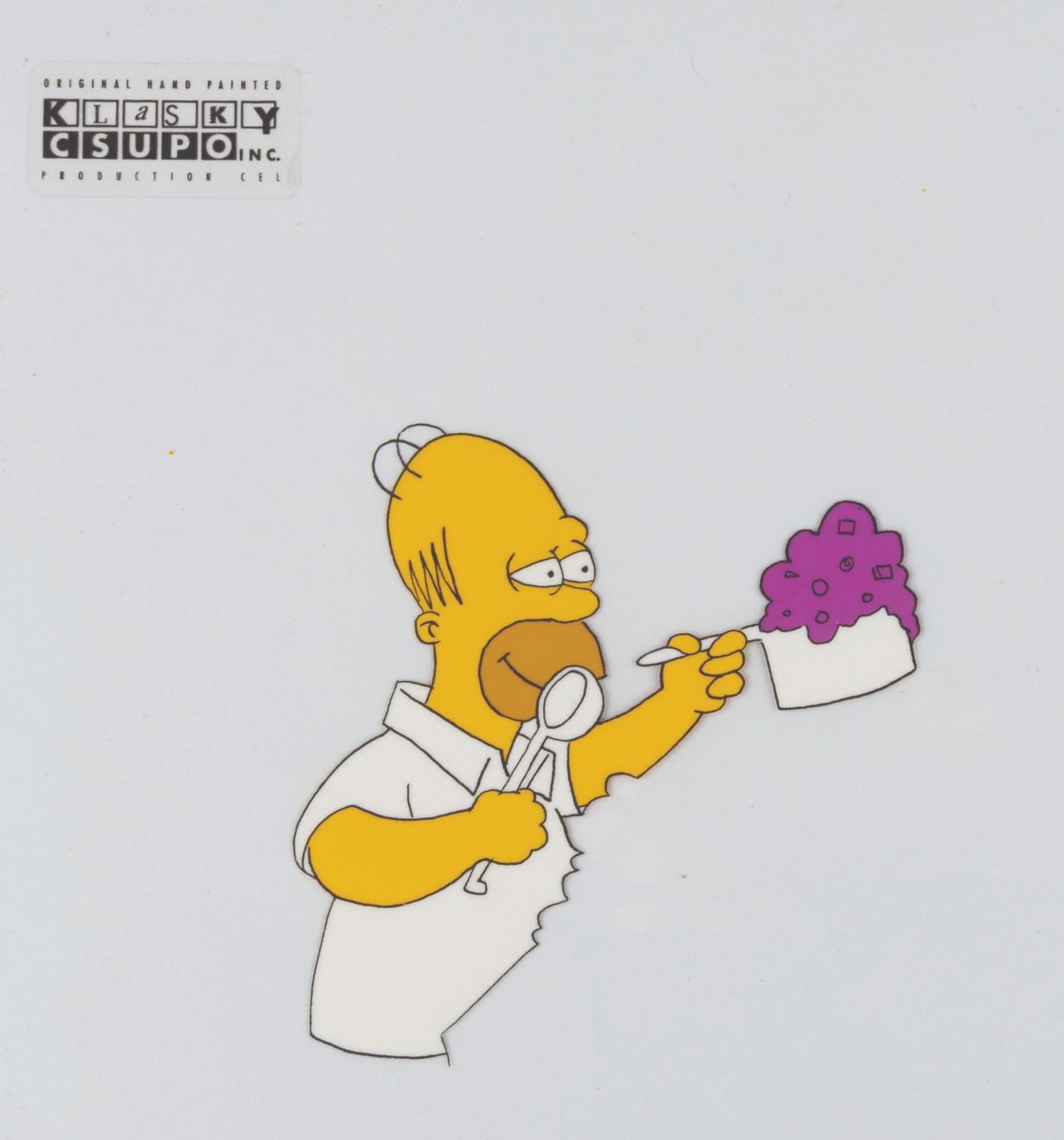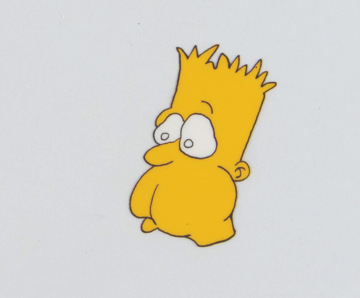 (20th Century Fox, 1987) A very rare multi-layer production cel of Bart and Homer Simpson from the short "Bart and Dad Eat Dinner," which aired during Season 2 of "The Tracey Ullman Show." Created for the comedienne's sketch comedy show in 1987 by Klasky-Csupo Inc., The Simpsons proved so popular that they were spun off into their own series, which debuted in December 1989 and became the longest-running American animated series of all time. Production cels from the original Ullman Simpsons shorts are extremely hard to come by, and this is one of the few complete setups we have ever seen available. The cel maintains its original Klasky-Csupo Inc. sticker and has an image size of 9.5" x 12.5" on 10.5" x 12.5" cels. The piece is paired with an off-white paper background and displays in very good condition with scratches and wear from production use.