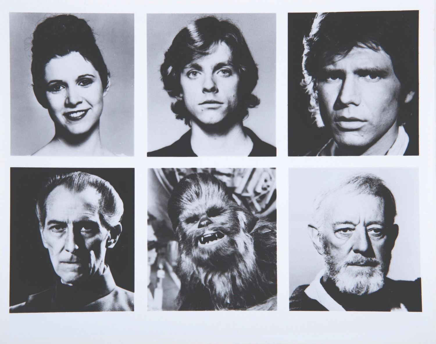 (20th Century Fox, 1977-1990s) A rare 6-Up press photo from the original release of Star Wars (A New Hope). While an example of this print is found with title and copyright strip on the bottom, this print was made without. Images include Leia, Luke, Han Solo, Tarkin, Chewbacca, and Obi-Wan. Measuring 8"x10", the photo is in very good condition.