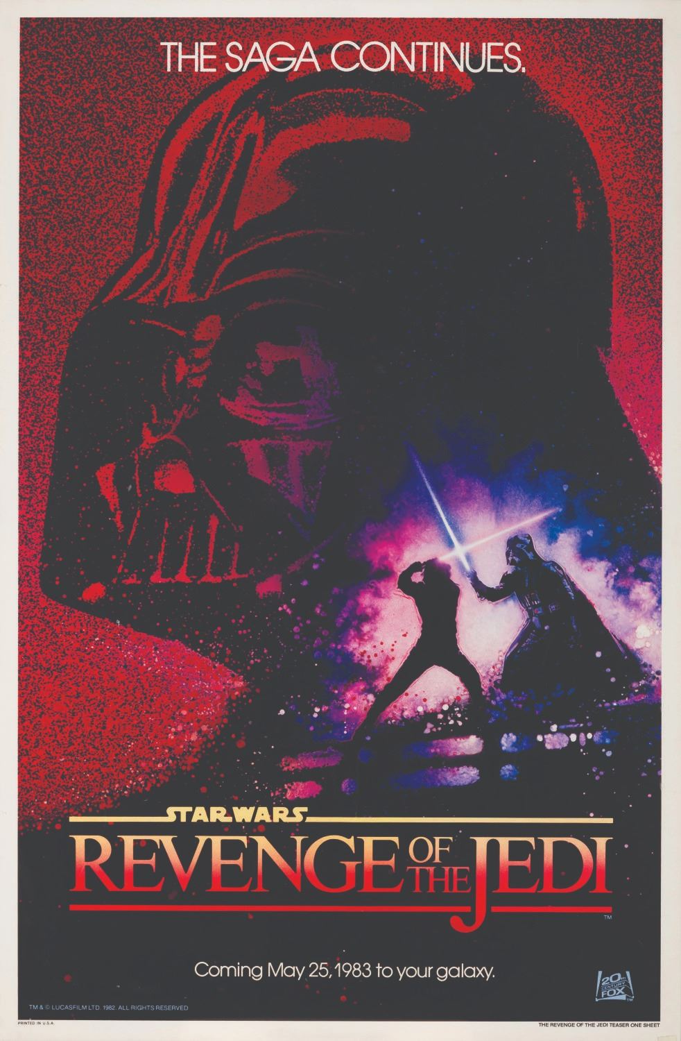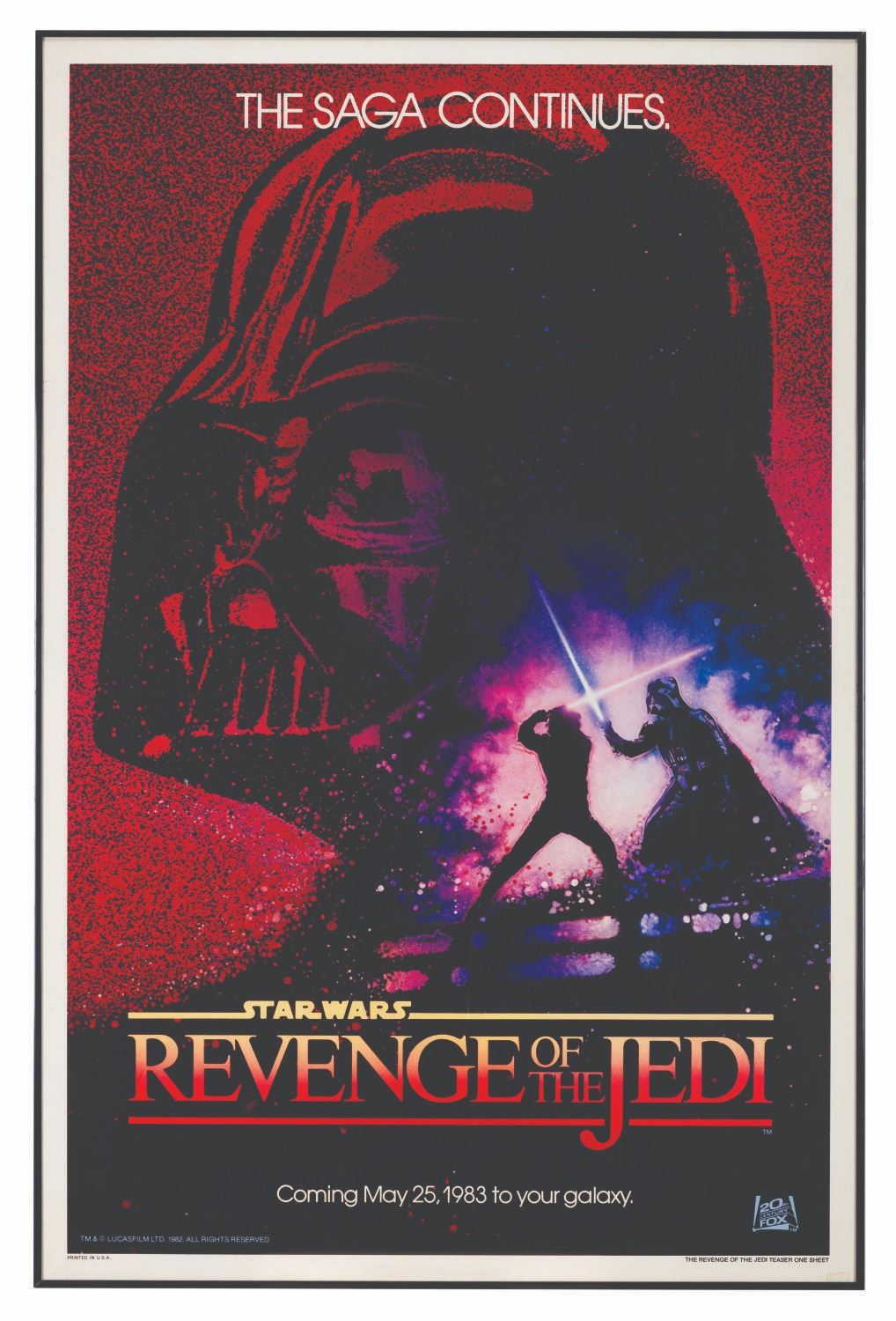 (20th Century Fox, 1982) A rare teaser one-sheet for "Star Wars: Revenge of the Jedi," the original title of "Return of the Jedi." Despite the teaser trailer and poster already released featuring the word "Revenge," George Lucas decided that a Jedi should not seek revenge and changed the title to "Return of the Jedi." Measuring 27" x 41" and 27.25" x 41.25" total including the frame, the poster is dry mounted on foamboard and is in very good condition with creases, wear, light discoloration from age, and tape at the bottom right edge, which does not affect the image. The frame is in good condition with scuffs, scratches, and wear.