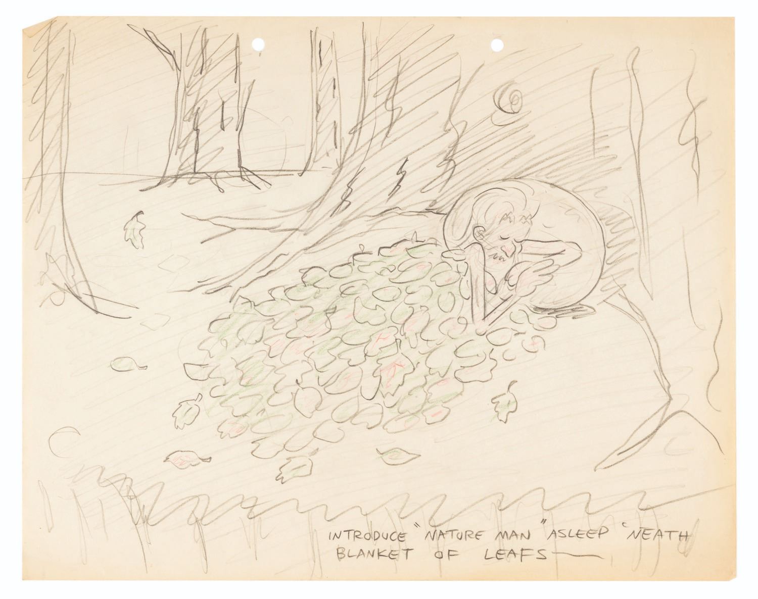 (Schlesinger, 1930s) An original story drawing of “Nature Man” asleep in the woods under a blanket of leaves from an unproduced Leon Schlesinger short. Measuring 9.5” x 12”, the graphite drawing displays in very good condition with light creases, corner folds, and discoloration from age.