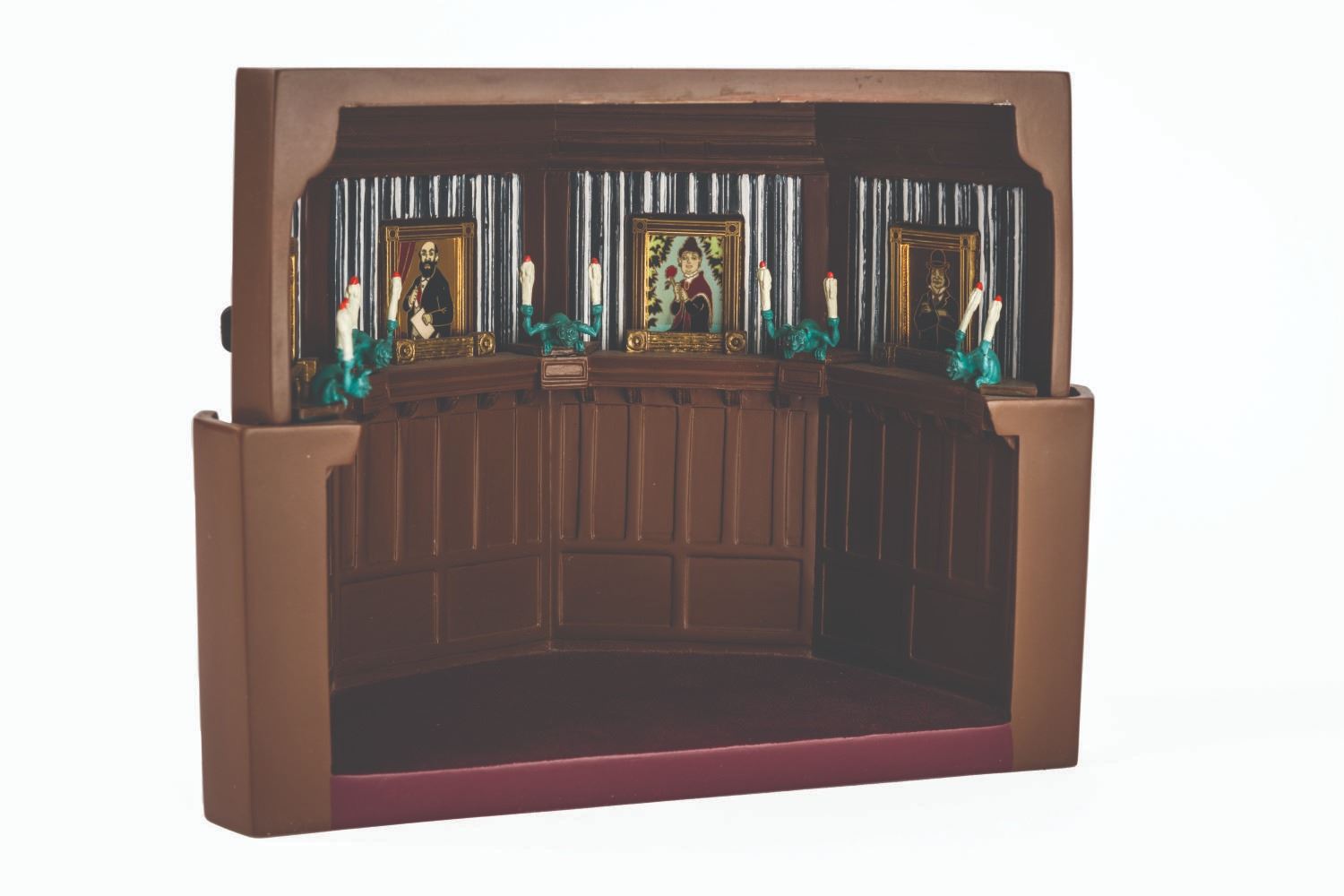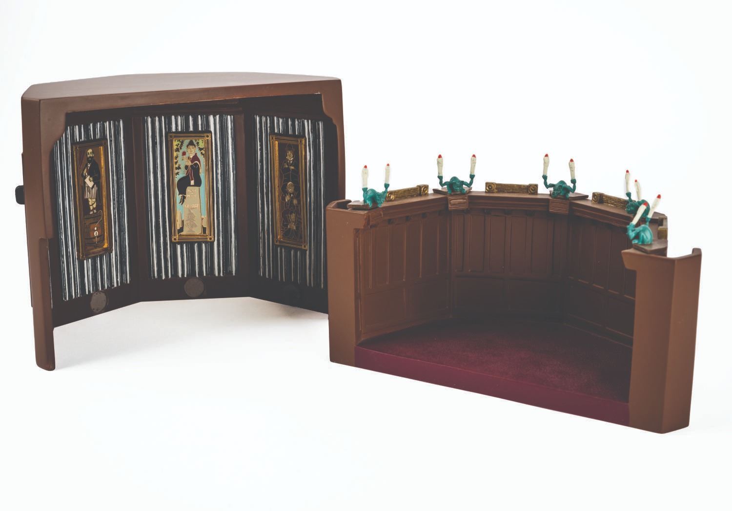 (Walt Disney World, 2004) The Haunted Mansion “Stretching The Imagination” Pins & Display. This set includes (4) pins of the Stretching Room Portraits while the collectible figural room actually “stretches” and locks into two positions for display. This set was issued in an edition size of 300 during the Happy Haunts Ball at The Magic Kingdom on October 27, 2004. With a Certificate of Verification, this piece is in very good condition, with minor wear and loose magnets.