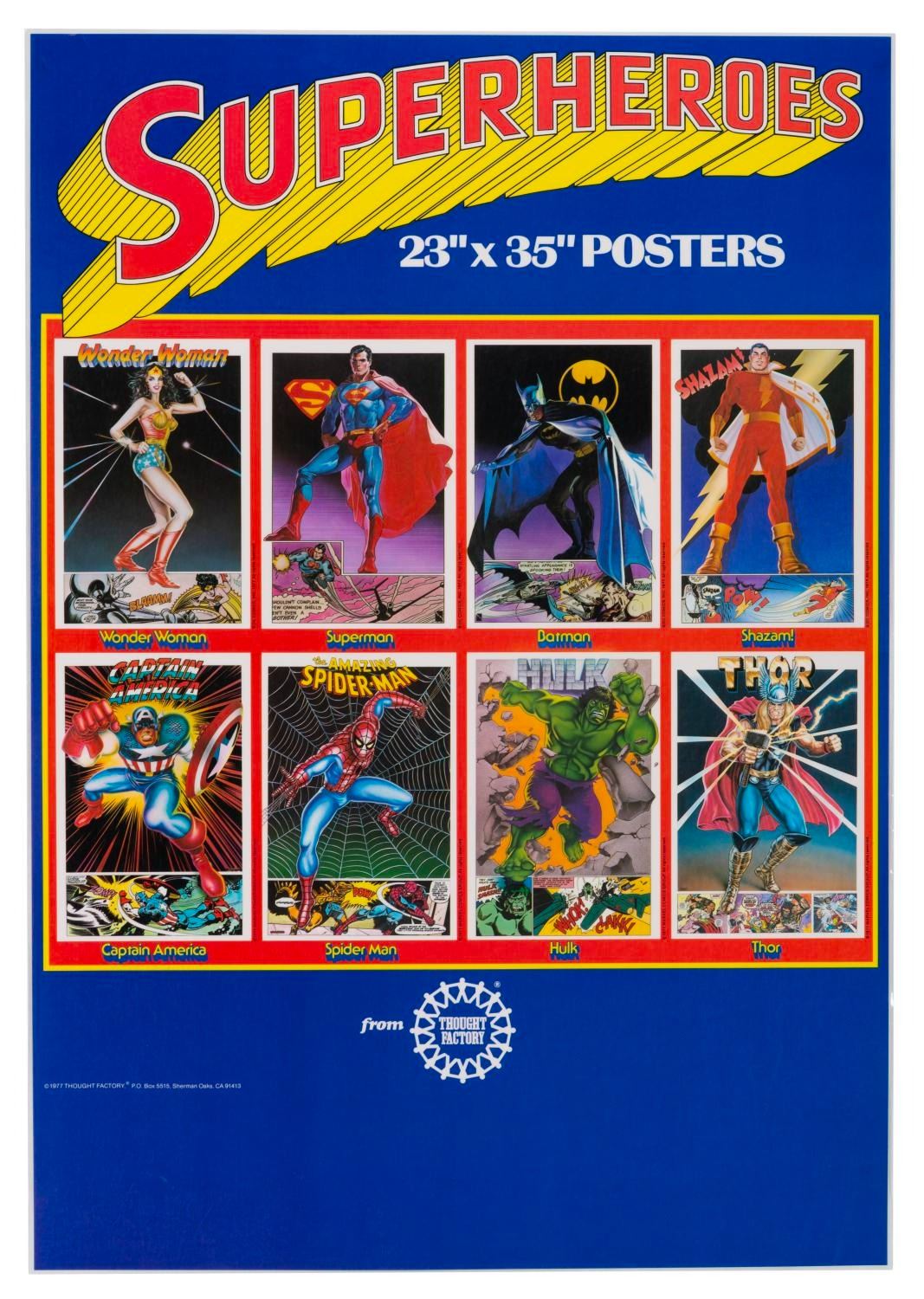 (Thought Factory, 1977) A rare in-store sale point poster for Thought Factory’s superhero posters in 1978. This poster was ordinarily displayed in stores and then discarded, with this sample preserved and laminated by Thought Factory. Measuring 21" x 30", the laminated poster displays in very good condition with very light handling wear.