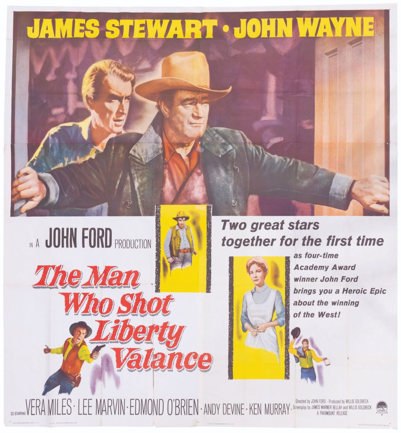 (Paramount, 1962) A very large and rare six-sheet for"The Man Who Shot Liberty Valance" starring screen icons John Wayne and James Stewart. Measuring 81" x 81", the poster is in good condition with folds, separation at the folds, creases, edge wear and tears, including one measuring 19", and discoloration from age.