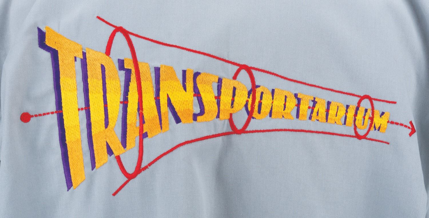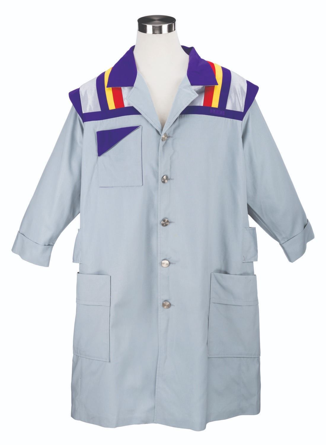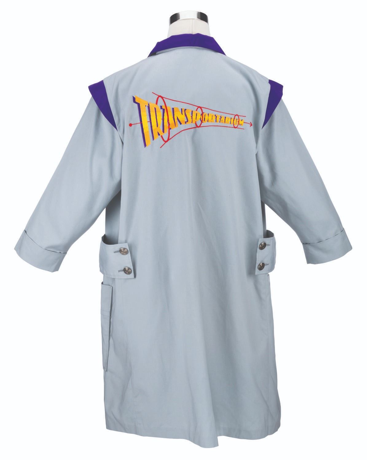 (Walt Disney World, 1994-95) A rare costume coat featuring "Transportarium" embroidered on the reverse, worn by Cast Members working From Time to Time in Tomorrowland, better known as The Timekeeper. When the attraction opened in the Magic Kingdom in 1994, it was originally named From Time to Time, and the theater was called the Transportarium. After its first six months of operation, the attraction experienced a rebrand, with the theater renamed Tomorrowland Metropolis Science Center and the attraction The Timekeeper, after its host character, voiced by Robin Williams. This coat is a scarce memento of the early days of this classic Tomorrowland attraction. Labeled a size L, the coat is in very good condition with light wear from Park use.