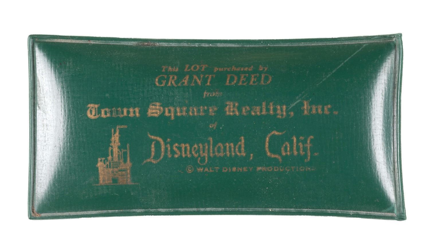 (Disneyland, 1955-57) A very rare "Lot Purchased by Grant Deed" souvenir of Town Square Realty at Disneyland. Town Square Realty was perhaps one of the most unique exhibits on main Street U.S.A., operating just a short period from 1955 to 1957. The true-life realtor offered information on parcels in Southern California. The exhibit also distributed this souvenir "Lot Purchased by Grant Deed" – a vinyl bag of dirt soil from a parcel on which Disneyland stands and features the name of both the legal corporation and Disneyland logo printed in gold ink on the front. The backside of the package is clear so that the dirt can be viewed. Measuring 4"x2", the condition is very good with slight scuffs and wear to the printing from age and handling.