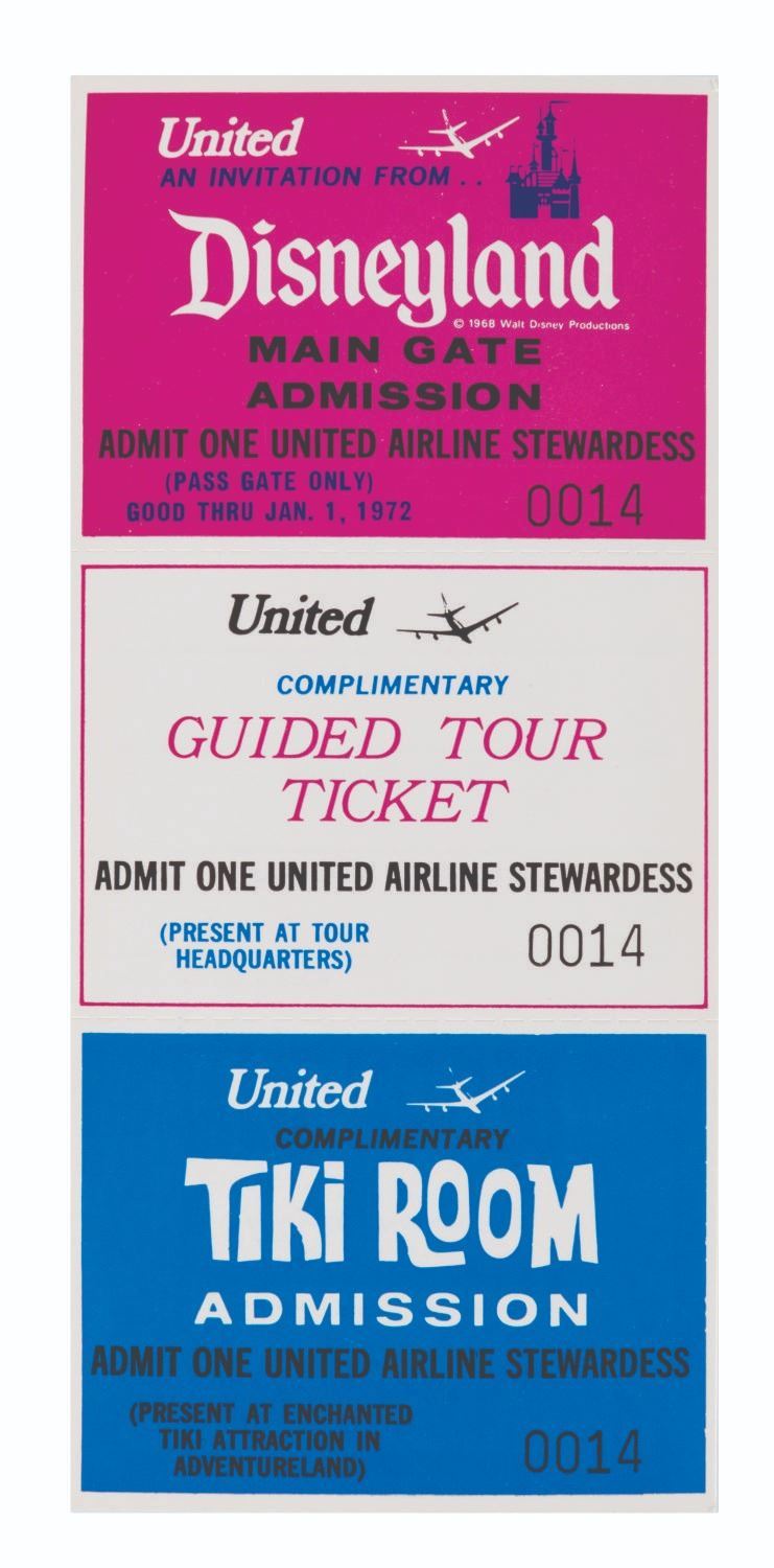 (Disneyland, 1968-72) A very rare Disneyland ticket set given only to United Airlines stewardesses. United Airlines sponsored The Enchanted Tiki Room from its opening in 1963, and this ticket includes stubs granting Disneyland Main Gate Admission, a complimentary guided tour of the Park, and admission to the Tiki Room. This ticket numbered 14 is complete and unused. Measuring 6” x 2.75”, the ticket is in fine condition with only a tiny bump to the top right corner.