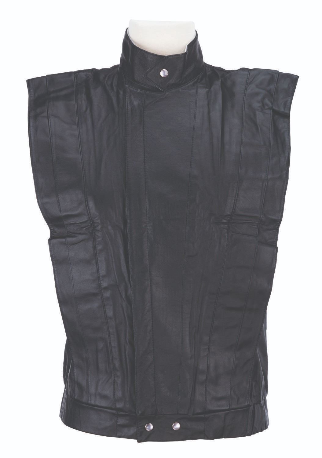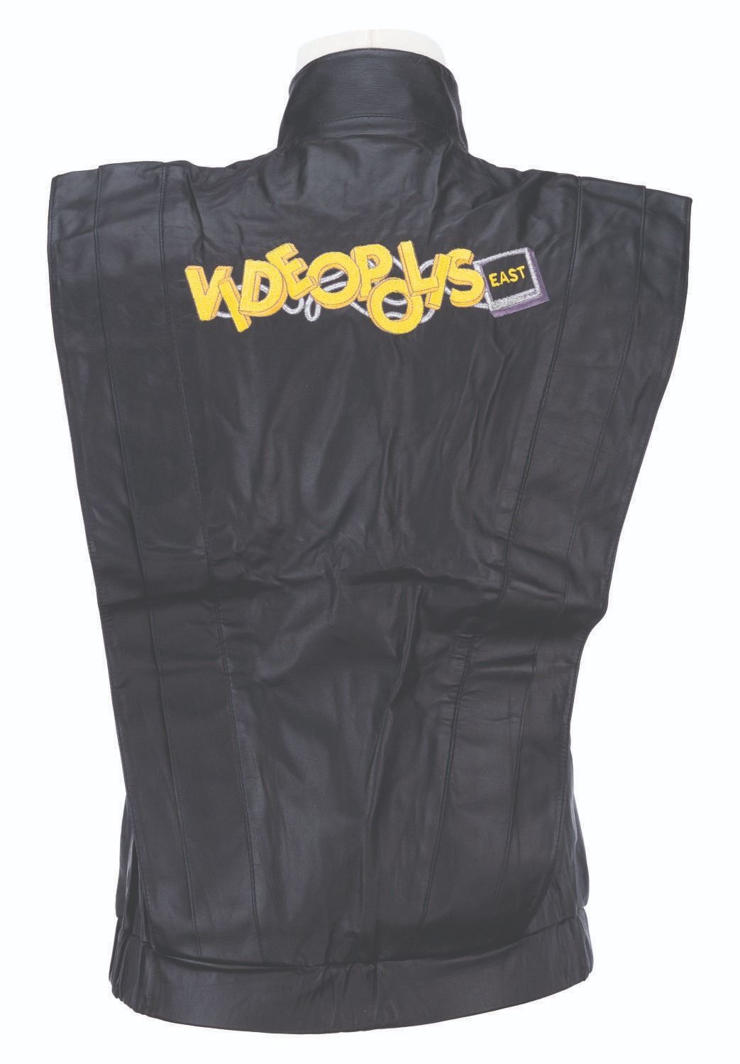 (Pleasure Island, 1989) A rare leather Cast Member vest from Videopolis East at Pleasure Island. The opening year fast dancing club rebranded as Cage in 1990 and closed two years later. Labeled a size female XS, the vest is in very good condition with light stains on the back, creases from storage, and wear from use.