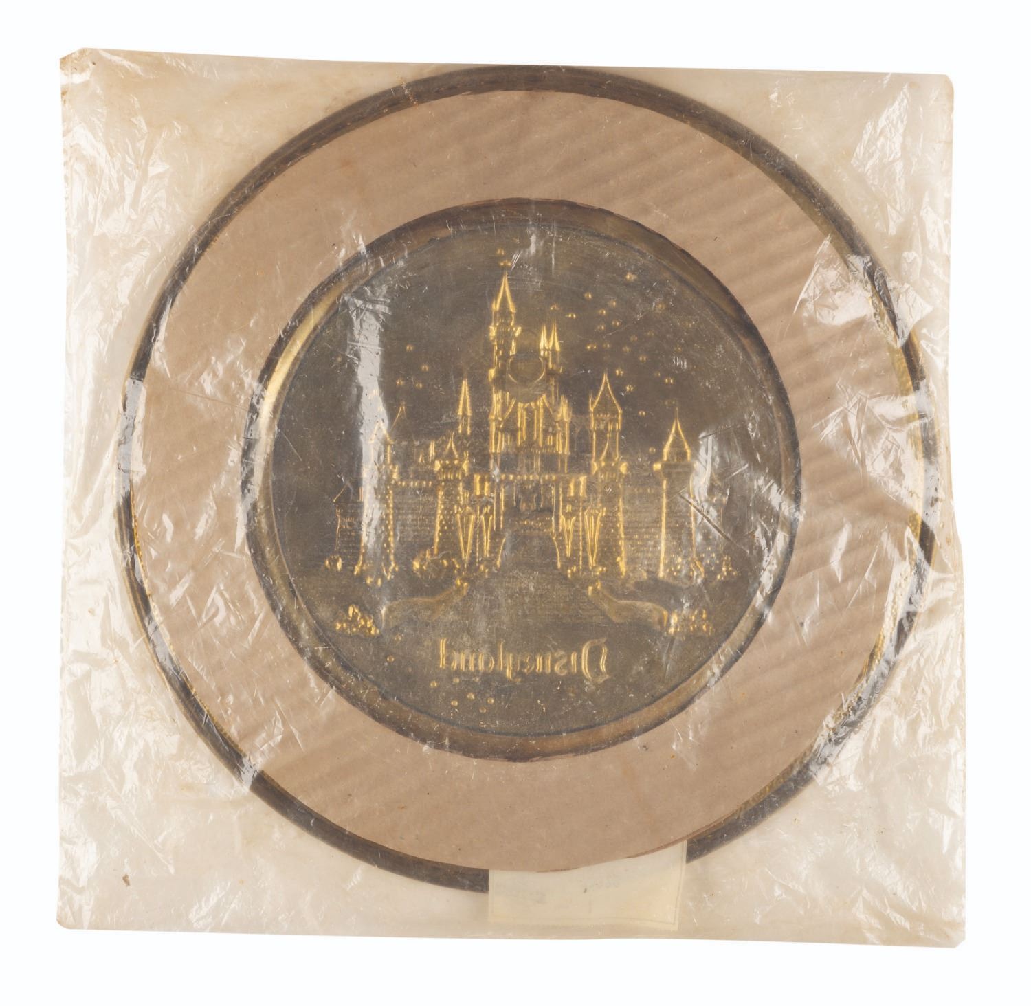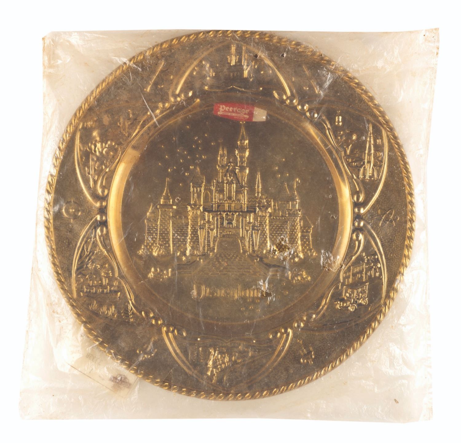 (Disneyland, 1950s/60s) A rare pressed metal plate featuring Sleeping Beauty's Castle in the center with images of attractions on the rim. Measuring 12" in diameter, the plate is in fine condition with its original manufactuer's label attached.