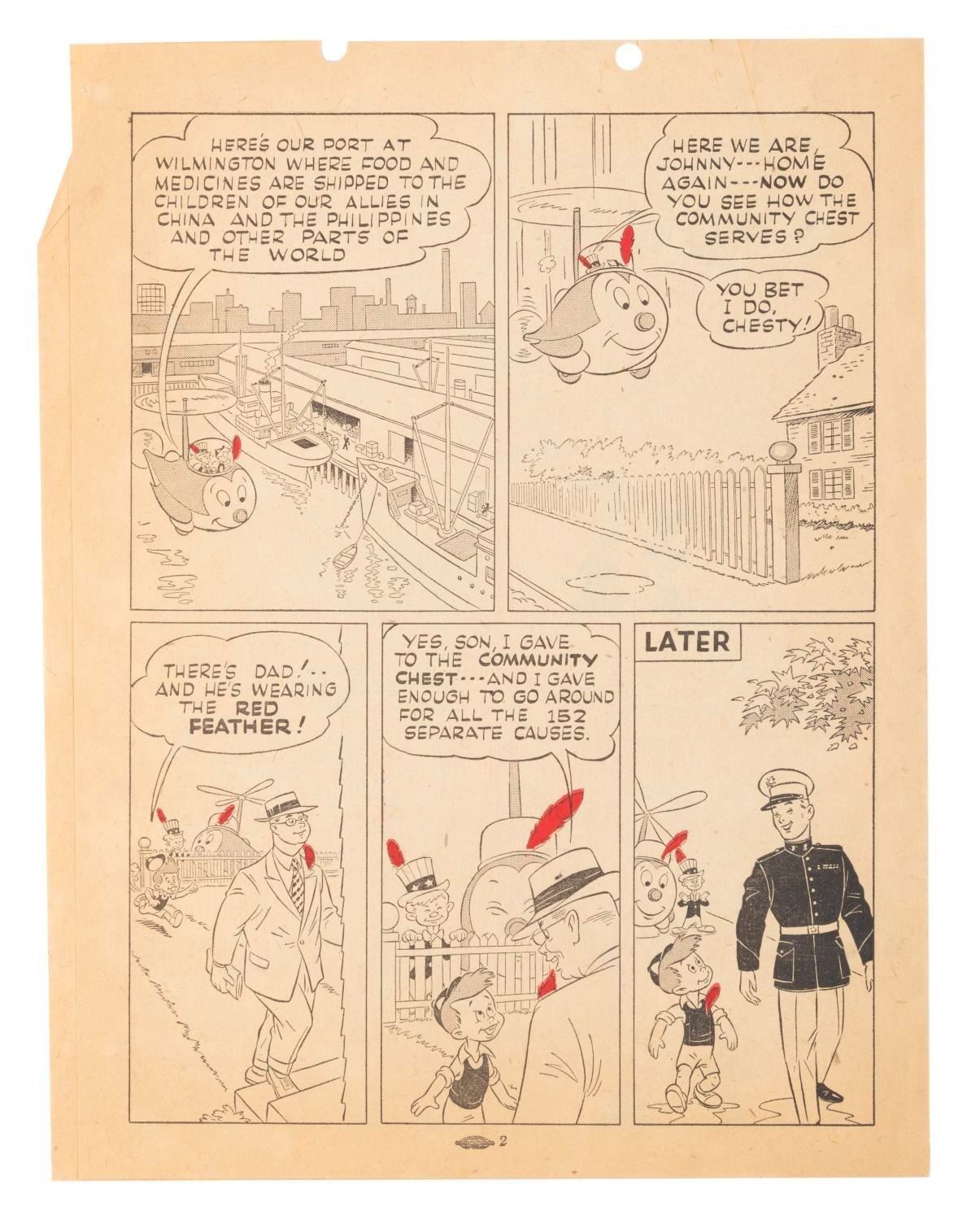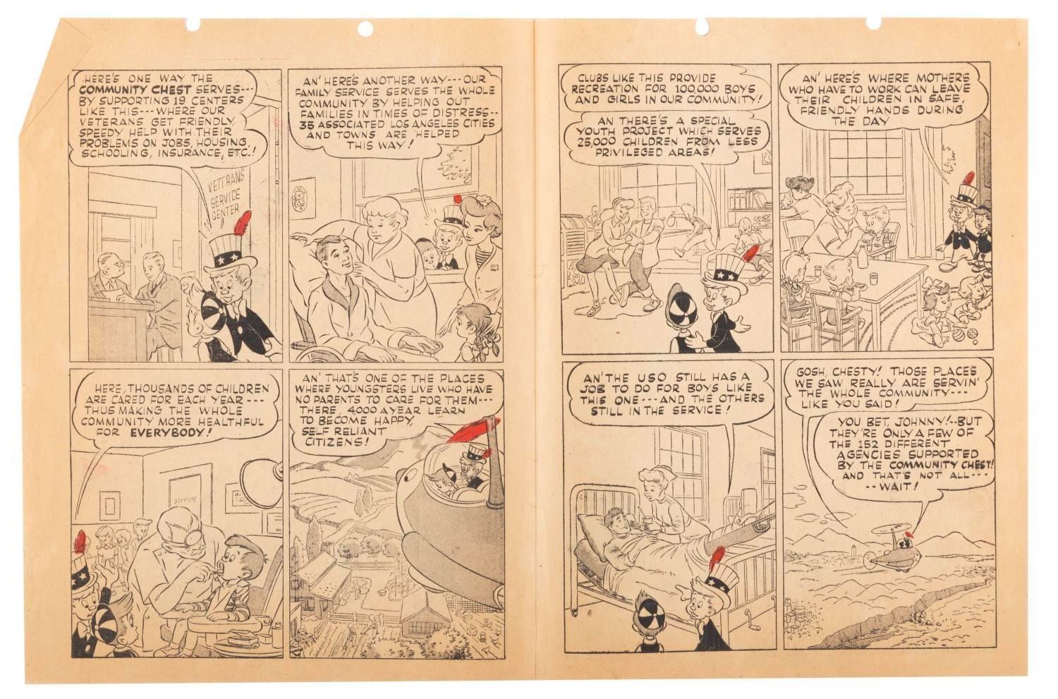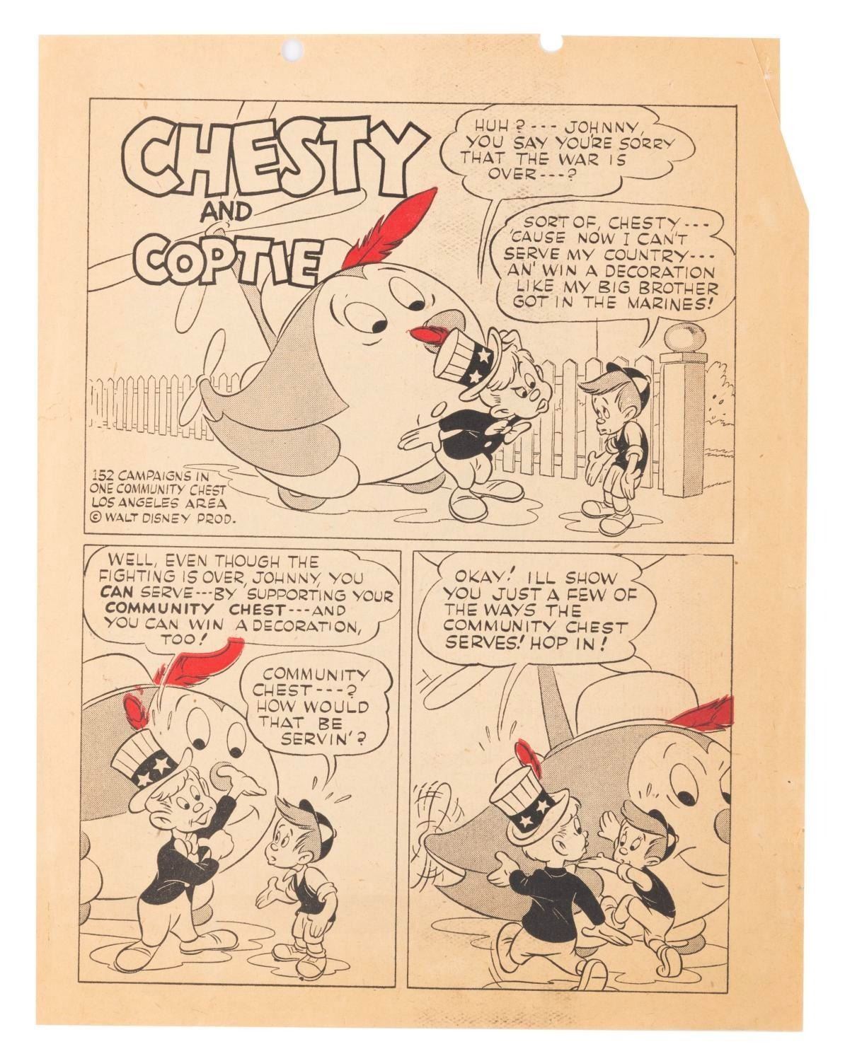 (Disney, 1945) A very rare newspaper insert supporting the Community Chest effort in Los Angeles. Walt Disney created the characters Chesty and Copty to promote the War Bond and Victory Bond efforts late in World War II. Several newspaper insert comic strips were created featuring the characters, distributed in the Los Angeles area. This Post-War strip features the characters promoting the Community Chest effort to support needy people around the world. Measuring 8.25" x 10.5", the insert is in very good condition with a crease to one corner, two holes punched in the top border that do not affect the image, and pages off-white from age.