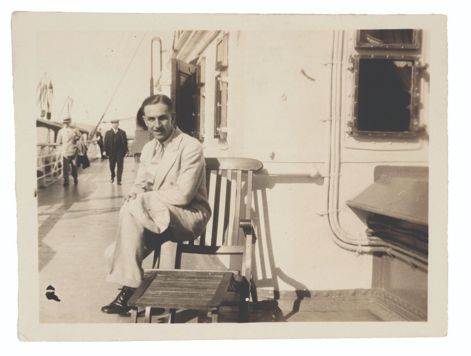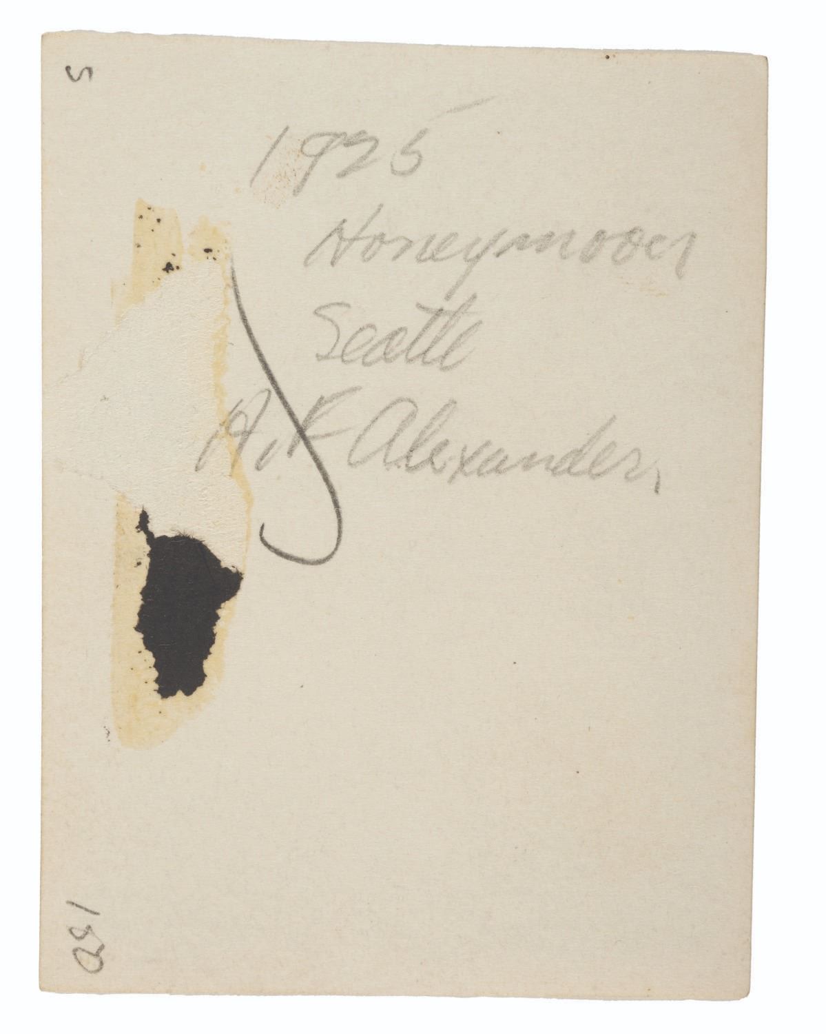 (Disney, 1925) An incredible photo of a 23-year-old Walt Disney on his Honeymoon, taken aboard the Steamship H.F. Alexander out of Seattle. Disney sent this photo to his friend Carl Stalling and it is inscribed on the reverse in Disney’s handwriting, "1925 Honeymoon Seattle H.F. Alexander." Measuring 3.5" x 2.5" the original photo is in very good condition with slight curling and residue on the reverse from being mounted in a scrapbook.