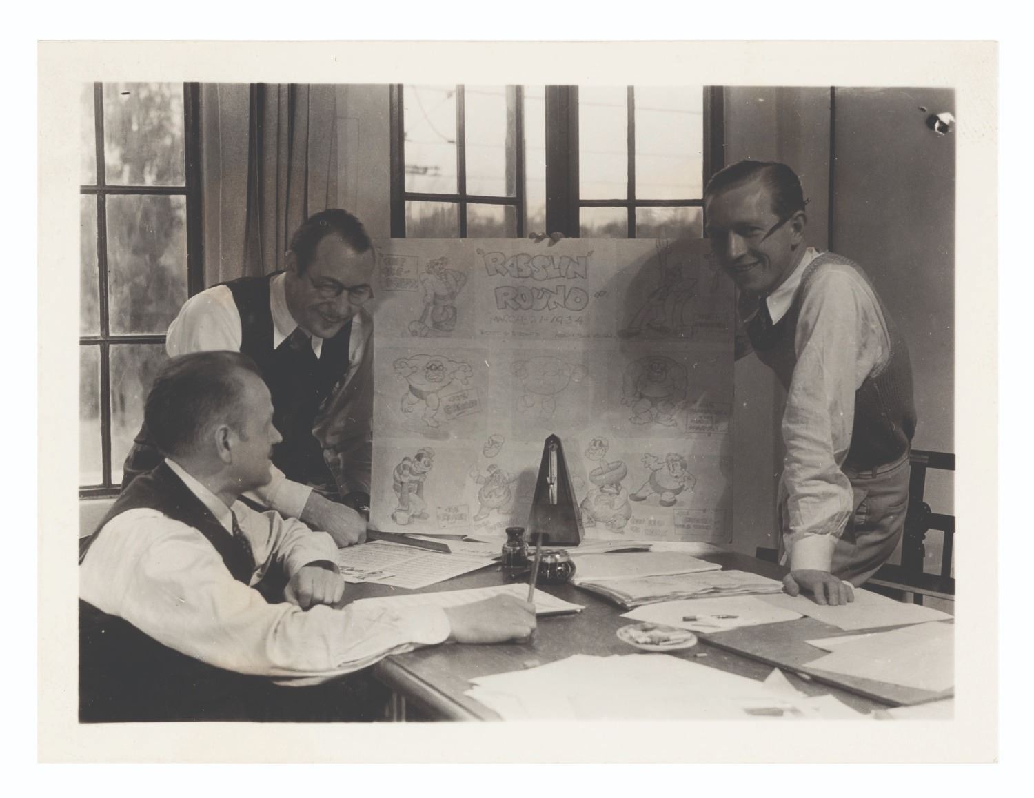 (Iwerks, 1934) A photograph of a meeting between composer Carl Stalling and animators Robert Stokes and Norm Blackburn during production of the Ub Iwerks-directed short “Rasslin’ Round,” starring Willie Whopper. Measuring 3.25’ x 4.25”, the photo is in good condition with light stains, waviness, marker on the reverse, and wear from age.