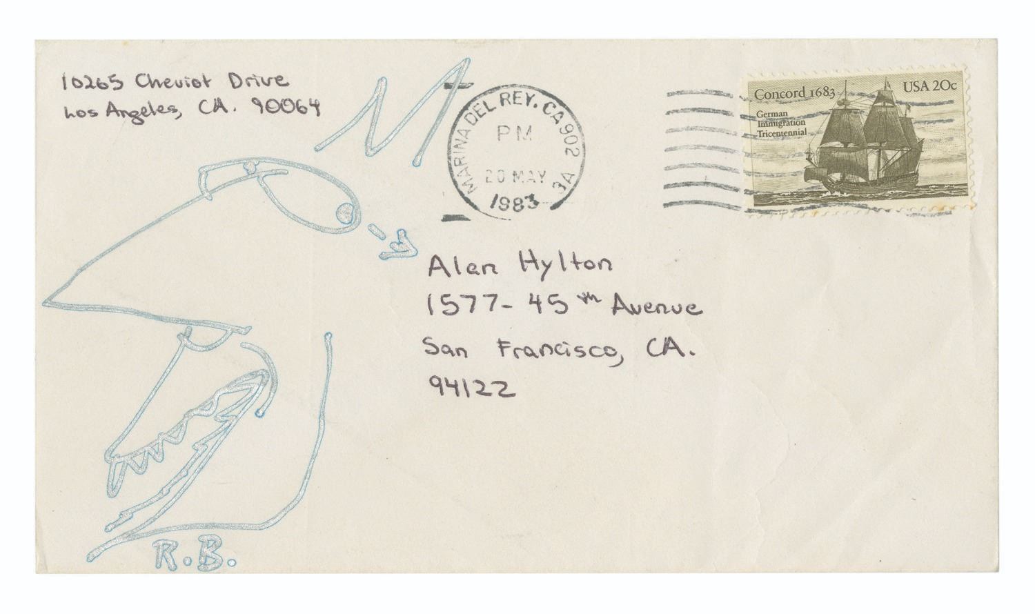 (Bradbury, 1983) An original drawing from author and screenwriter, Ray Bradbury. After a fan wrote to Bradbury, he drew a sketch and initialed the original envelope for the fan. Bradbury was known to illustrate this devil-like character and initialed "R.B." below the drawing. The envelope measures 3.5" x 6.5" and is in very good condition with minor wear from its original use.