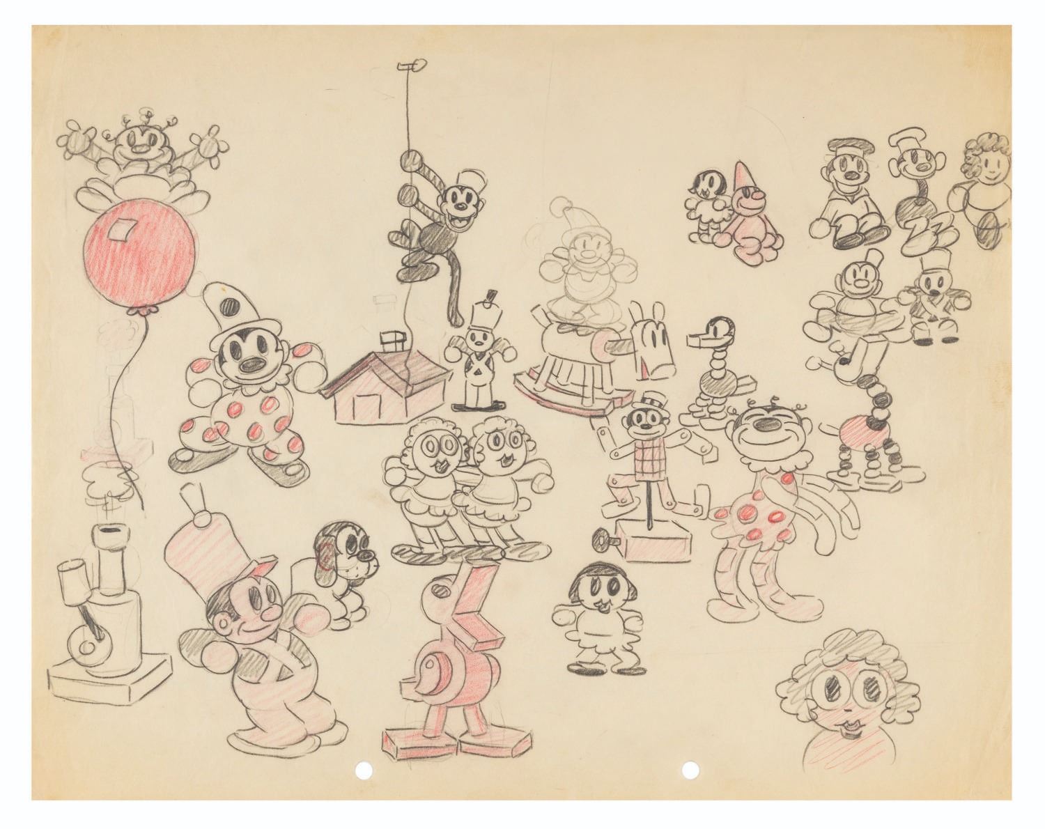 (Harman-Ising, 1931) An original character study drawing of different toys from the Merrie Melodies short “Red-Headed Baby.” Measuring 9.5” x 10” overall, with the character image taking up most of the page, the graphite and color pencil drawing is in very good condition with light creases from production use and light discoloration from age.