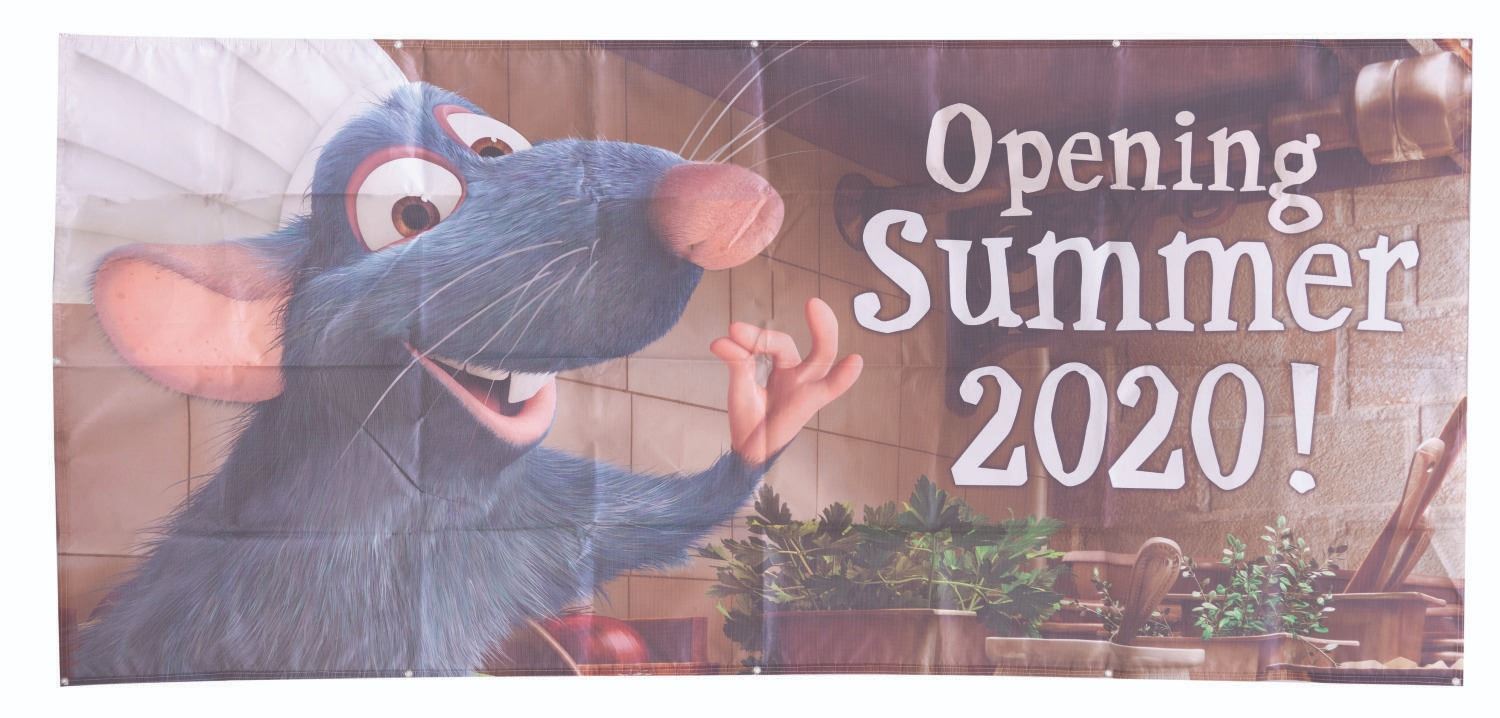 (Epcot, 2019-2020) A large scrim sign for Remy’s Ratatouille Adventure at Epcot, promoting a summer 2020 opening. This sign was originally displayed in the Park on the exterior of the show building during construction. The attraction did not open as advertised due to the COVID-19 pandemic, finally debuting in October 2021—just in time for Walt Disney World’s 50th anniversary celebration. Measuring over 11.5 feet long and 5.5 feet tall, the sign displays in very good condition with spotting, stains, and wear from Park use.