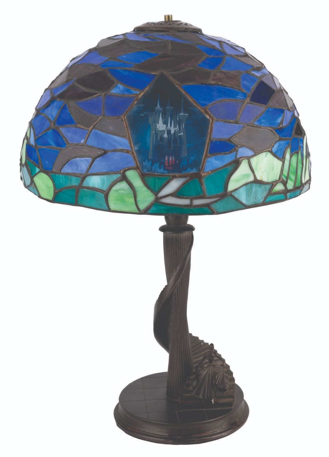 (Disney, 2003) A “Cinderella” Tiffany-style stained glass lamp featuring Cinderella leaving the party at midnight. Designed by Jody Daily, the lamp was released in a limited edition of 1500 and has an impressive glass shade that, when illuminated, displays a silhouette of Cinderella’s carriage. Measuring 13.25" in diameter and 19" high, the lamp displays in good working condition with visible cracks in the glass from previous repair, light tarnish, wear, and its top decorative finial missing.