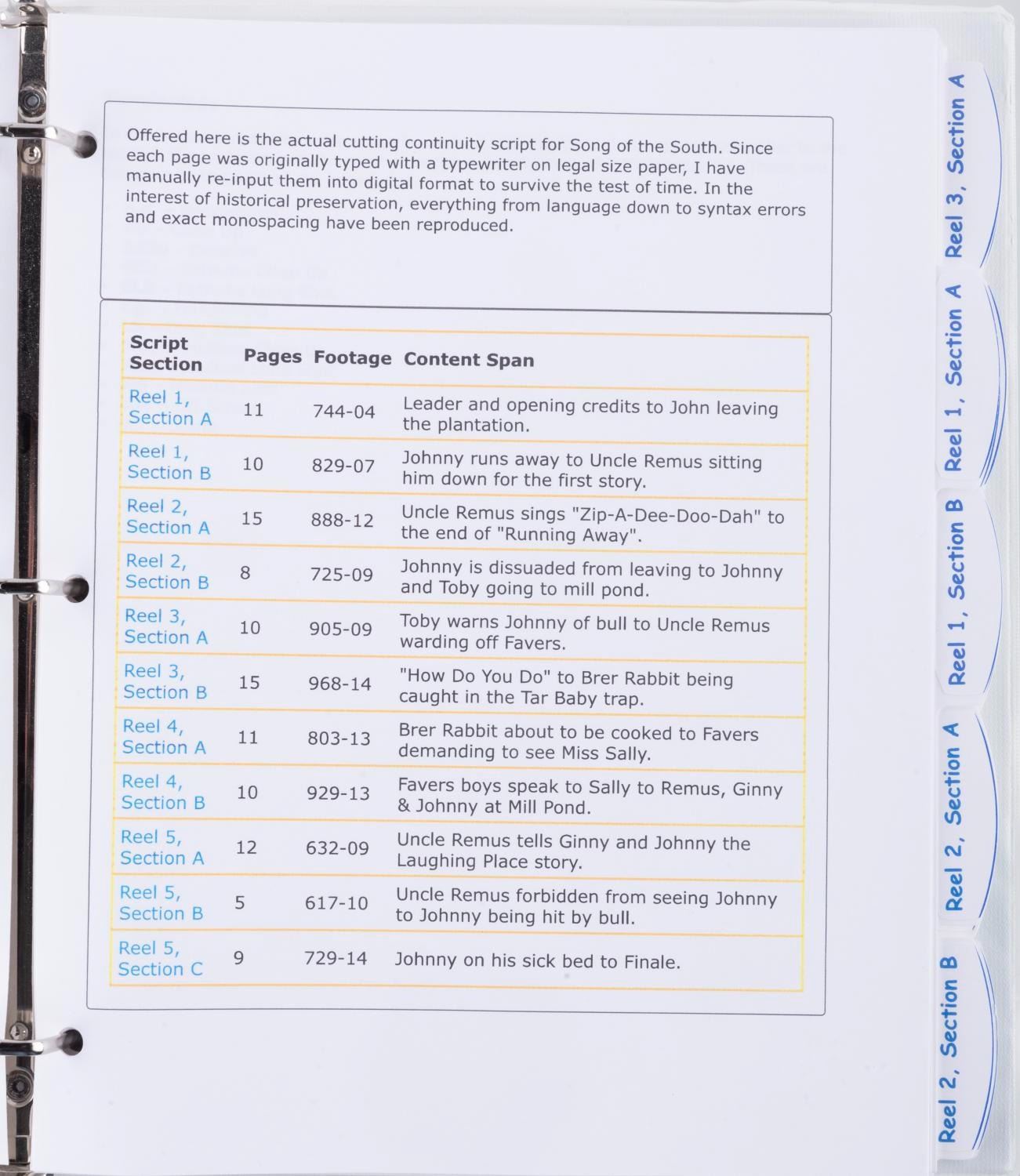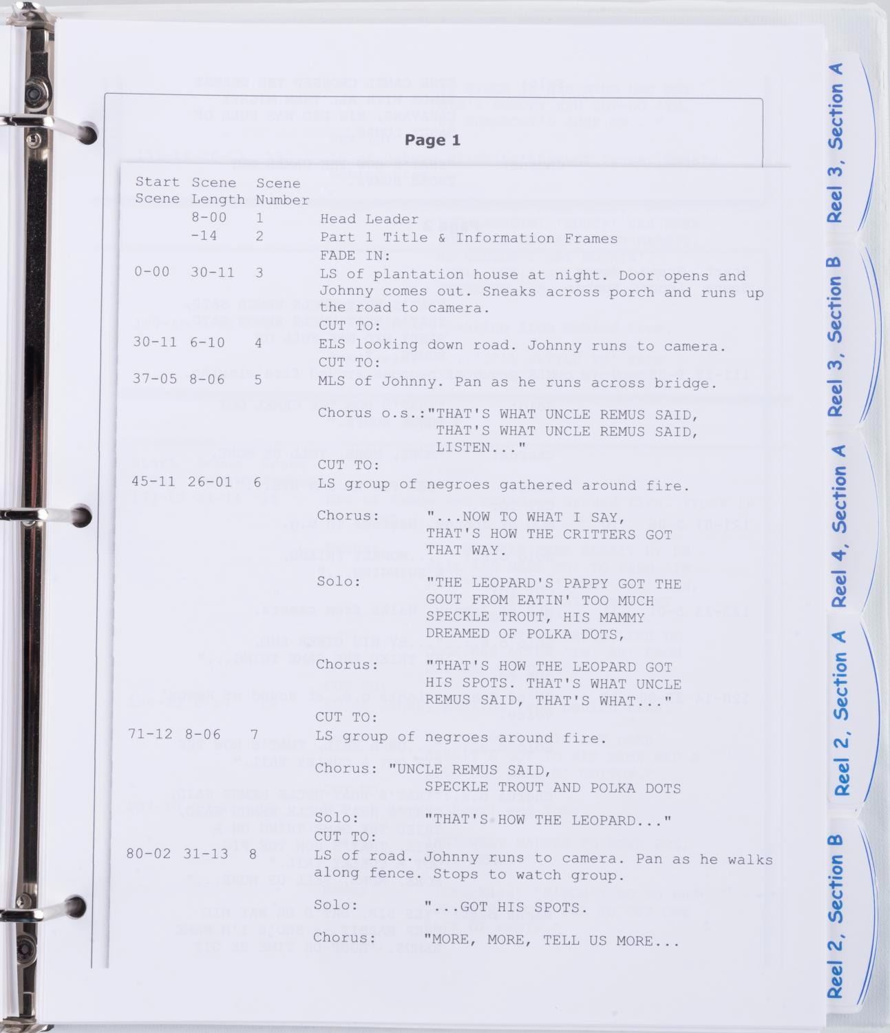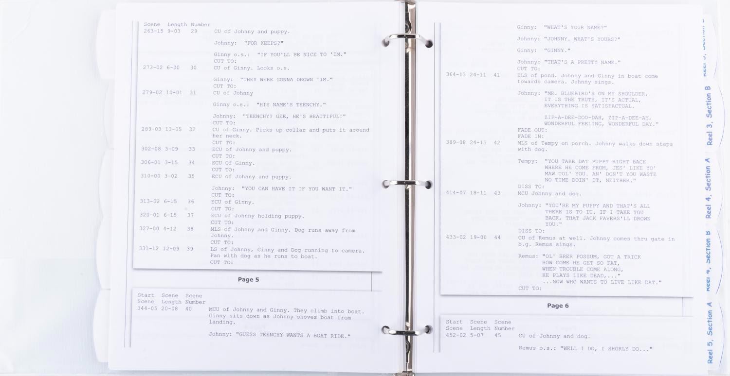(Disney, 1990s-2020s) A cutting continuity script reproduction for “Song of the South.” The script is housed in a three-ring binder. Measuring 10.25” x 11.5” x 1.5” thick, the script is in fine condition.