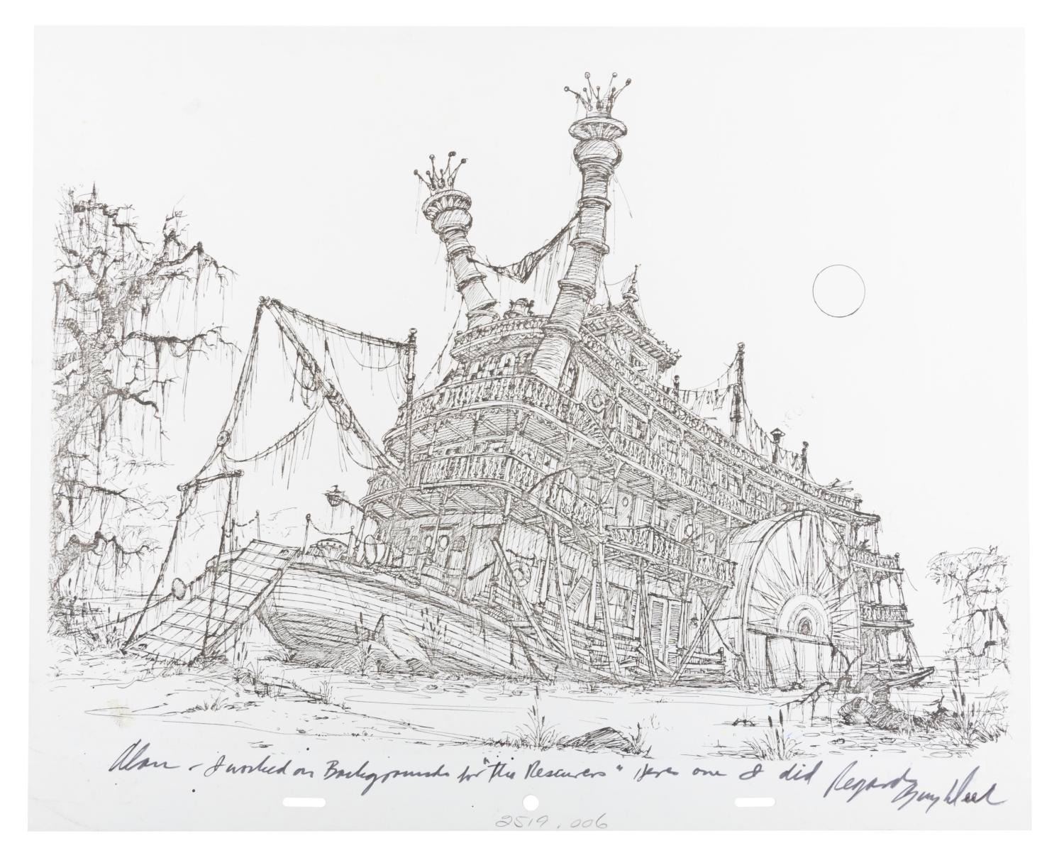 (Guy Deel, 1980s-90s) A xerox of Medusa’s sunken riverboat from “The Rescuers” by background artist Guy Deel, signed with a dedication. Measuring 12.5” x 15.5”, the xerox displays in very good condition with stains, pinholes, and light discoloration from age.
