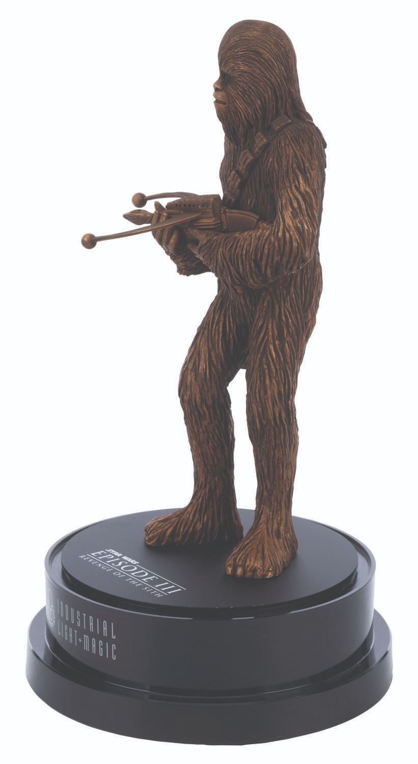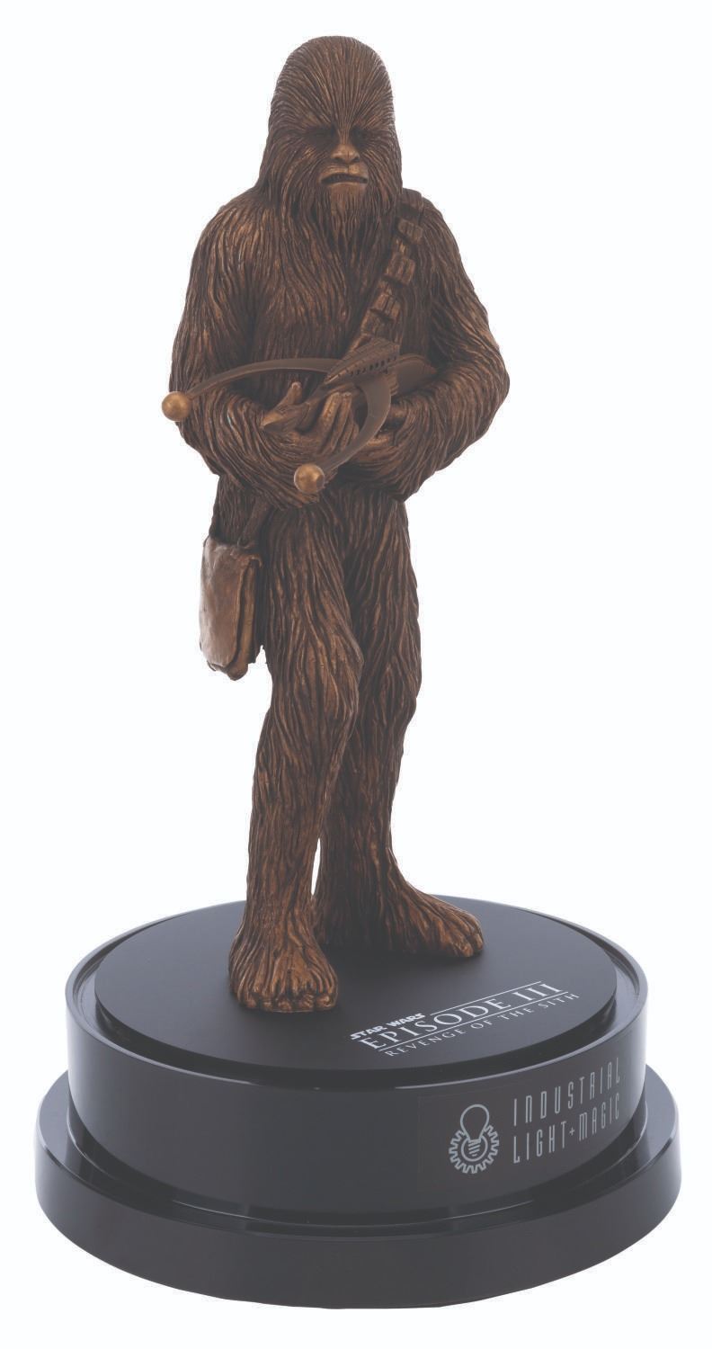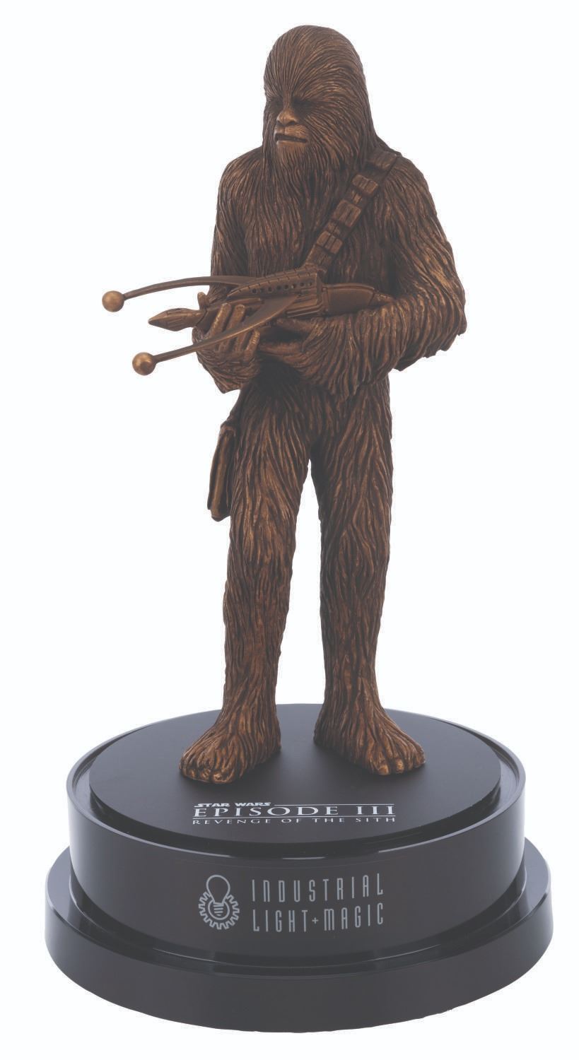 (Lucasfilm Ltd., 2005) A “Star Wars: Episode III - Revenge of the Sith,” Chewbacca figure and display gifted by Industrial Light & Magic to executives. The cast resin Chewbacca figure measures 12.5” and 17” tall and 8.75” in diameter with the display. Included is an 8.5” x 11” thank you letter from Lucasfilm with the top left quadrant cut out. The entire piece is in very good condition with light wear, visible repair, and bubbling in the glass. This item requires special shipping arrangements. Please inquire before bidding.