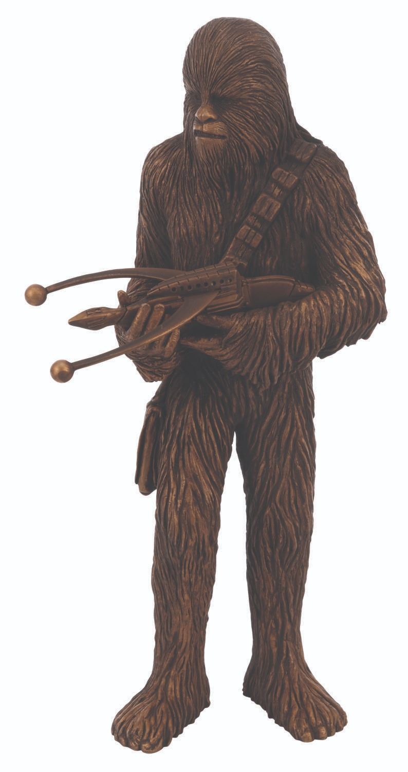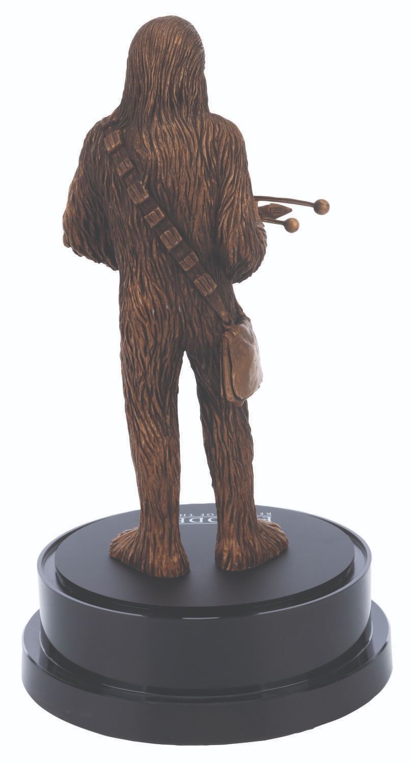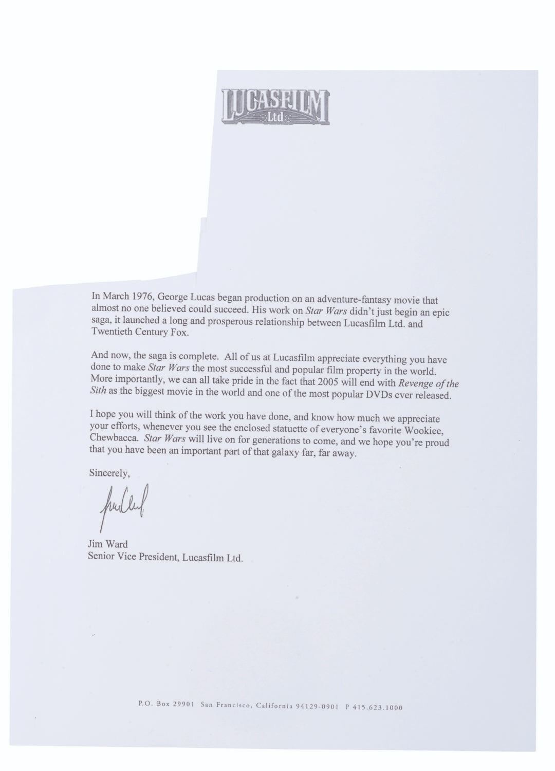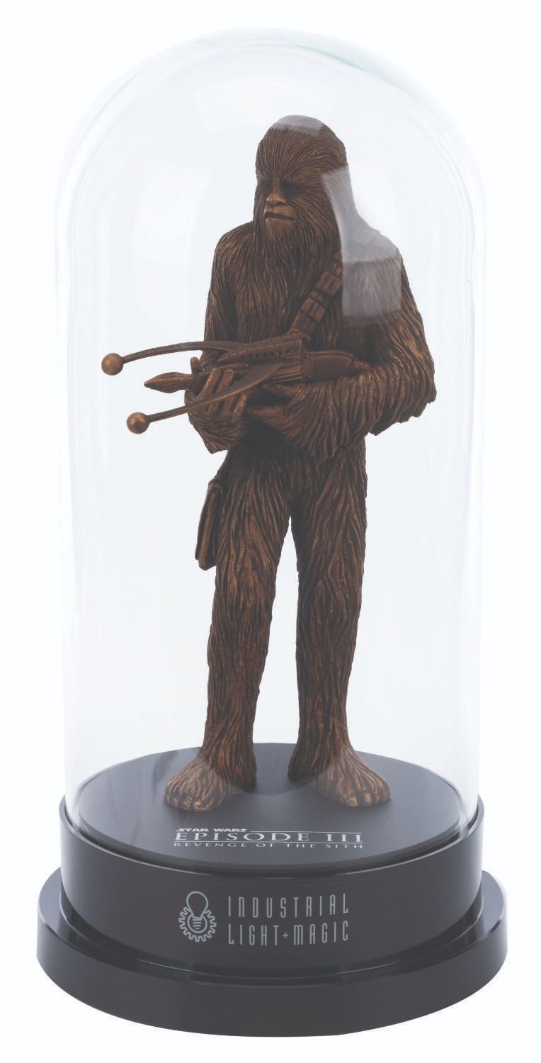 (Lucasfilm Ltd., 2005) A “Star Wars: Episode III - Revenge of the Sith,” Chewbacca figure and display gifted by Industrial Light & Magic to executives. The cast resin Chewbacca figure measures 12.5” and 17” tall and 8.75” in diameter with the display. Included is an 8.5” x 11” thank you letter from Lucasfilm with the top left quadrant cut out. The entire piece is in very good condition with light wear, visible repair, and bubbling in the glass. This item requires special shipping arrangements. Please inquire before bidding.