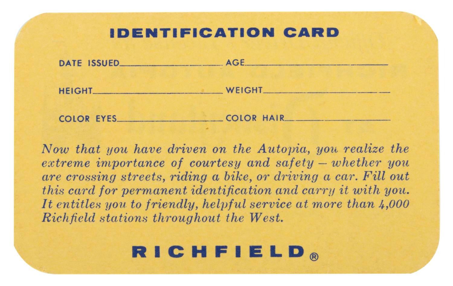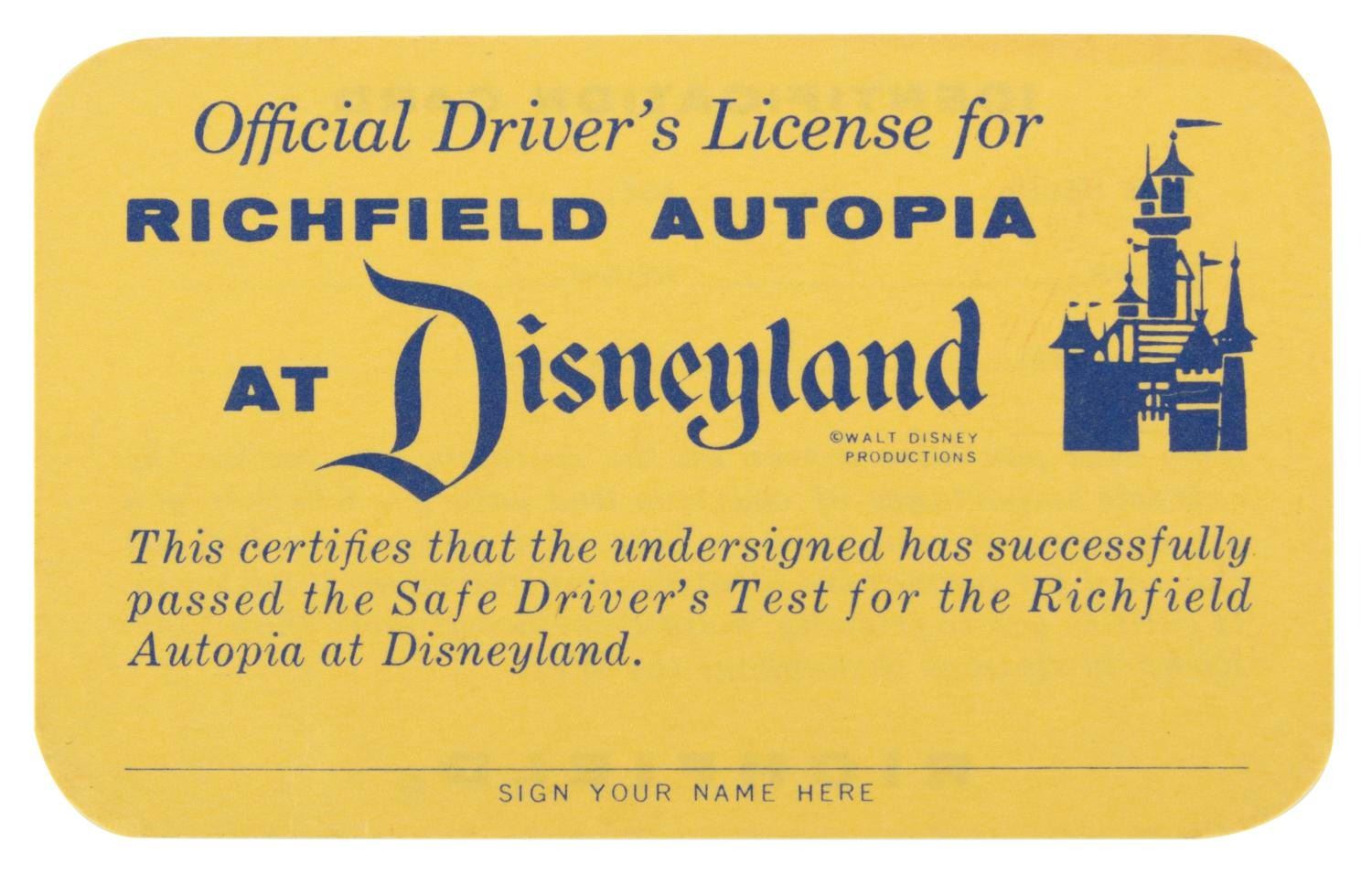 (Disneyland, 1960s) An unused Official Driver's License for the Richfield Autopia at Disneyland. Measuring approximately 2.5" x 4", the license is in very good condition with light edge wear.