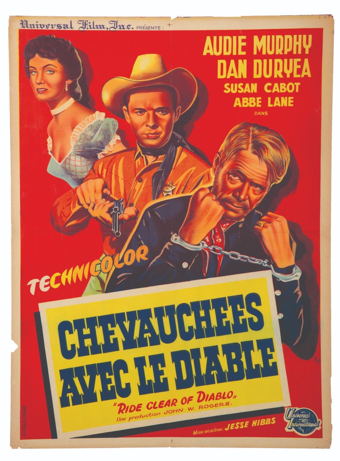 (Universal Pictures, 1954) A French medium poster for Audie Murphy's western Ride Clear of Diablo. Measuring 23.5"x31.5", the poster displays in very good condition, with original folds showing very slight splitting at points, and light edge wear including (2) .5" to 1" chips.