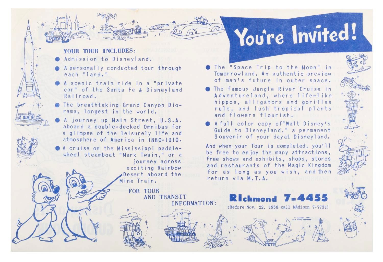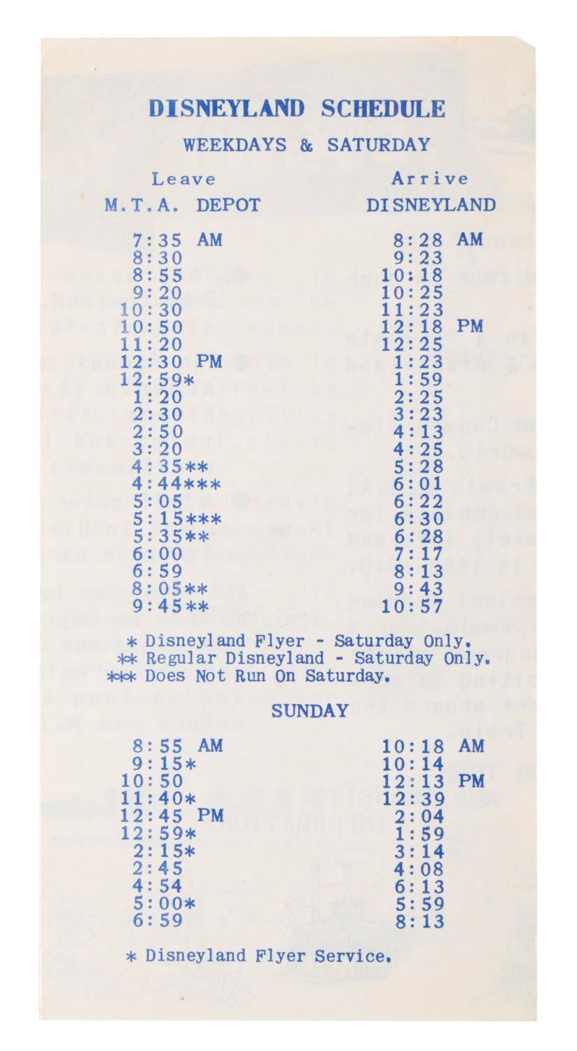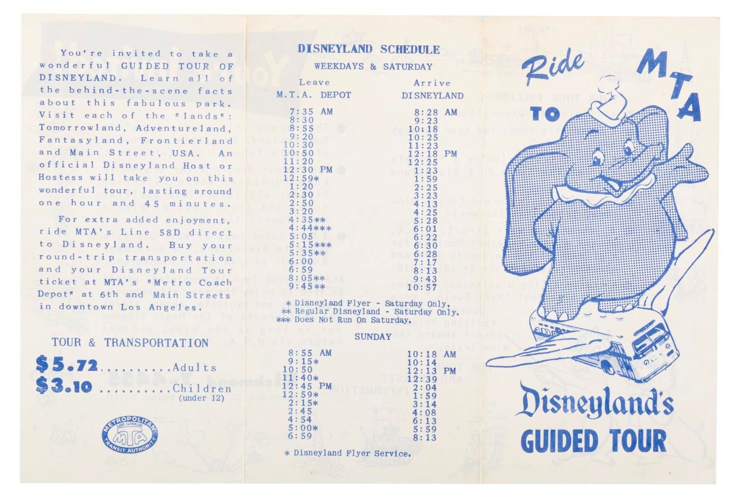 (Metropolitan Transit Authority, 1956) A very rare pamphlet detailing MTA’s early guided tour packet for Disneyland including admission to the Park and select attractions, and a souvenir guidebook. Measuring 6.25” x 9.25” open, the pamphlet is in good condition with light wear and creases to the top edge.