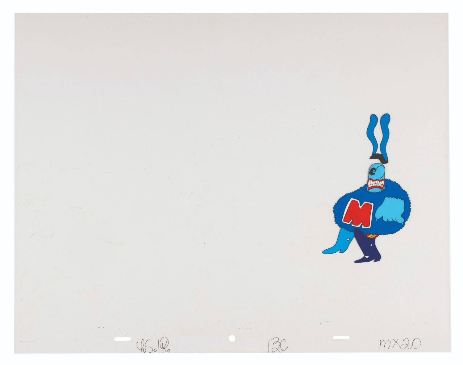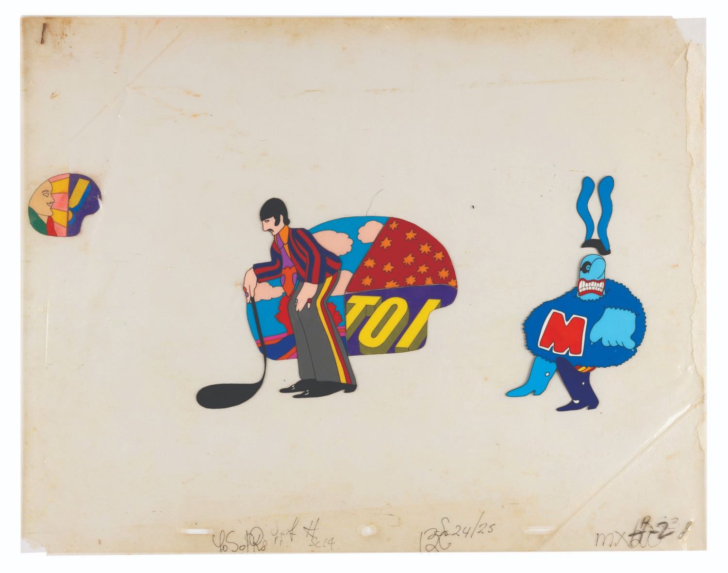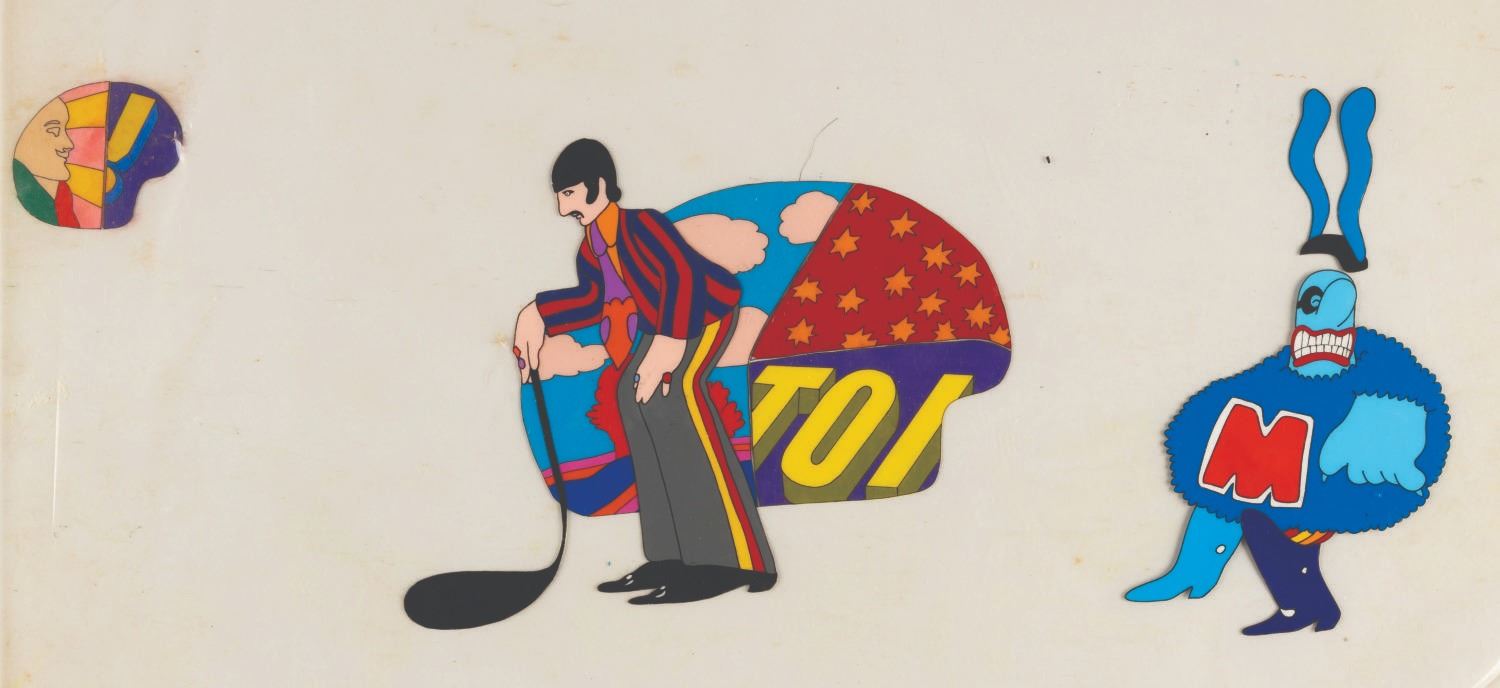 (United Artists, 1968) An original hand-painted production cel of Ringo Starr and Max Blue Meanie from "Yellow Submarine.” Measuring 12.5” x 16” with character image sizes of 4.75” x 2.5” and 5.5” x 3.5”, the multi-layer cel displays in good condition with pinholes, oxidation stains, creases to the top left and bottom right corners, tears to the corners, light soiling and scuffs, light discoloration to the acetate but not the paint itself, and adhesive and paper residue along the right edge which does not affect the image.