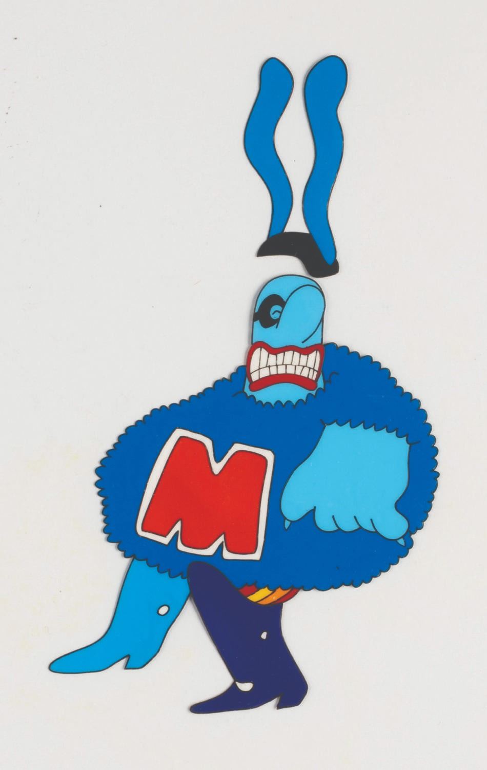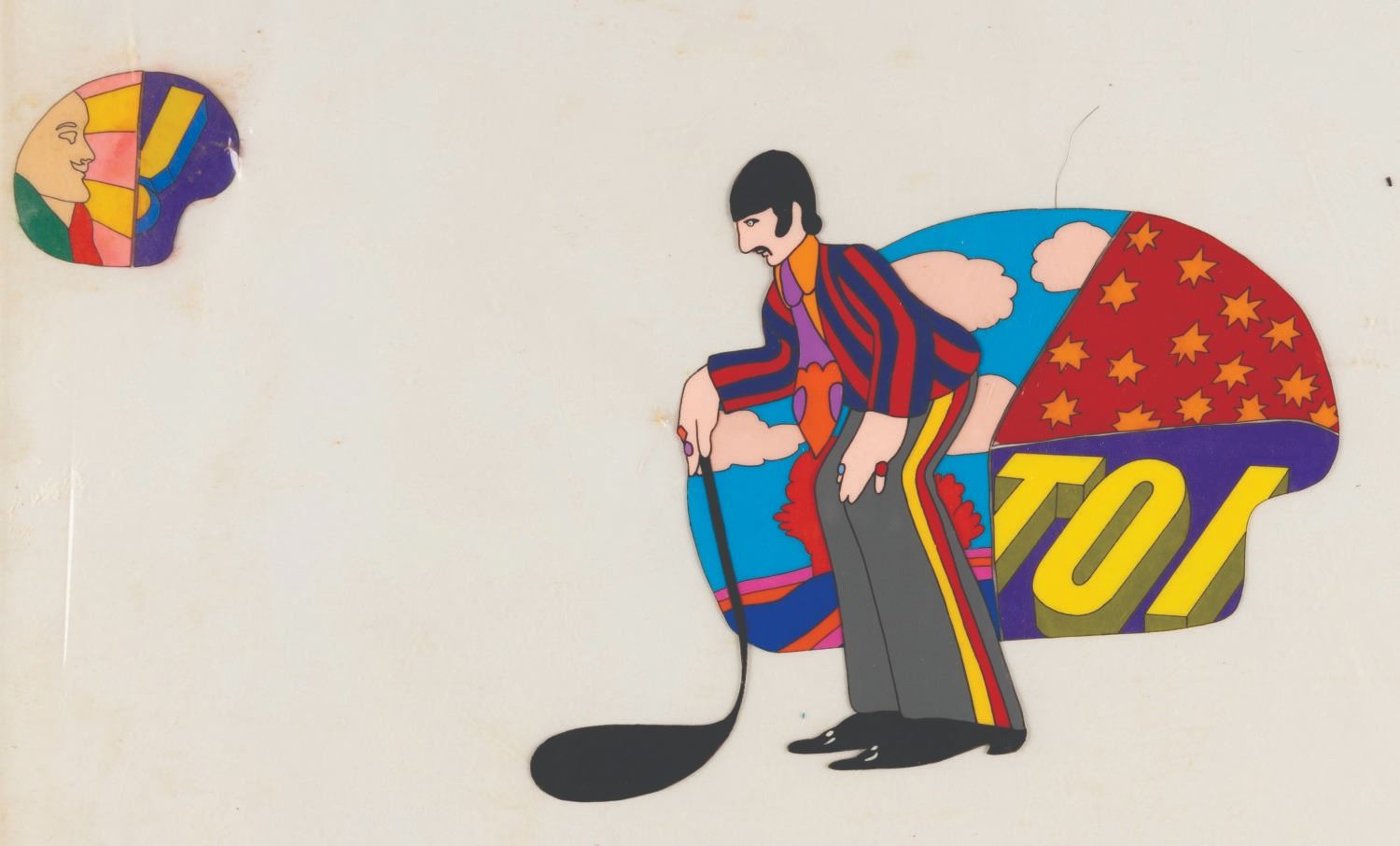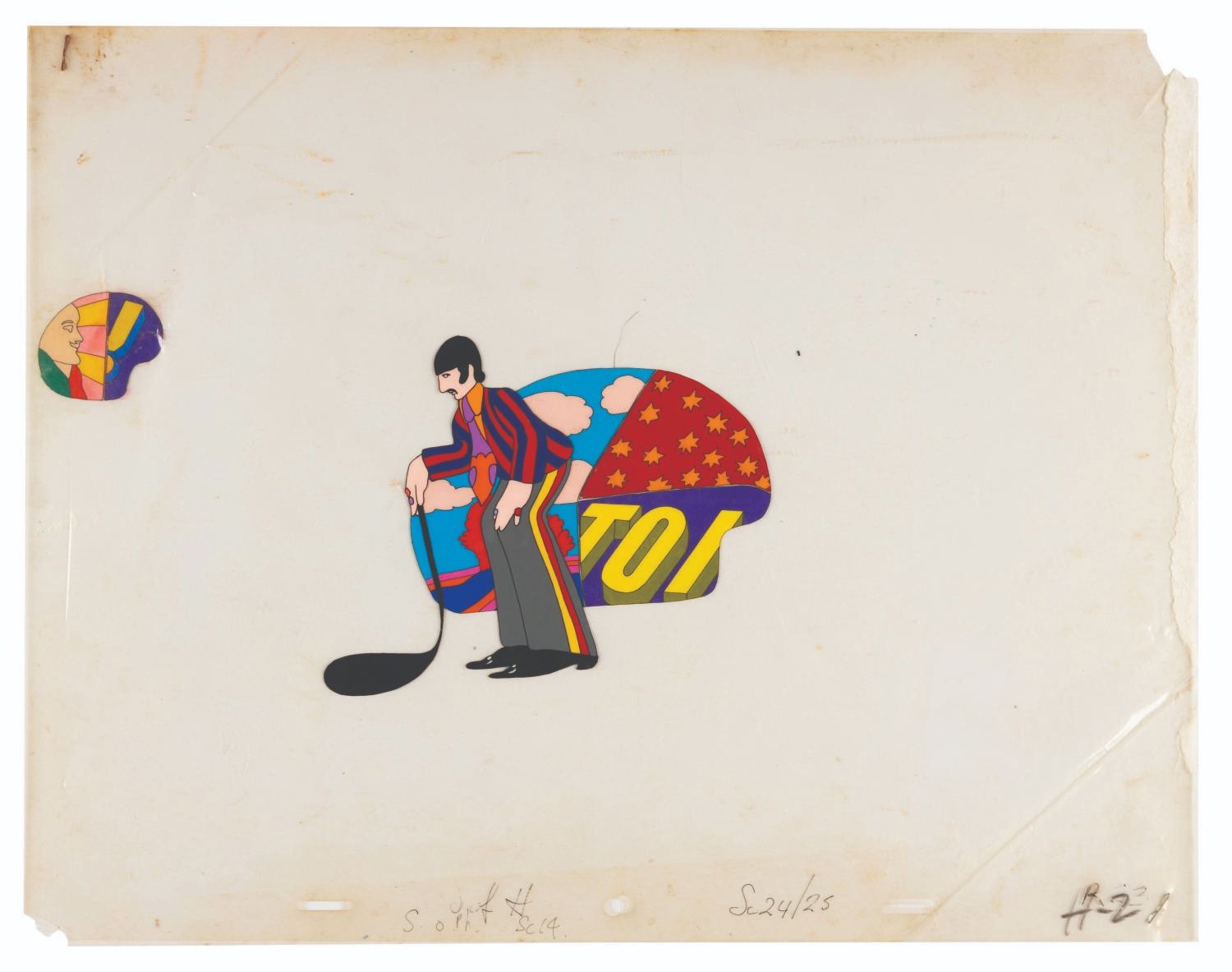(United Artists, 1968) An original hand-painted production cel of Ringo Starr and Max Blue Meanie from "Yellow Submarine.” Measuring 12.5” x 16” with character image sizes of 4.75” x 2.5” and 5.5” x 3.5”, the multi-layer cel displays in good condition with pinholes, oxidation stains, creases to the top left and bottom right corners, tears to the corners, light soiling and scuffs, light discoloration to the acetate but not the paint itself, and adhesive and paper residue along the right edge which does not affect the image.