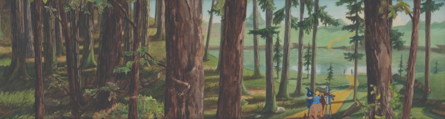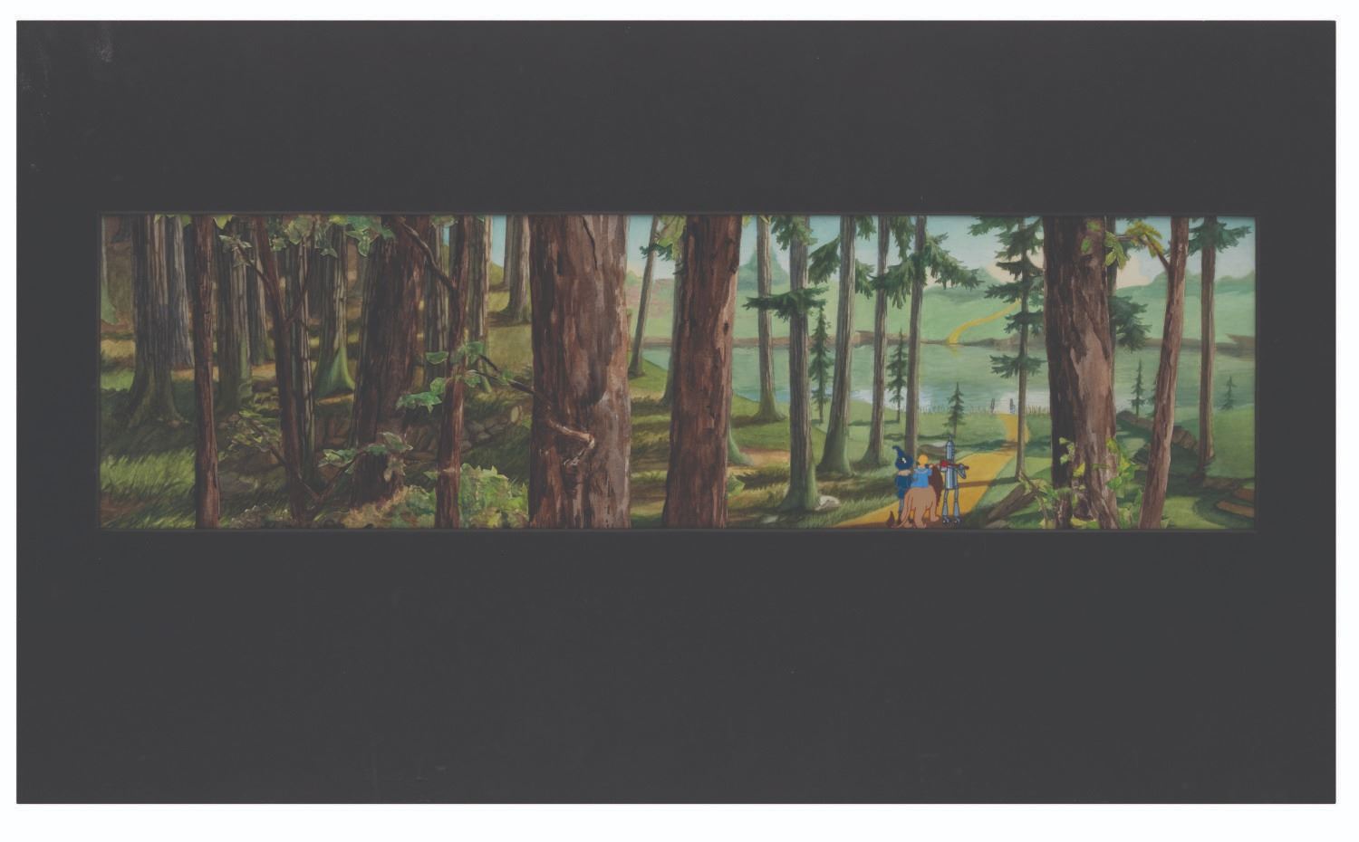 (MacVeigh, 1985) A test cel and background painting featuring Dorothy, Tin Man, Scarecrow, and the Cowardly Lion from The Wizard of Oz by Rob Roy MacVeigh. MacVeigh was an active artist in the Oz fan club, with a dream of producing an animated feature about Oz, true to the original artists and authors of the books. With a visible image size of 6 " x 22 " in a 15 " x 25 " presentation matte, the art displays in very good condition with light handling wear to the matte.