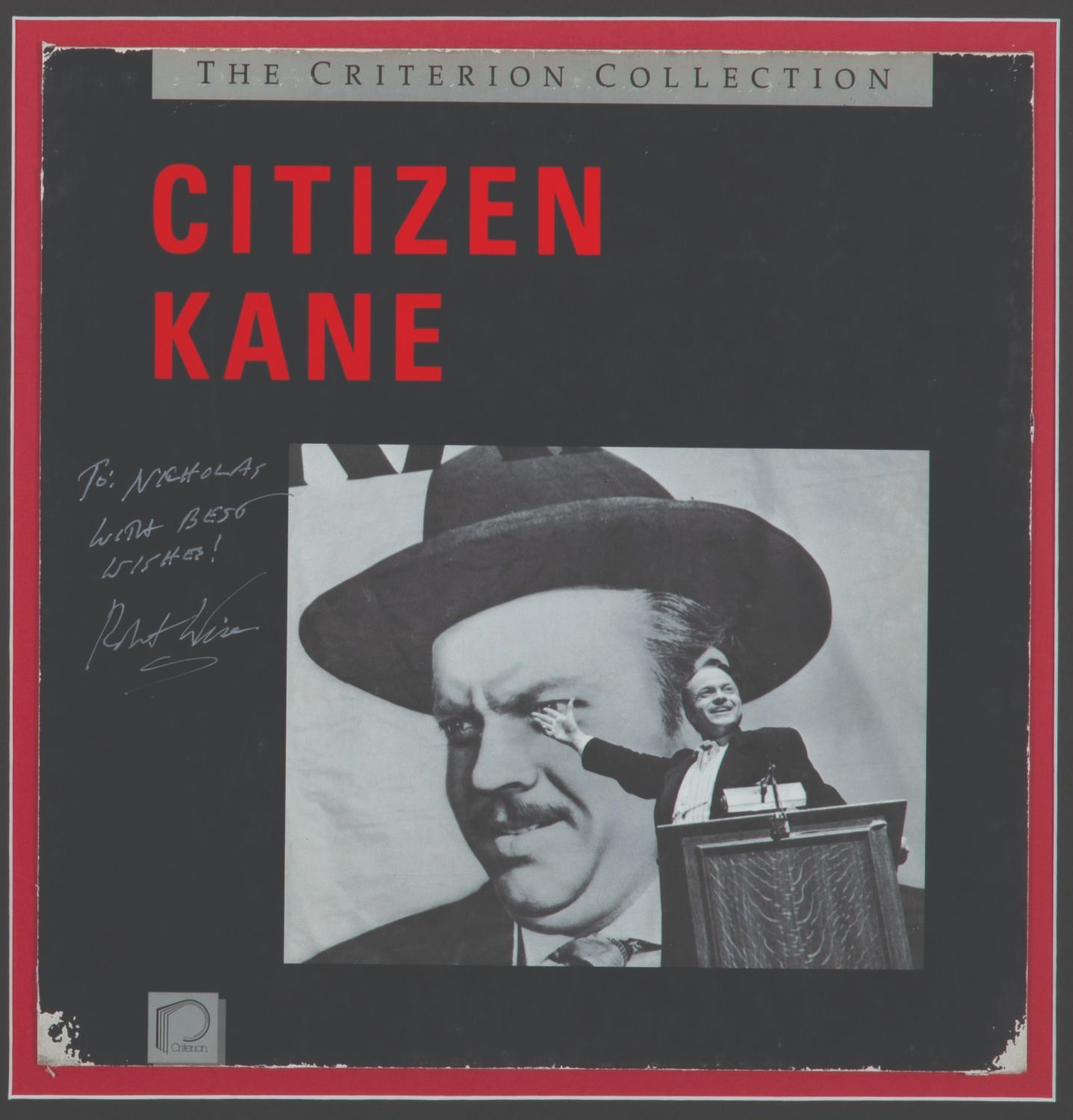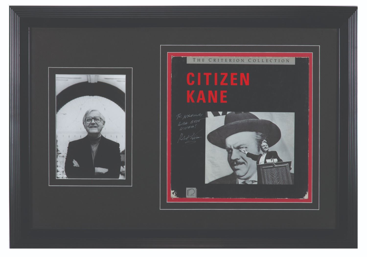 (Robert Wise, 1990s-2000s) A Citizen Kane laser disc cover signed by Robert Wise. Wise was nominated for an Academy Award for editing on Citizen Kane, and also served as director and producer on such iconic American films as West Side Story and The Sound of Music. Measuring 12.25"x12.25", the cover with signature and dedication displays well but is in fair condition, with much edge wear visible, and is presented with a 6.25"x9.25" visible photo of Wise, both in a 21.5"x32.5" very good frame.