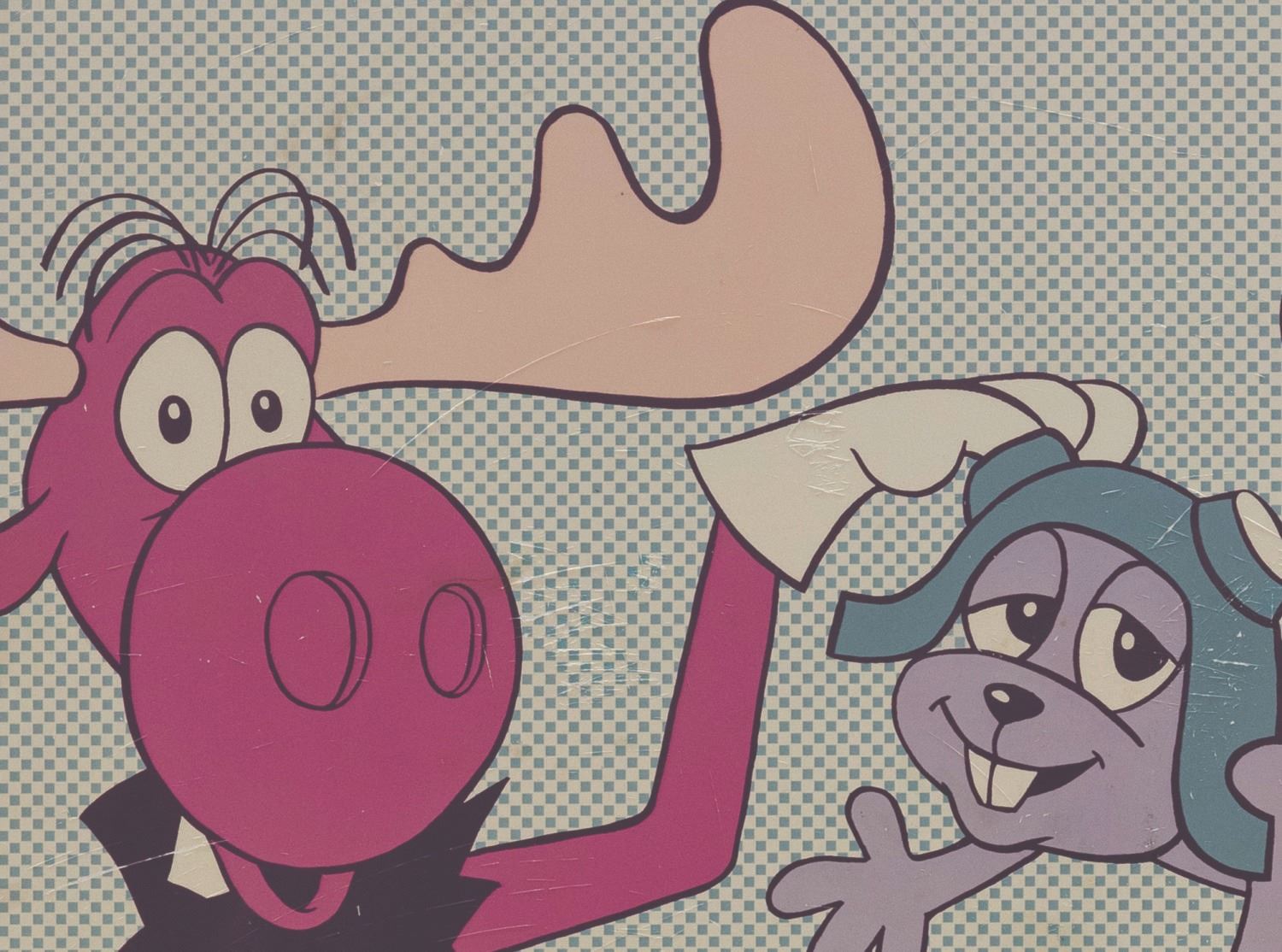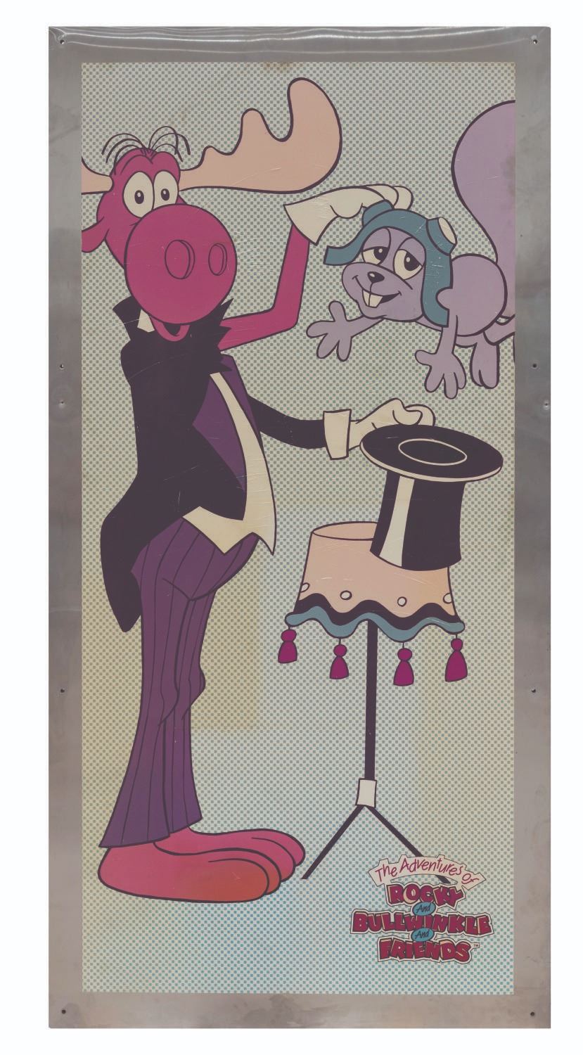 (Ward, 1980s-2000s) A large sign of Rocky and Bullwinkle displayed at Dudley Do-Right’s Emporium in Hollywood. Constructed of metal and wood, the sign measures 77.258” x 39.5” x 1”, and is in good condition with heavy scratches and discoloration from display.
