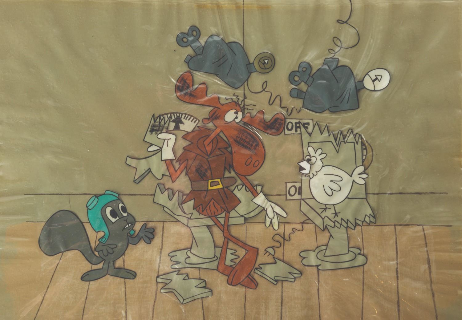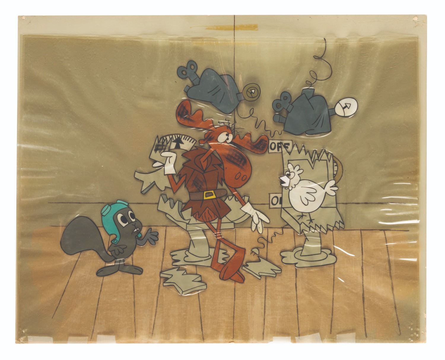 (Ward,1959-64) An extremely rare multi-layer production cel and background from “The Rocky and Bullwinkle Show.” Working with a very small budget per episode, Ward had the show animated in Mexico, and almost no production artwork made it back to the United States. This is one of only a handful of actual production cels to ever surface. With a character image size of 8.5” x 9”, the cel and background have been slightly trimmed to 9" x 12" and are in good condition with some warping to the cel layers, and pinholes and edge wear to the background from production use.