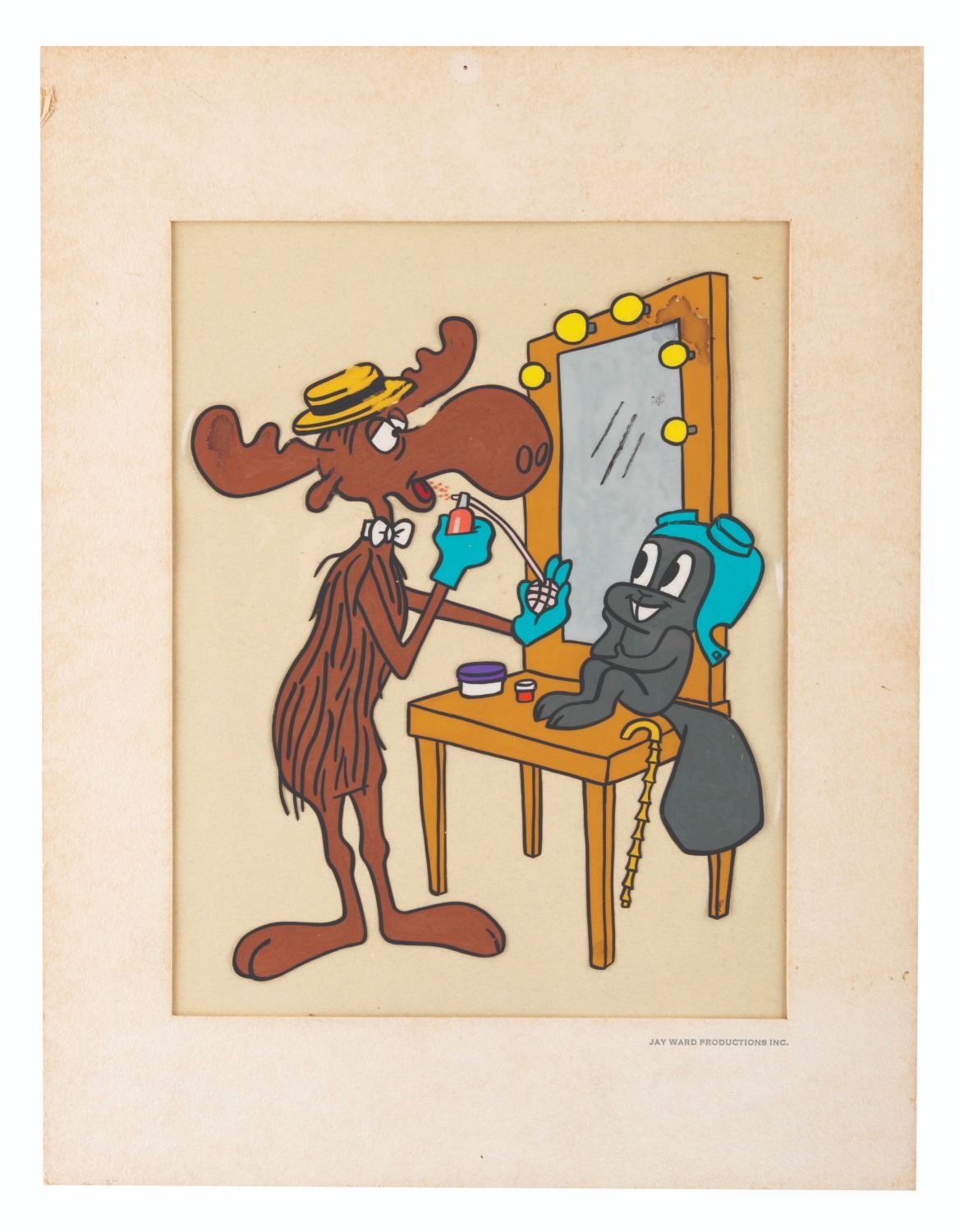 (Ward, 1961) A hand-painted publicity cel for Rocky and Bullwinkle’s move from ABC to NBC. Disappointed with how little ABC had done to promote the series, Ward decided to publicize it himself, through “Operation Loudmouth” and promotional art like this. The cel has a character size of 8” x 6.5” on the 9” x 7” visible cel in the original 10” x 13” matte inscribed “Jay Ward Productions Inc.” The piece displays in fair condition with wear to the matte from age, line loss mainly in Bullwinkle’s hat, and paint lifting in the mirror frame, Rocky’s tail, and Bullwinkle’s antler.