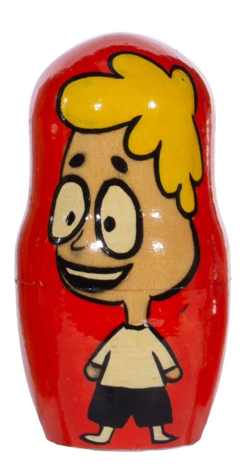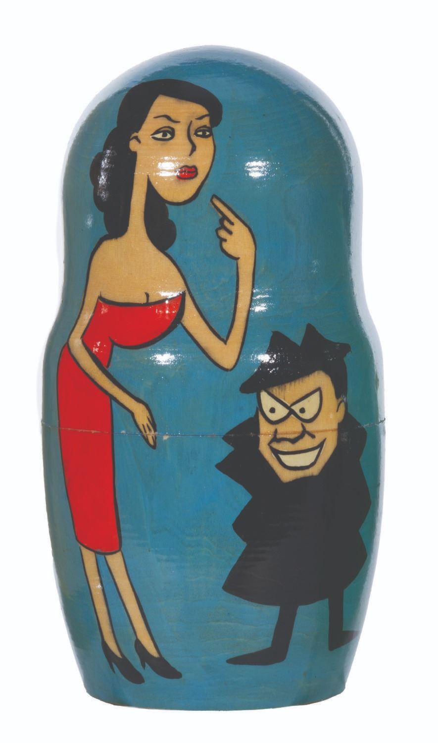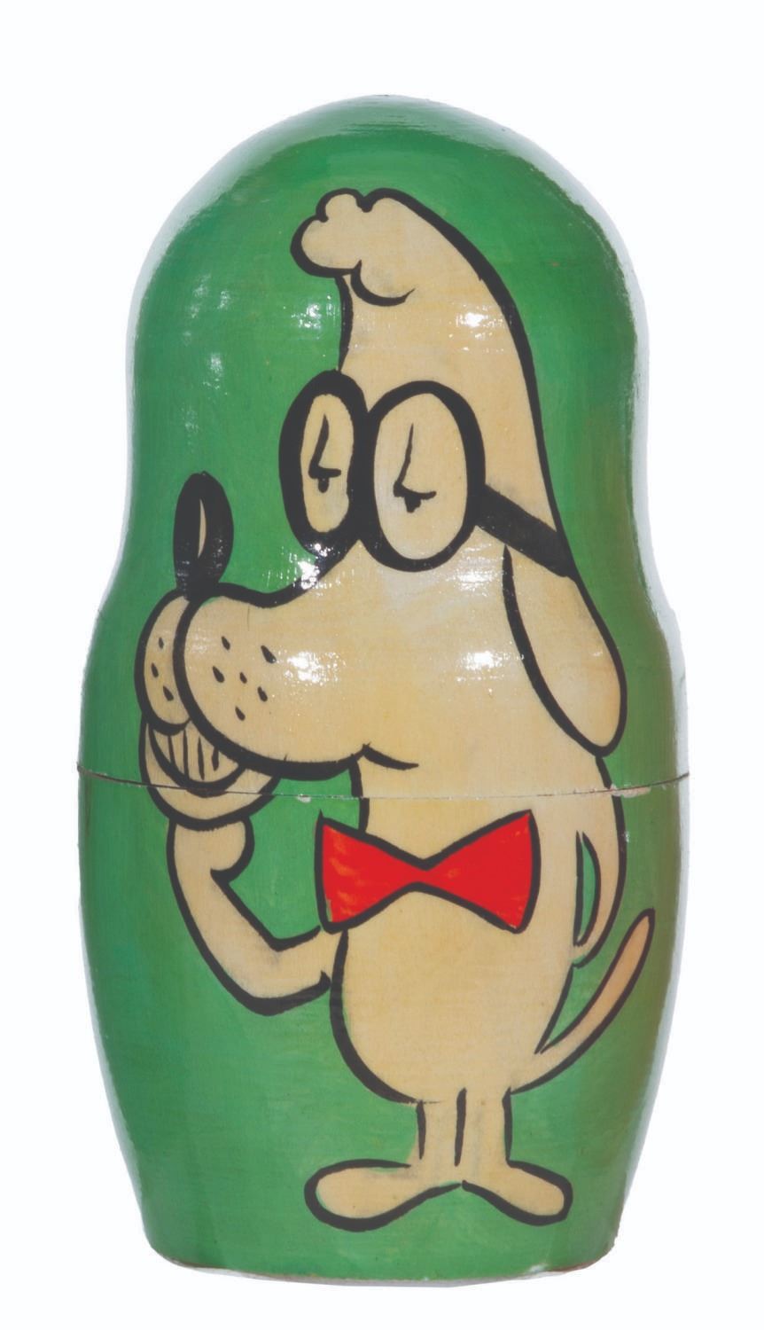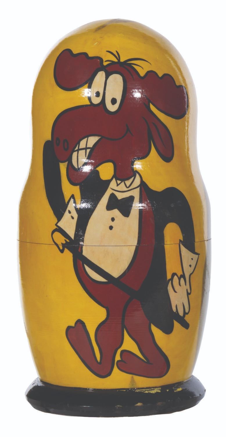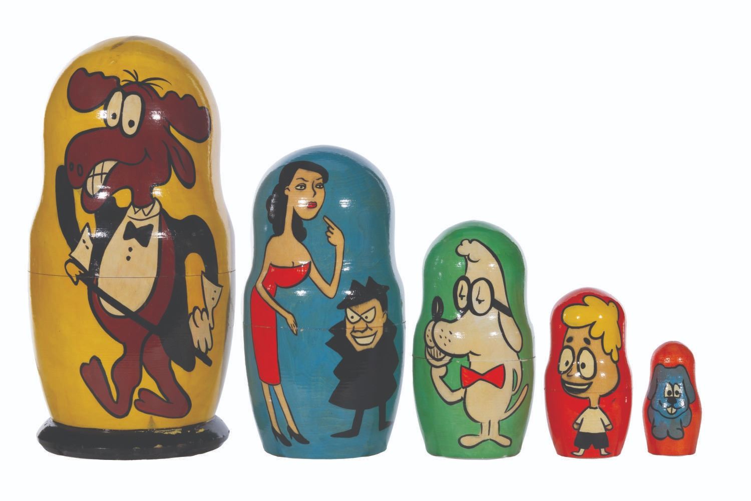 (Ward, 1960s-80s) A hand-made and painted Russian Matryoshka Nesting Doll, featuring Bullwinkle, Boris and Natasha, Mr. Peabody, Sherman, and Rocky as the smallest of the five dolls. Measuring 3” in diameter x 6.5” tall, the inner dolls are in fine condition, with the largest Bullwinkle doll very good with a small stain and light wear.
