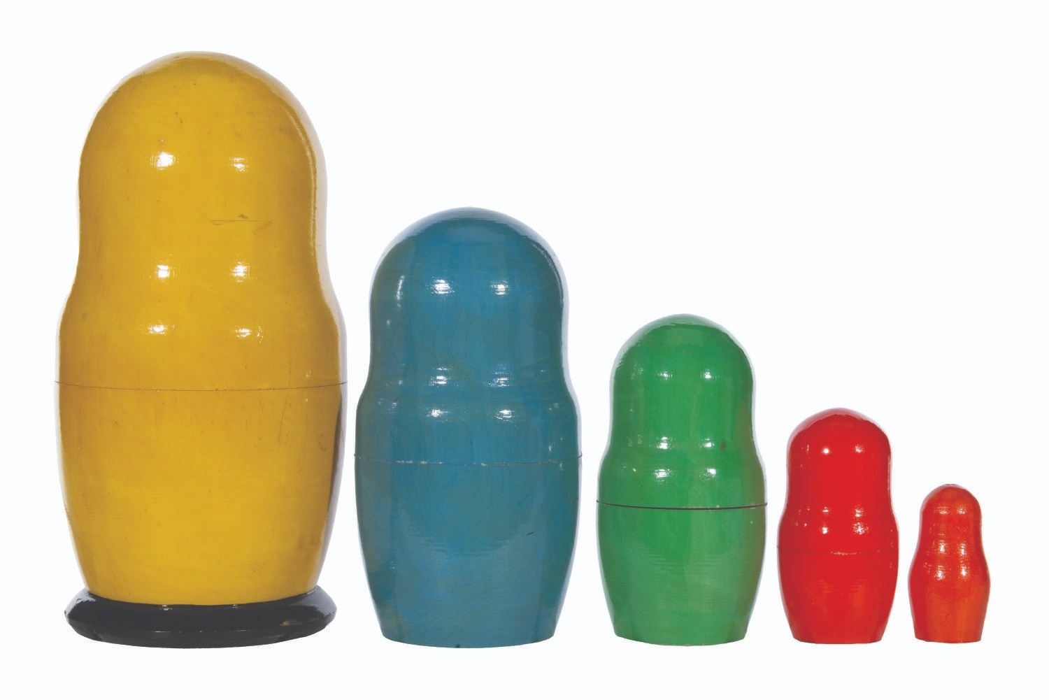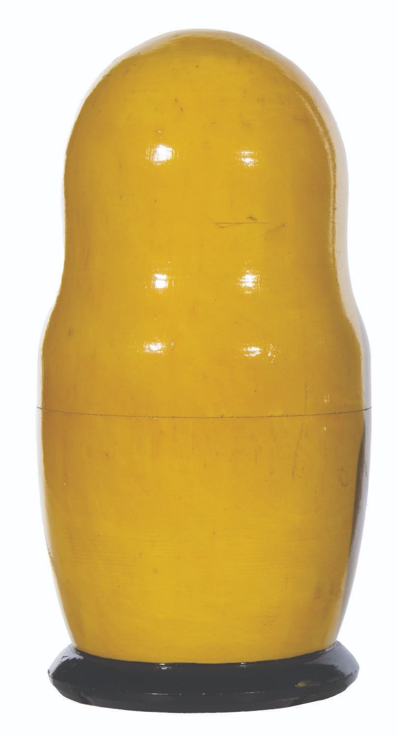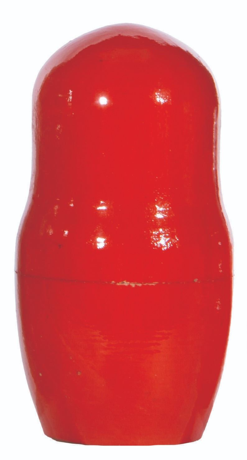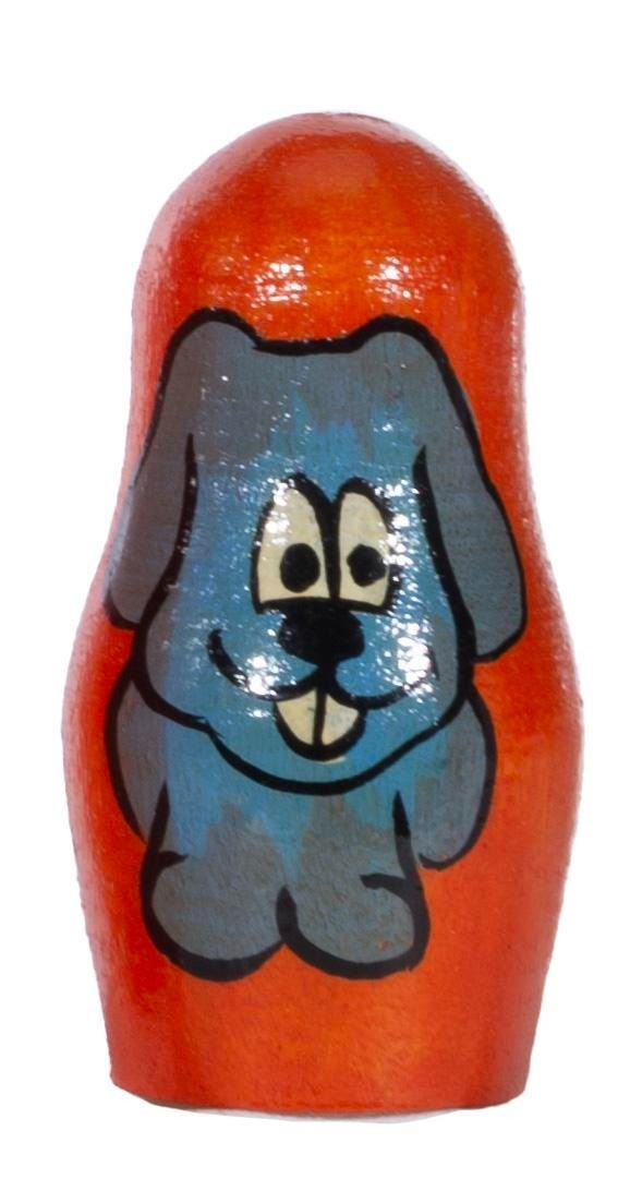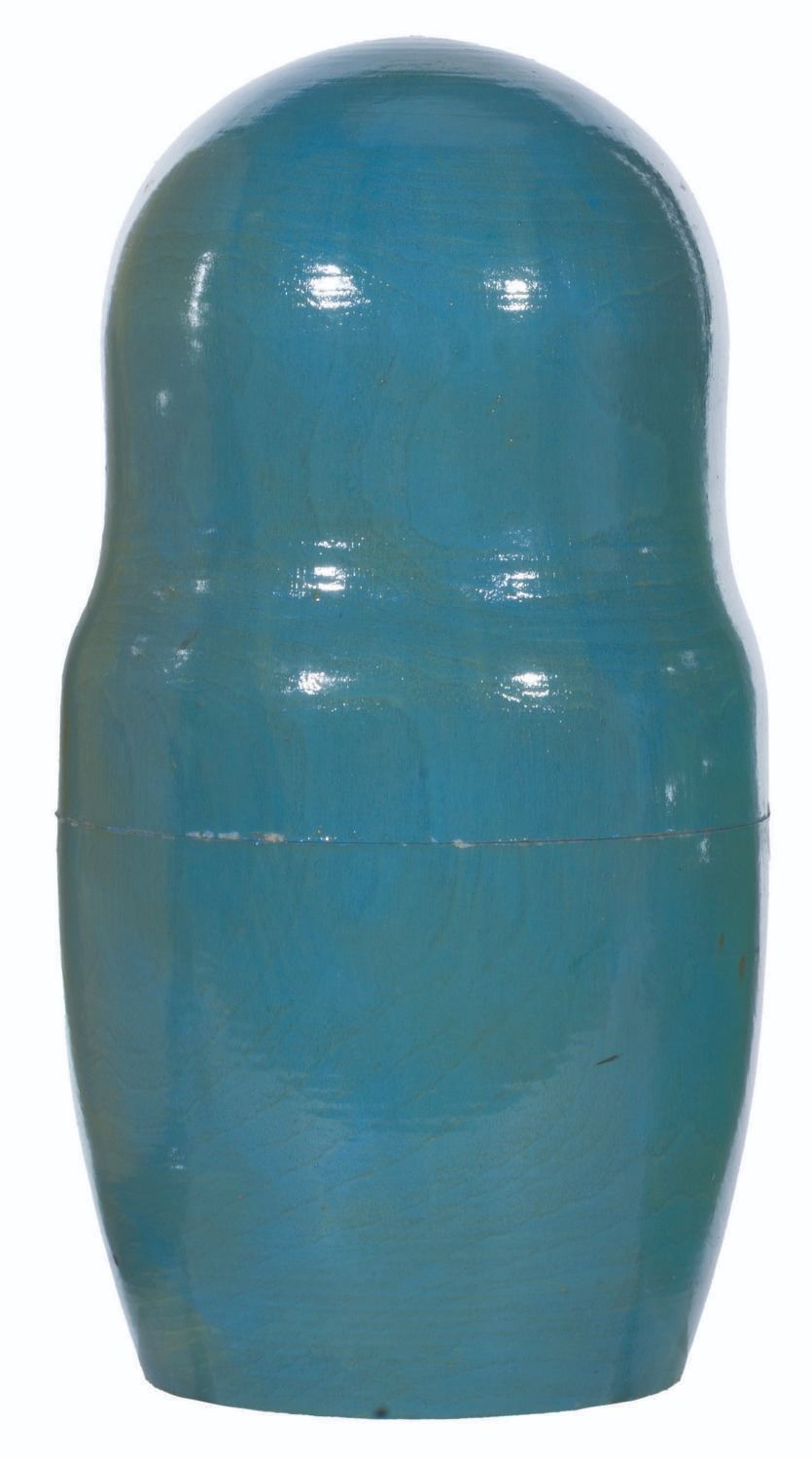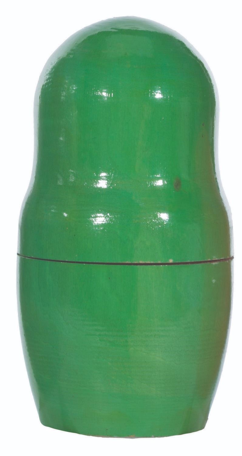 (Ward, 1960s-80s) A hand-made and painted Russian Matryoshka Nesting Doll, featuring Bullwinkle, Boris and Natasha, Mr. Peabody, Sherman, and Rocky as the smallest of the five dolls. Measuring 3” in diameter x 6.5” tall, the inner dolls are in fine condition, with the largest Bullwinkle doll very good with a small stain and light wear.