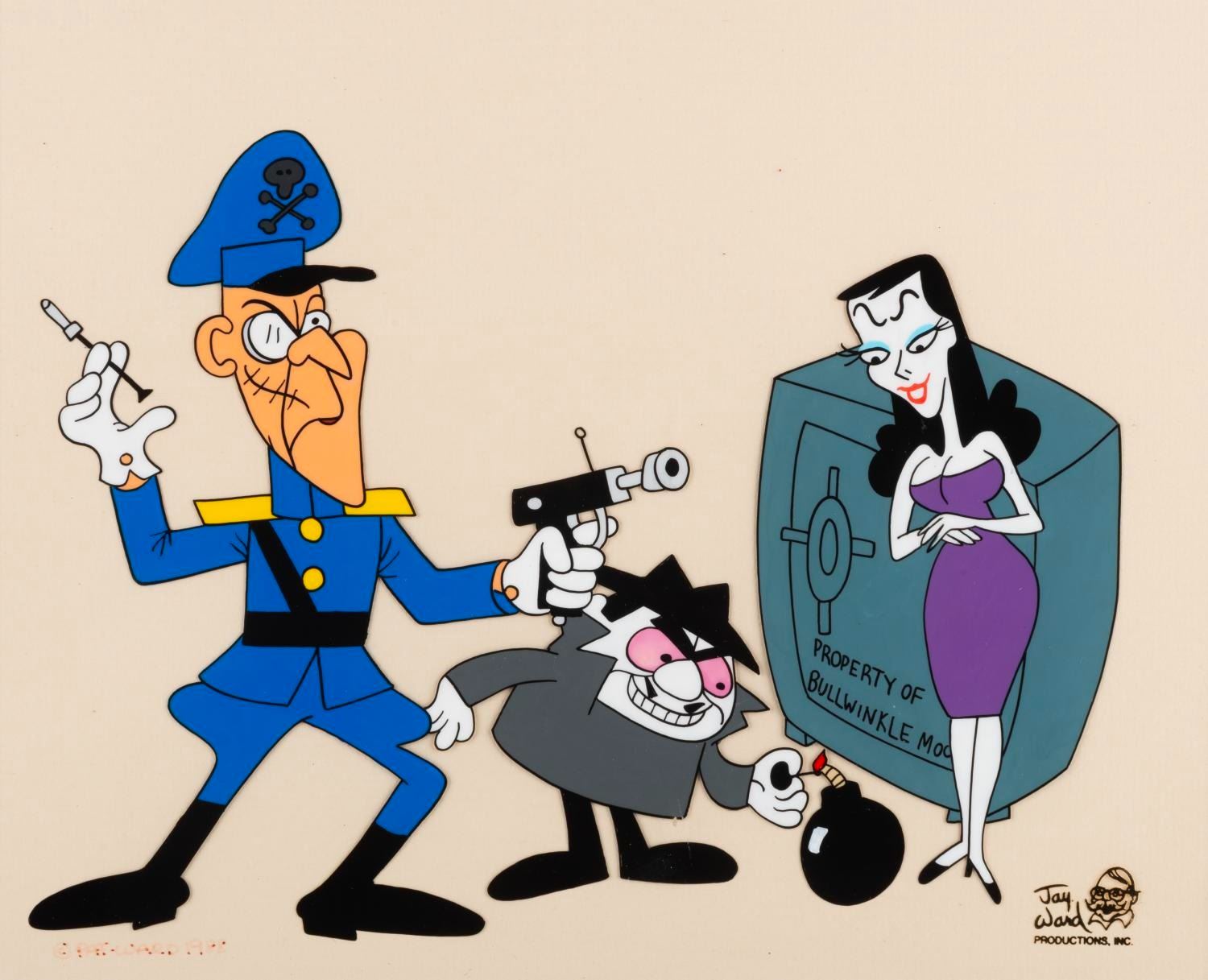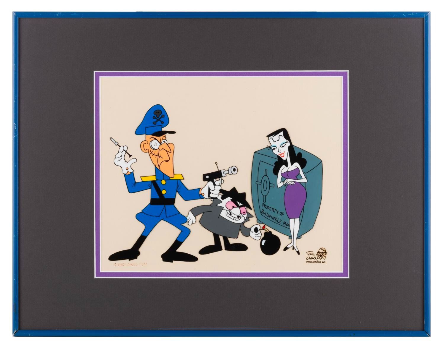 (Ward, 1989) Scene Cel #28 in the Jay Ward Productions Original Animation Scene Cels Collection, featuring Fearless Leader, Boris Badenov, and Natasha Fatale from "The Rocky and Bullwinkle Show," signed by Jay Ward’s widow, Pat Ward, in black ink. With an image size measuring 7" x 9.25" on an 8.5" x 10.5" visible cel in a 14" x 18" matte, the piece is in very good condition with fading to the signature.