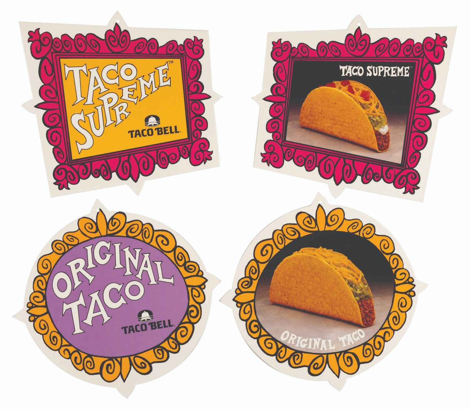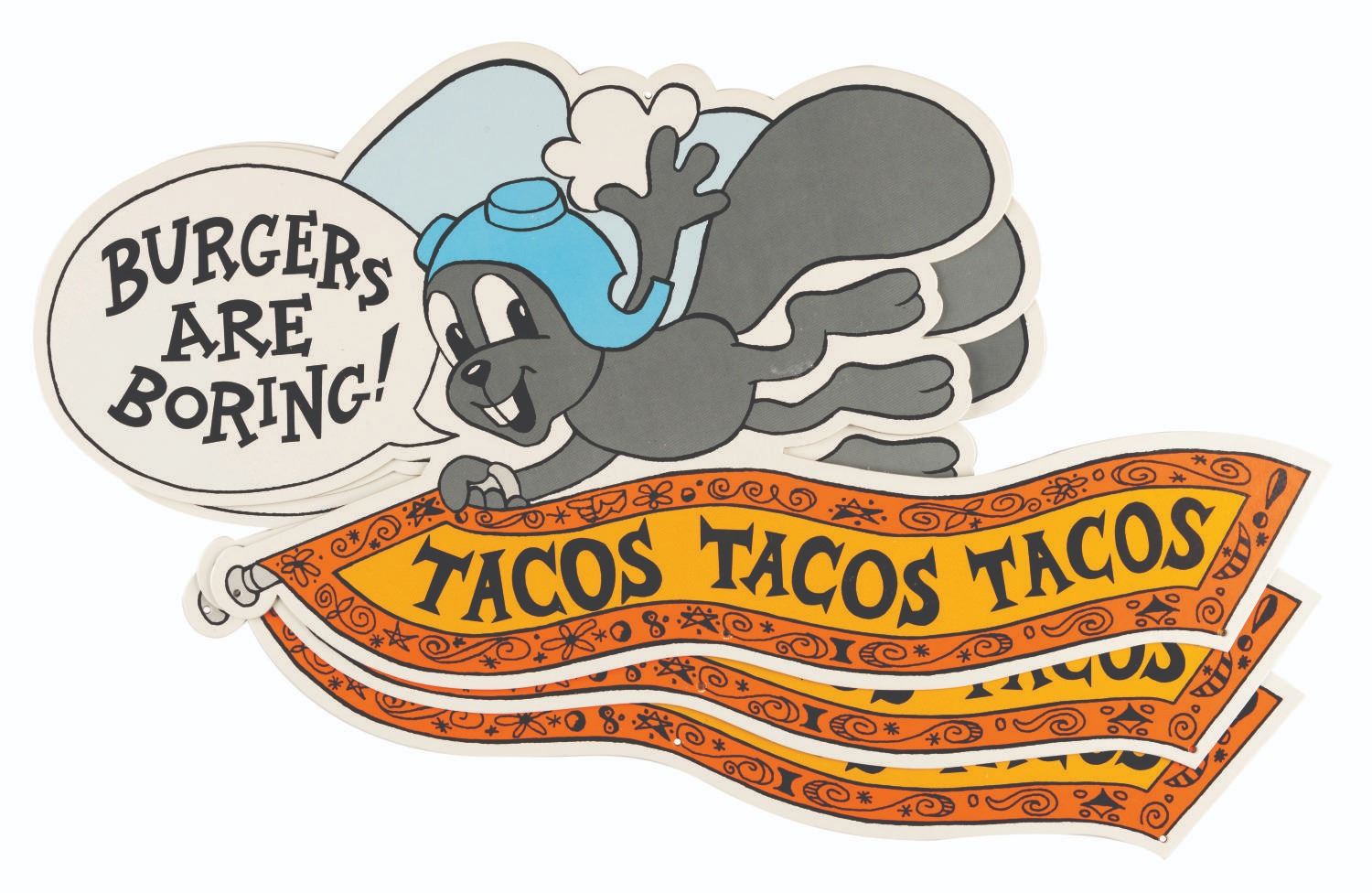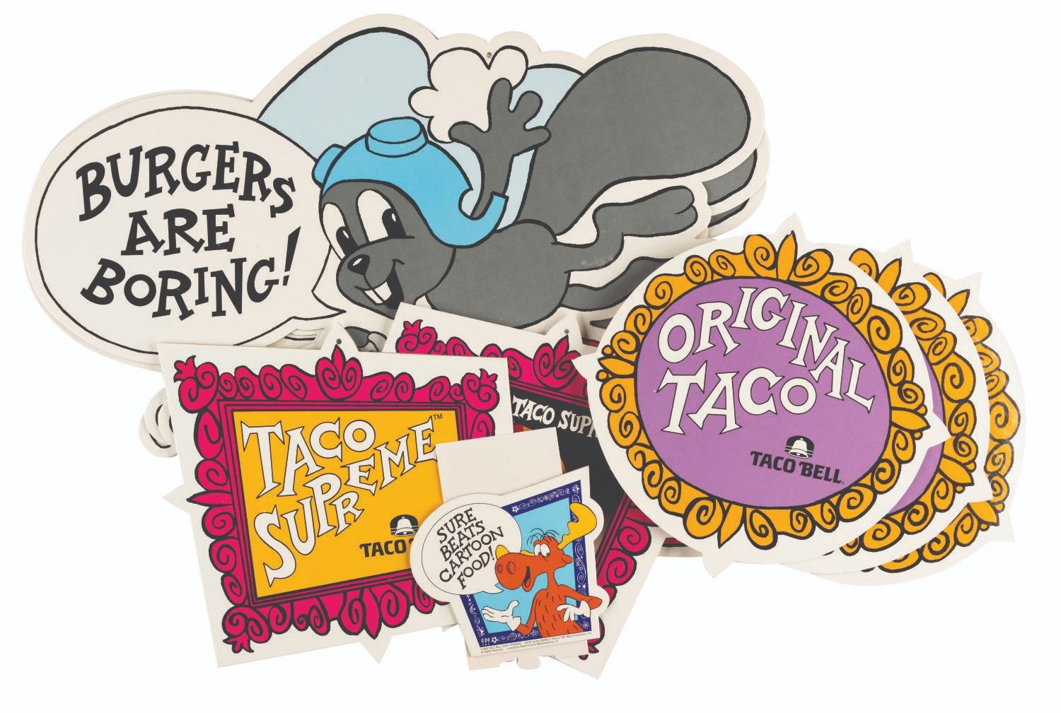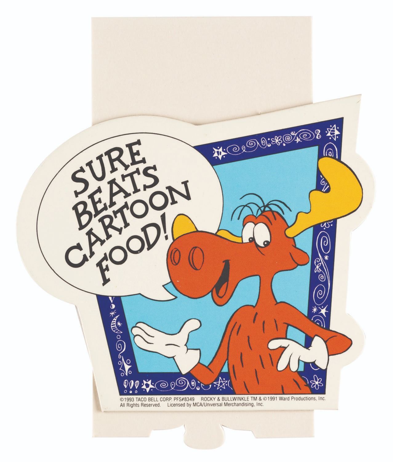 (Taco Bell, 1993) A store display kit from a Rocky and Bullwinkle promotional partnership with Taco Bell. Included are two large “Moose-Sized Crunch” standees, a small Bullwinkle “Sure beats cartoon food” standee, two Bullwinkle antler signs, three Rocky “Burgers are boring” signs, four Big Beef Taco signs, two Taco Supreme signs, three Original Taco signs, a split plastic display referencing a 1964 “Rocky and Bullwinkle” Butte, Montana/Washington, D.C. storyline, and a bag of hooks. Ranging in size from 4.25” x 5” to 6.5” x 25”, the display items are in very good to fine condition with light wear, creases, and tape residue on the reverse from use.