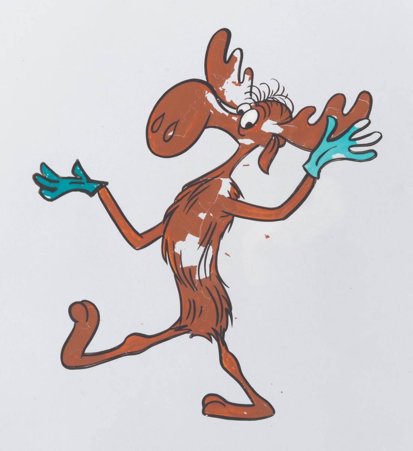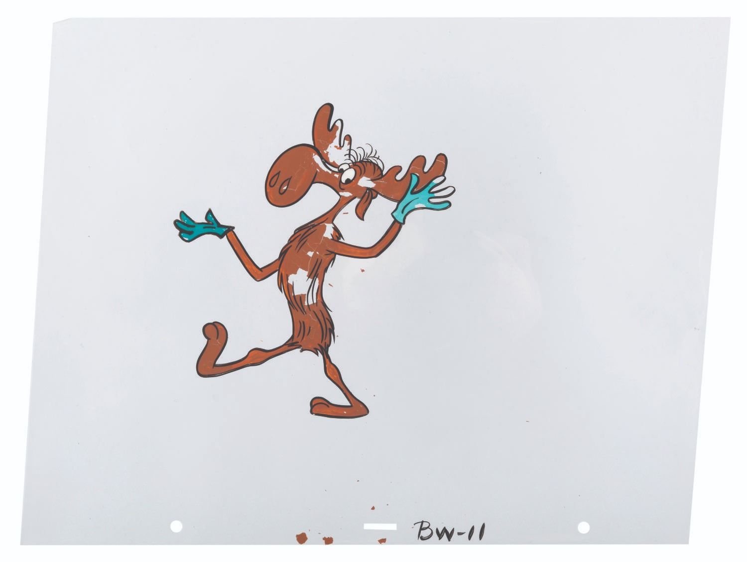 (Ward, 1960) An original hand-painted production cel of Bullwinkle J. Moose from the opening credits of “Rocky and His Friends.” With an image size of 3.5” x 6.25” on a 10.5” x 13.5” trimmed cel, the art displays in fair condition with heavy paint loss, paint chips, scratches, and edge wear.