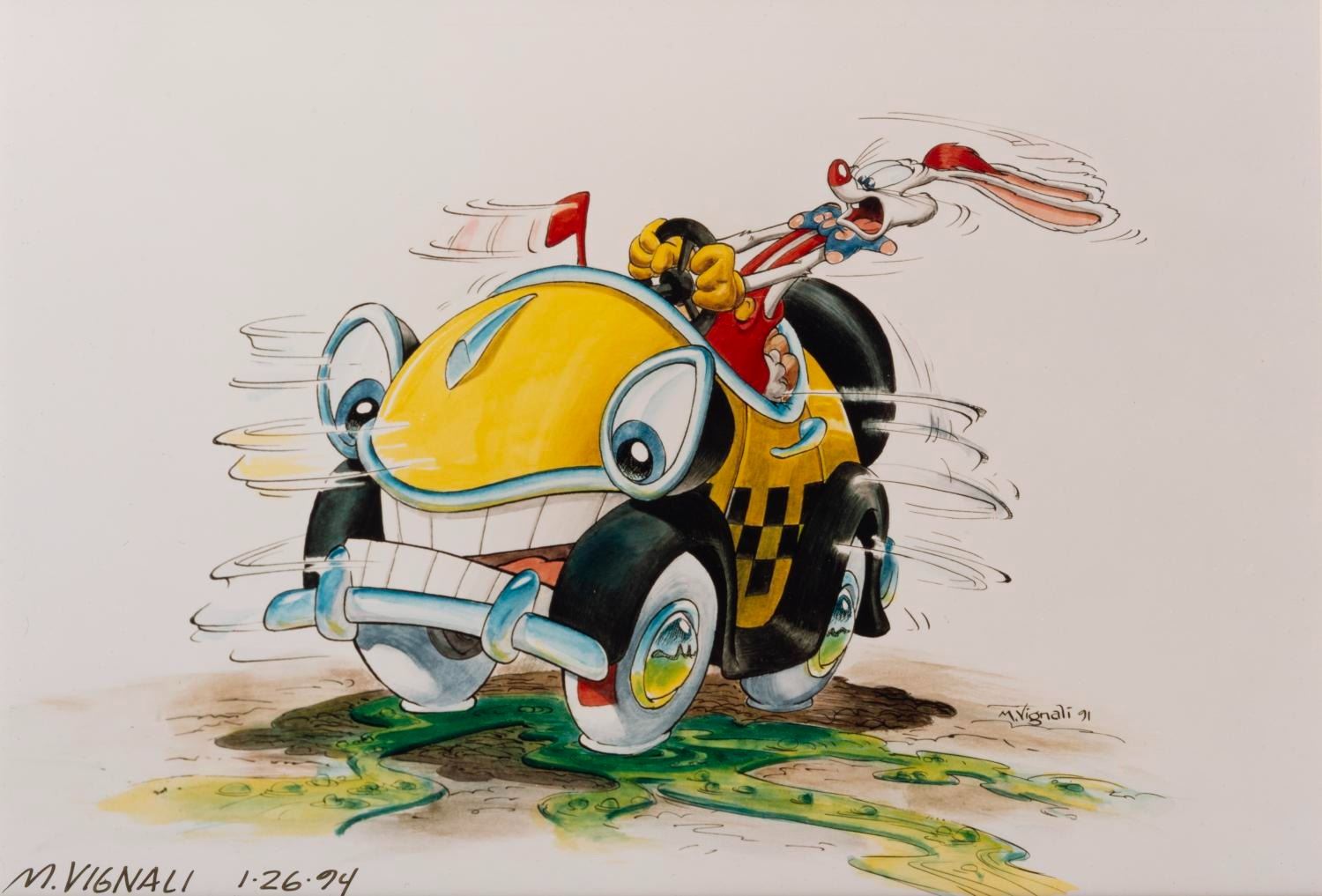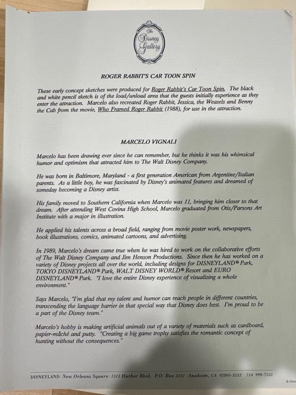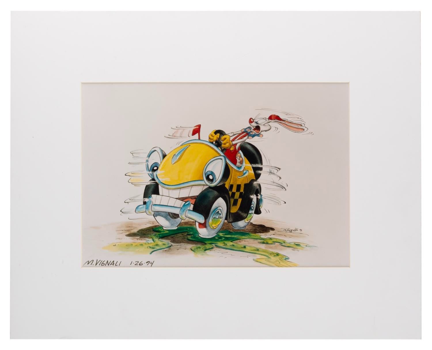 (Disneyland, 1994) A print of concept art for Roger Rabbit’s Car Toon Spin at Disneyland. Featuring Benny the Cab and Roger, the print was created for a special Toontown event at the Disney Gallery and has been signed by the artist Marcelo Vignali. Measuring 9" x 13" visible in a 16" x 20" matte, the print is in fine condition, while the matte exhibits light discoloration, edge wear, and dents from handling.