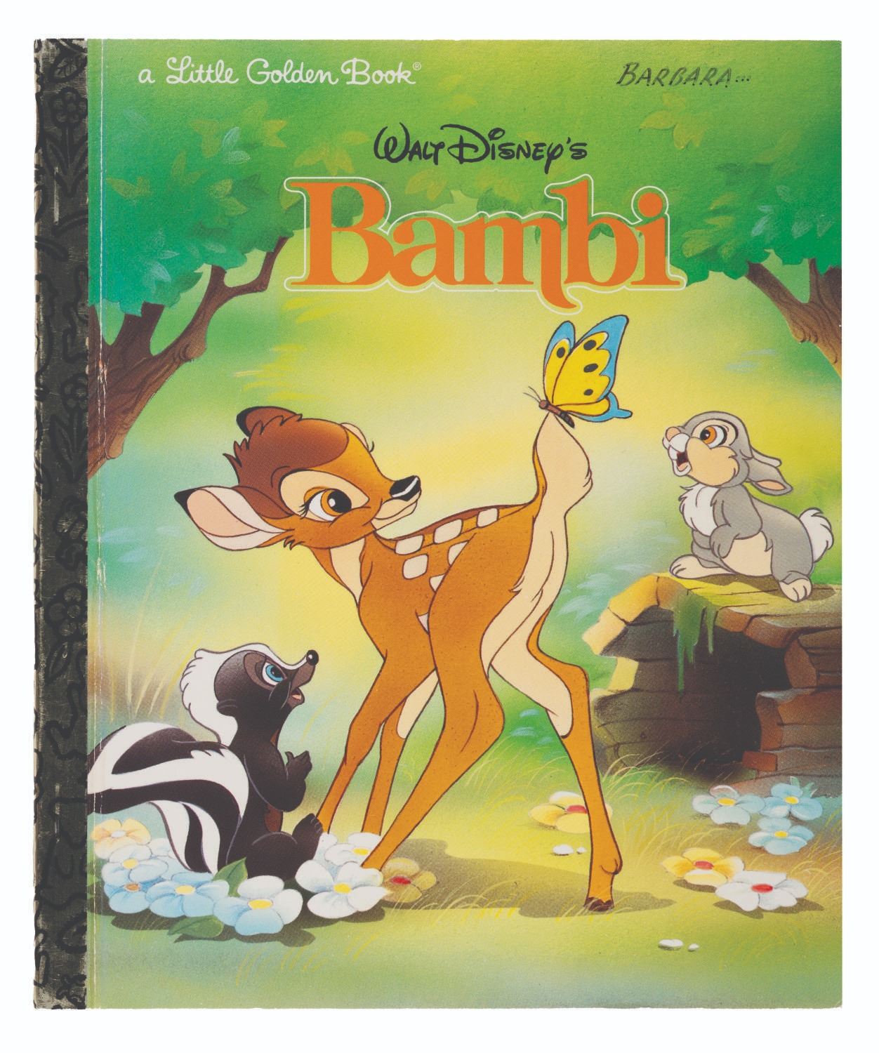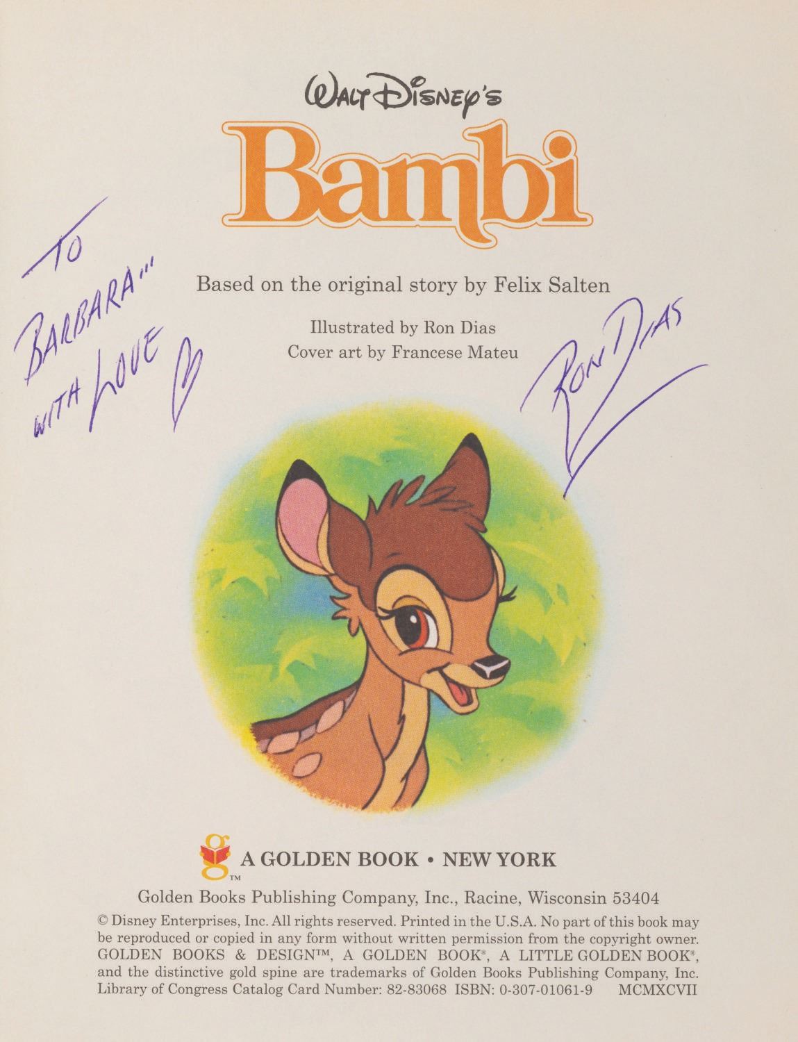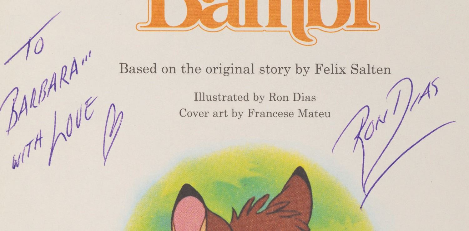 (Golden Books, 1948) A Walt Disney's "Bambi" Little Golden Book signed by Ron Dias who illustrated the book. The personalized inscription on the title page reads, "To Barbara with Love" in blue ink. Measuring 6.75" x 8", the book is in very good condition with light edge wear and an inscription of "Barbara..." on the cover, and an expected crease at the spine from use.