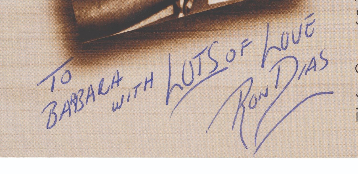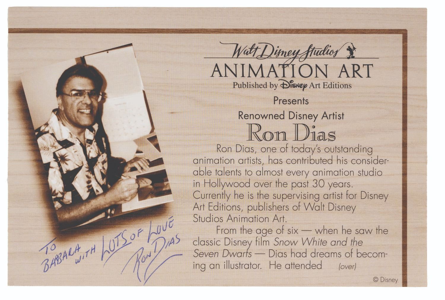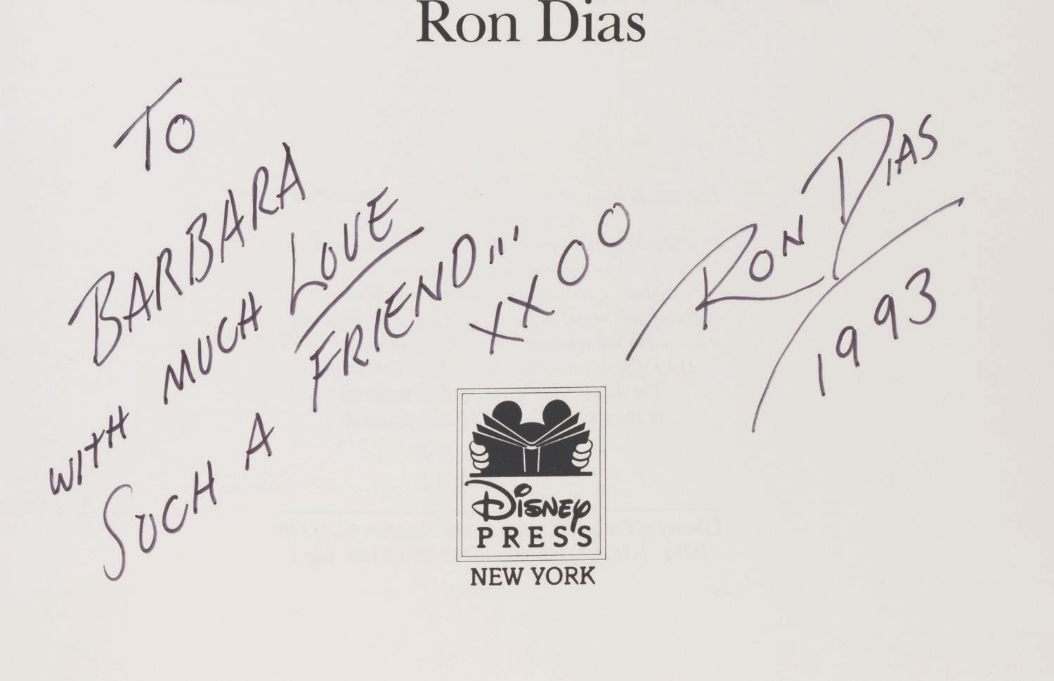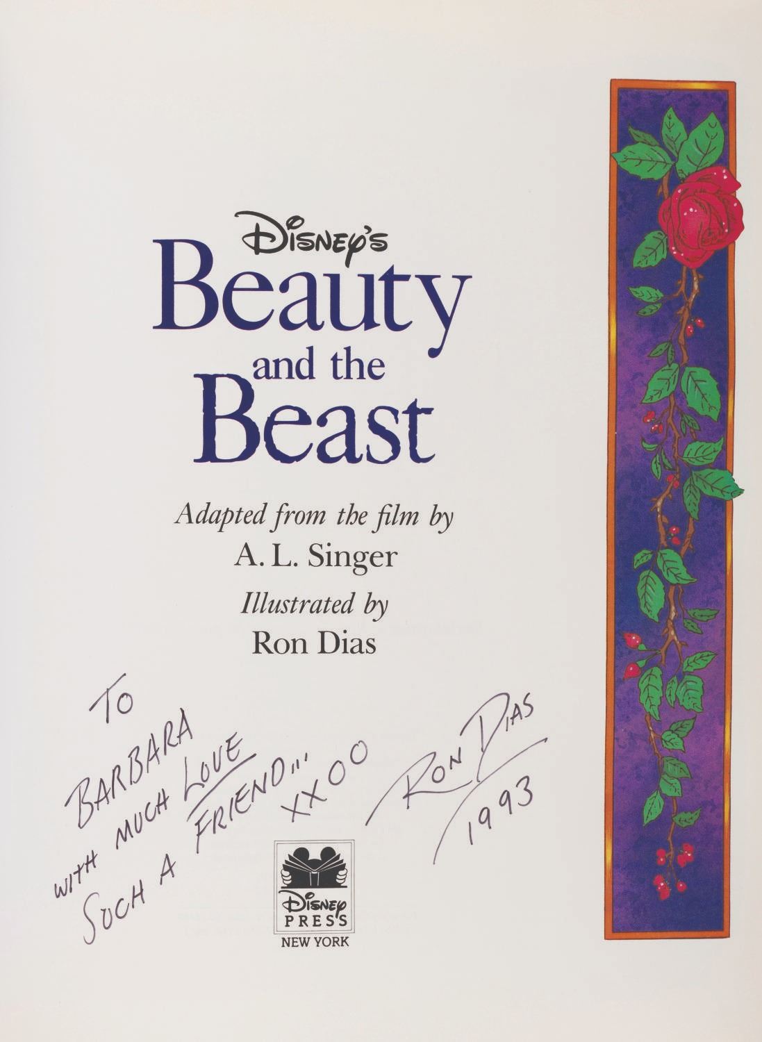 (Disney, 1991/1993) A hardcover Disney's Beauty and the Beast storybook signed with a personal dedication by the illustrator Ron Dias. Dias is best known for his work as an animator for many Disney animated projects including "Beauty and the Beast." The lot includes an additional Dias 6” x 9” bio card signed by the artist with another personalized dedication. Measuring 8.25” x 10.25”, the book displays in very good condition with light scratches, discoloration, and wear on the cover.