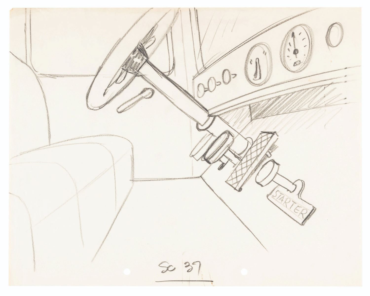 (Schlesinger, 1937) A rough layout sketch of an automobile interior from “Porky’s Super Service.” Measuring 9.5” x 12”, the sketch accomplished in pencil is in very good condition with light wear typical of production use.