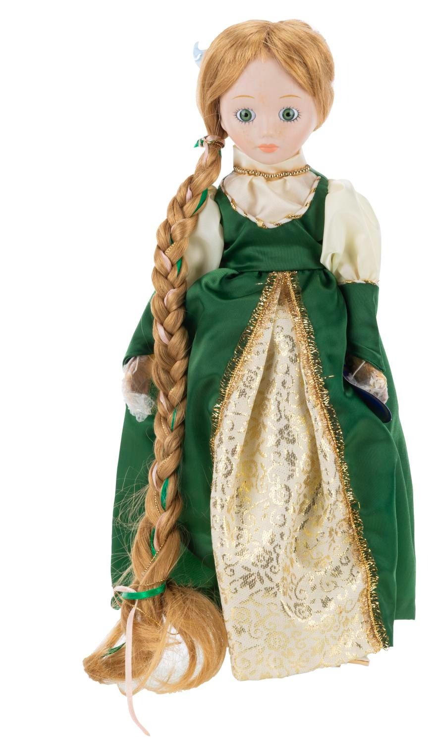 (Royal Heirloom Collection, 1980s-90s) A porcelain Rapunzel doll, with the original box. Measuring 14" tall, the doll is in very good condition with light wear from aging including discoloration and spotting to her shoes.