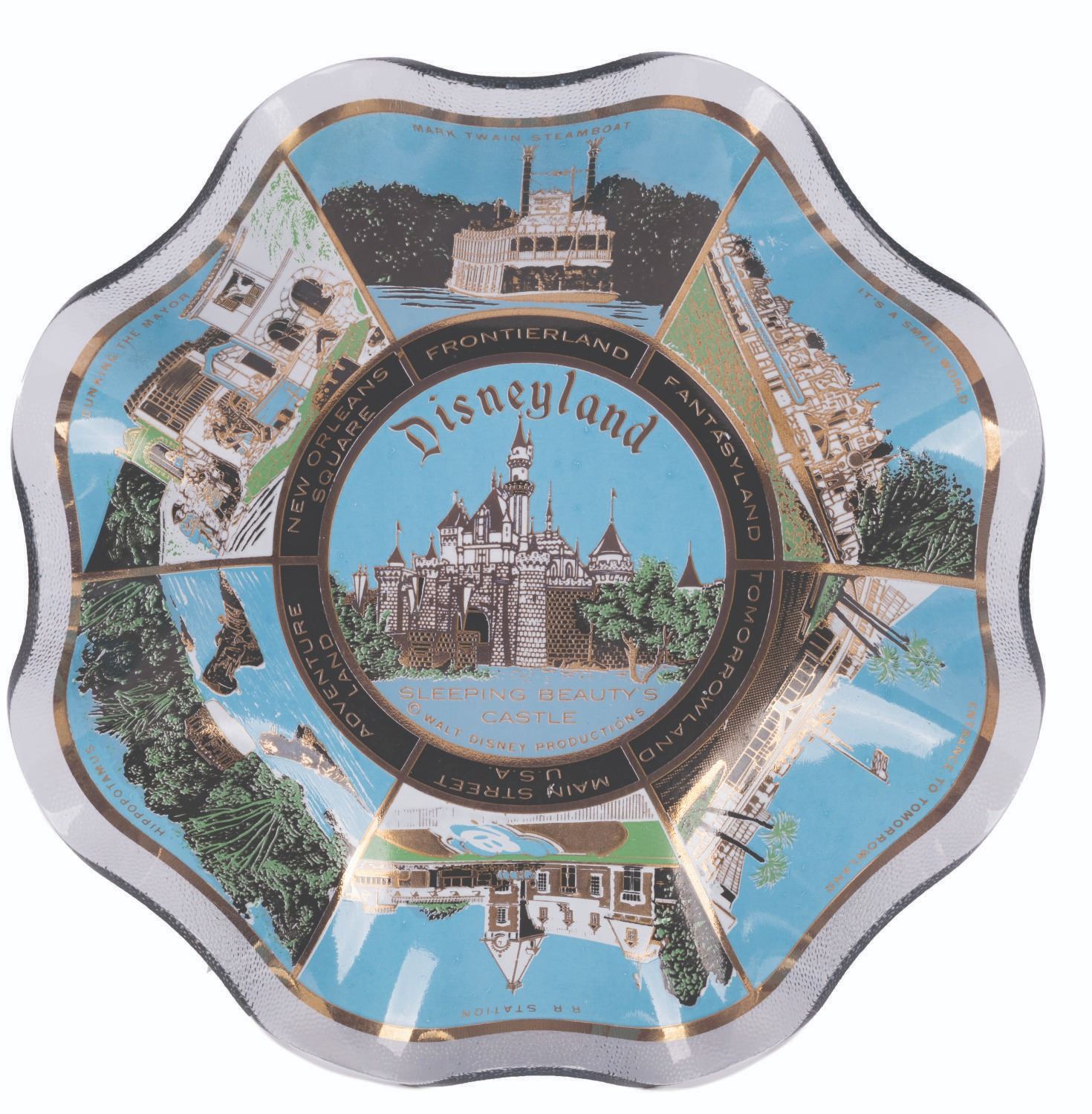 (Houze Art, 1960s-70s) A ruffled glass souvenir dish featuring the “lands” within Disneyland. Measuring 7.5" in diameter, this glass dish is in very good condition with scuffs and light wear.