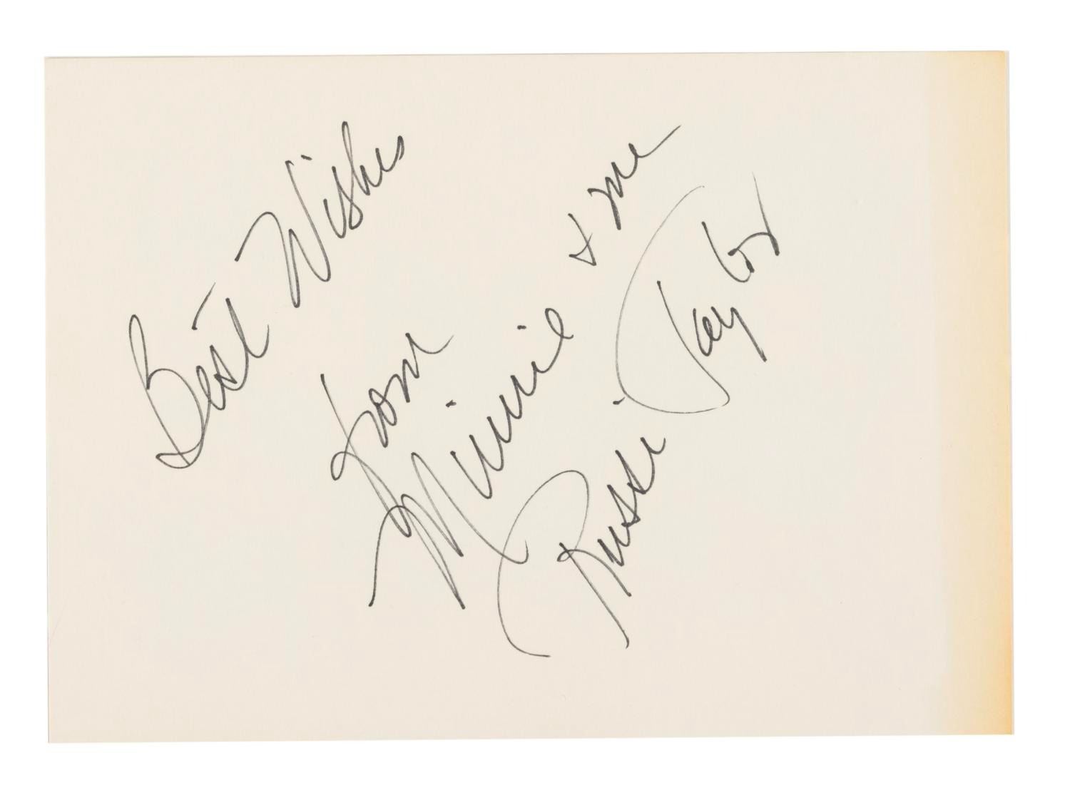 (Disney, 1995) A card signed by Russi Taylor, the voice of Minnie, at the 1995 Disneyana Convention. Along with her husband, Wayne Allwine, who voiced Mickey Mouse for 32 years, Russi was the official voice of Minnie from 1986-2019. Measuring 5" x 7", the card is in fine condition.