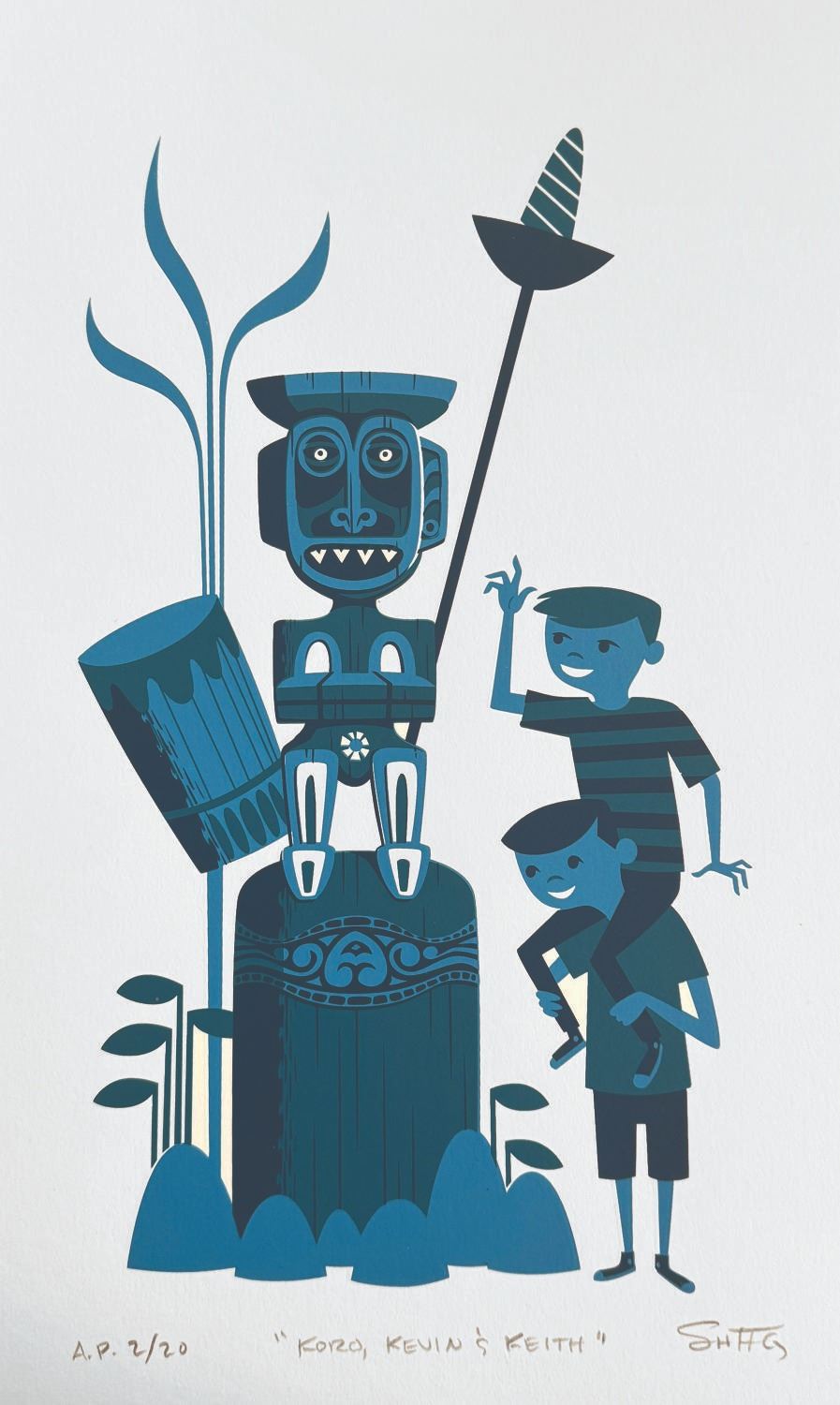 (Disneyland, 2013) A signed "Koro, Kevin, and Keith " print by SHAG released for the 50th anniversary of Walt Disney’s Enchanted Tiki Room. SHAG signed the bottom right of the artist’s proof numbered 2 of only 20. Measuring 8 " x 14 ", the print is in fine condition.