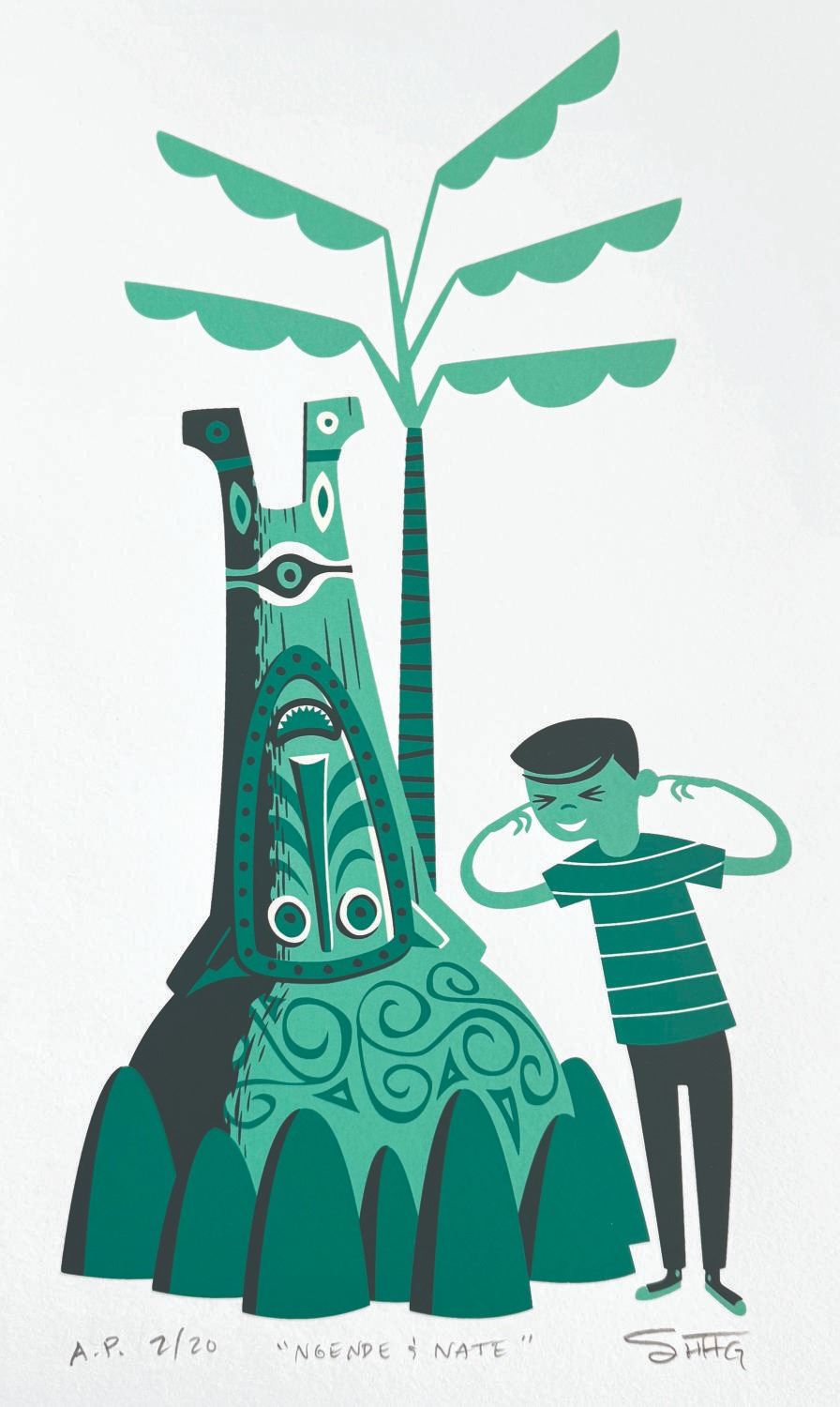 (Disneyland, 2013) A signed "Ngende and Nate " print by SHAG for the 50th anniversary of Walt Disney’s Enchanted Tiki Room. SHAG signed the bottom right of the artist’s proof, numbered 2 of only 20. Measuring 8 " x 14 ", the print is in fine condition.