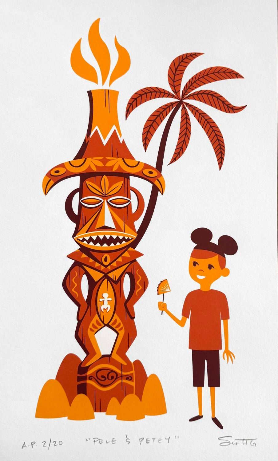 (Disneyland, 2013) A signed"Pele and Petey" print by SHAG for the 50th anniversary of Walt Disney’s Enchanted Tiki Room. SHAG signed the bottom right of the artist’s proof, numbered 2 of only 20. Measuring 8" x 14", the print is in fine condition.